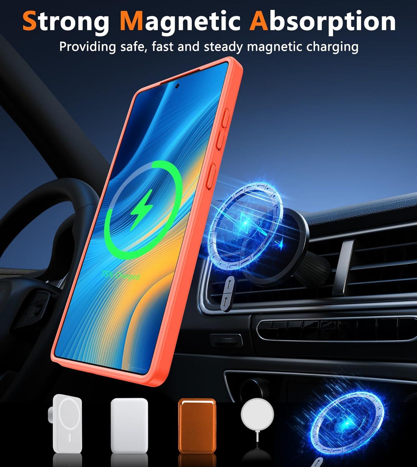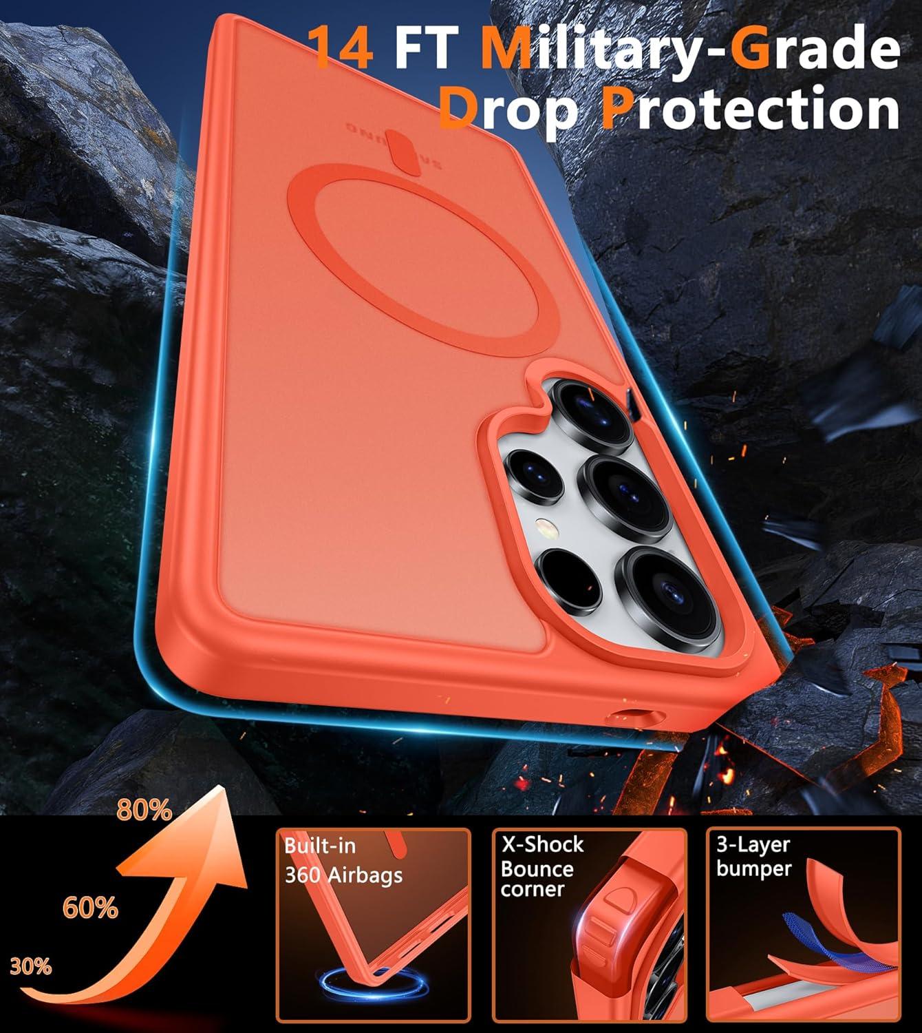 • FNTCASE for Samsung Galaxy S25 Case: Magnetic Matte Textured Military Grade Drop Protection Translucent Cell Phone Cover – Slim Rugged Durable Shockproof Protective Bumper Cases- 6.2 inches(Black)(Orange)