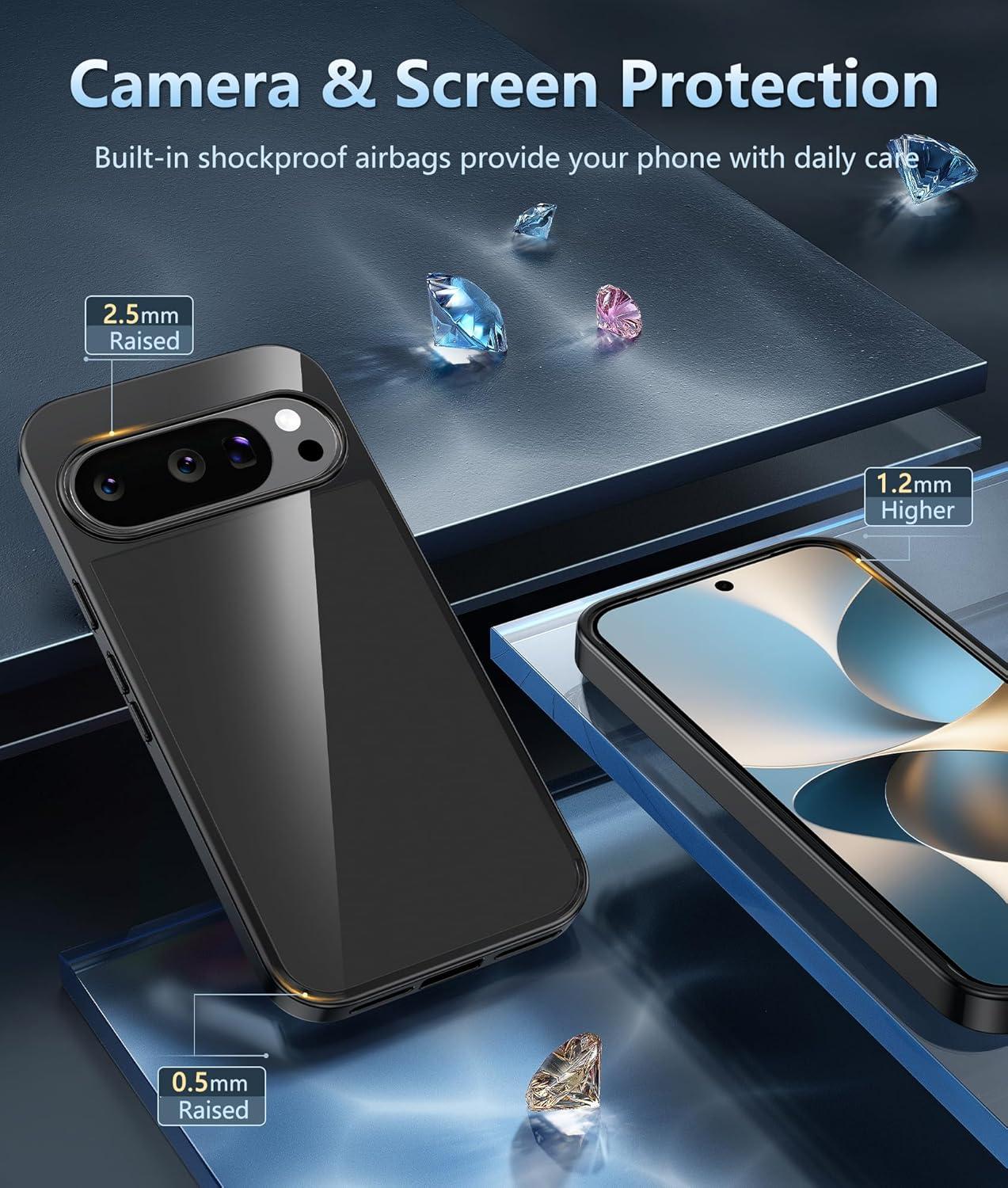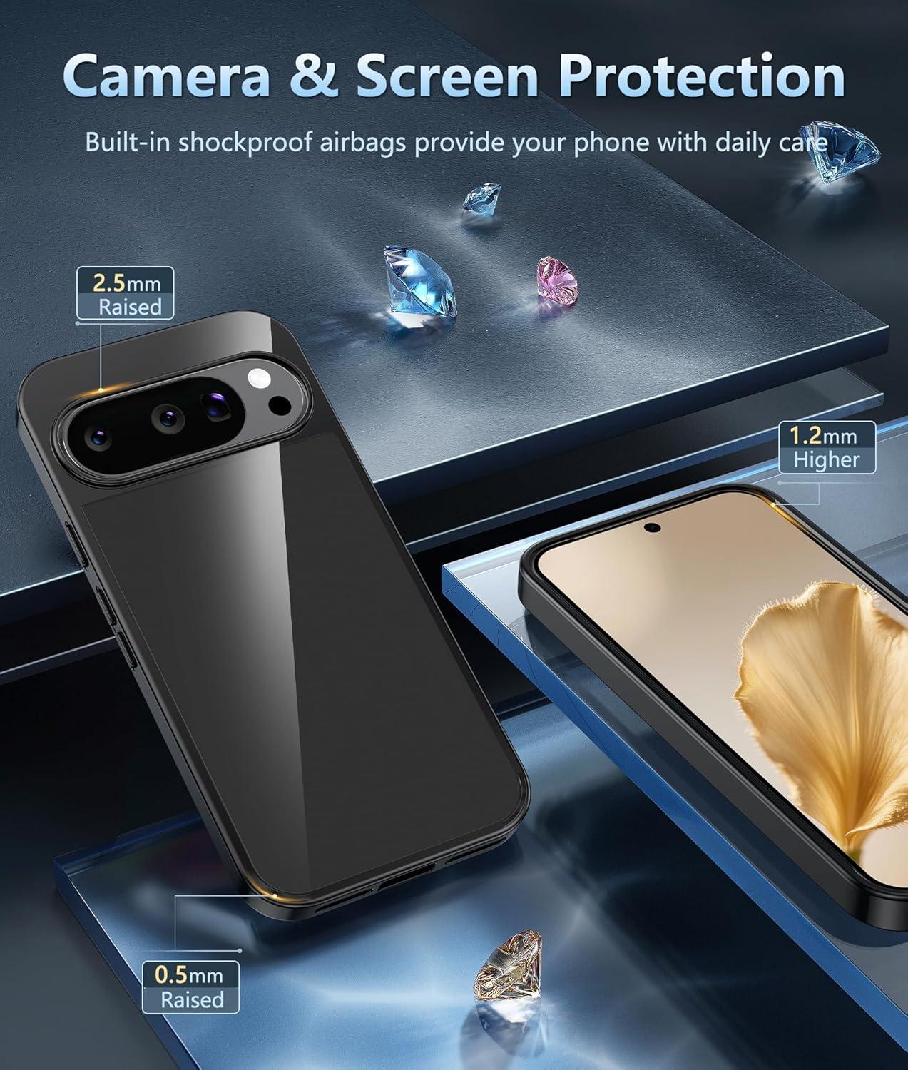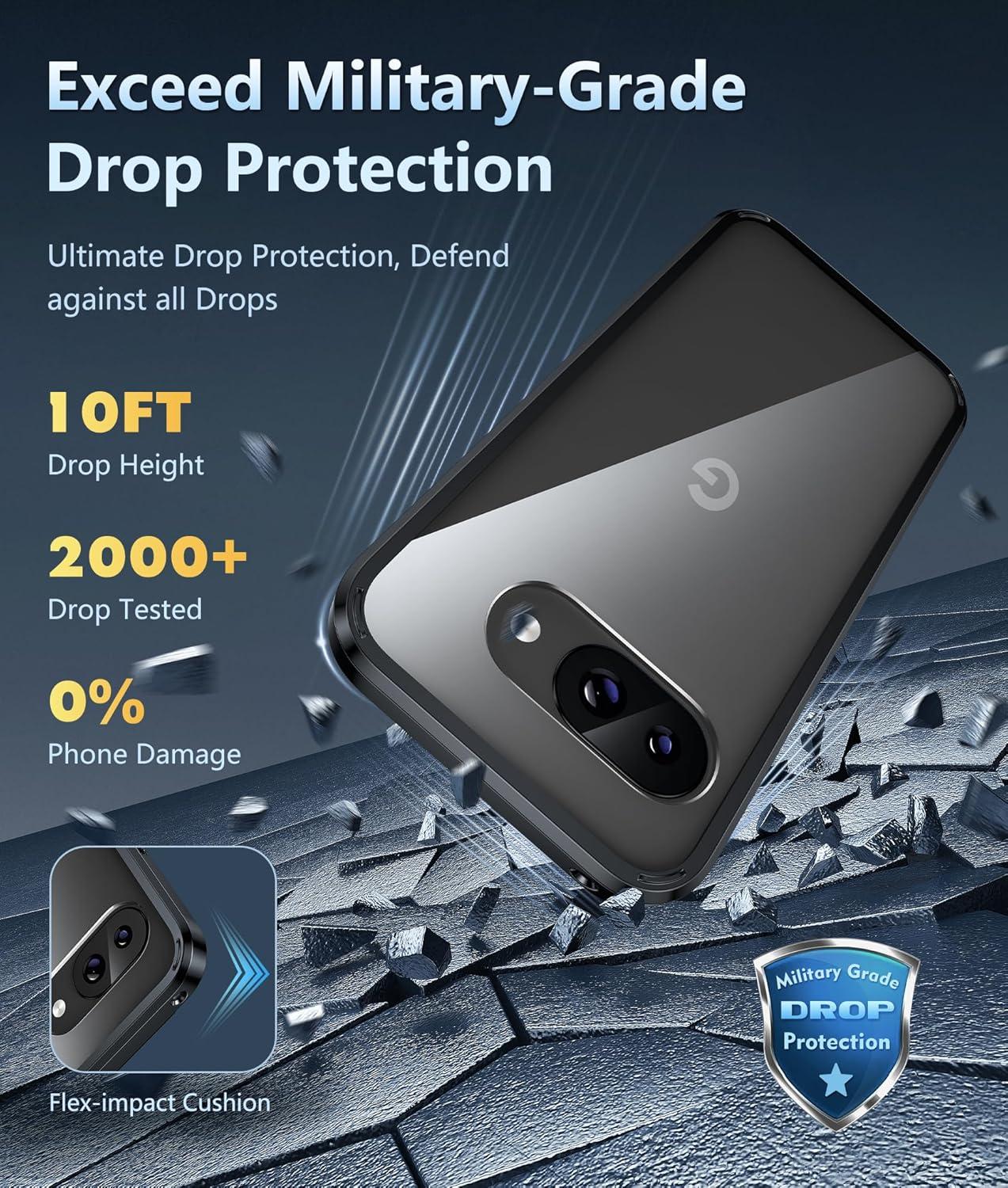 10FT Military Grade Protection: Passed Military Drop Tested up to 10 FT. This Google Pixel 9a clear case backplane is made with rigid polycarbonate and flexible shockproof TPU bumpers around the edge and features 4 built-in corner Airbags to absorb impact