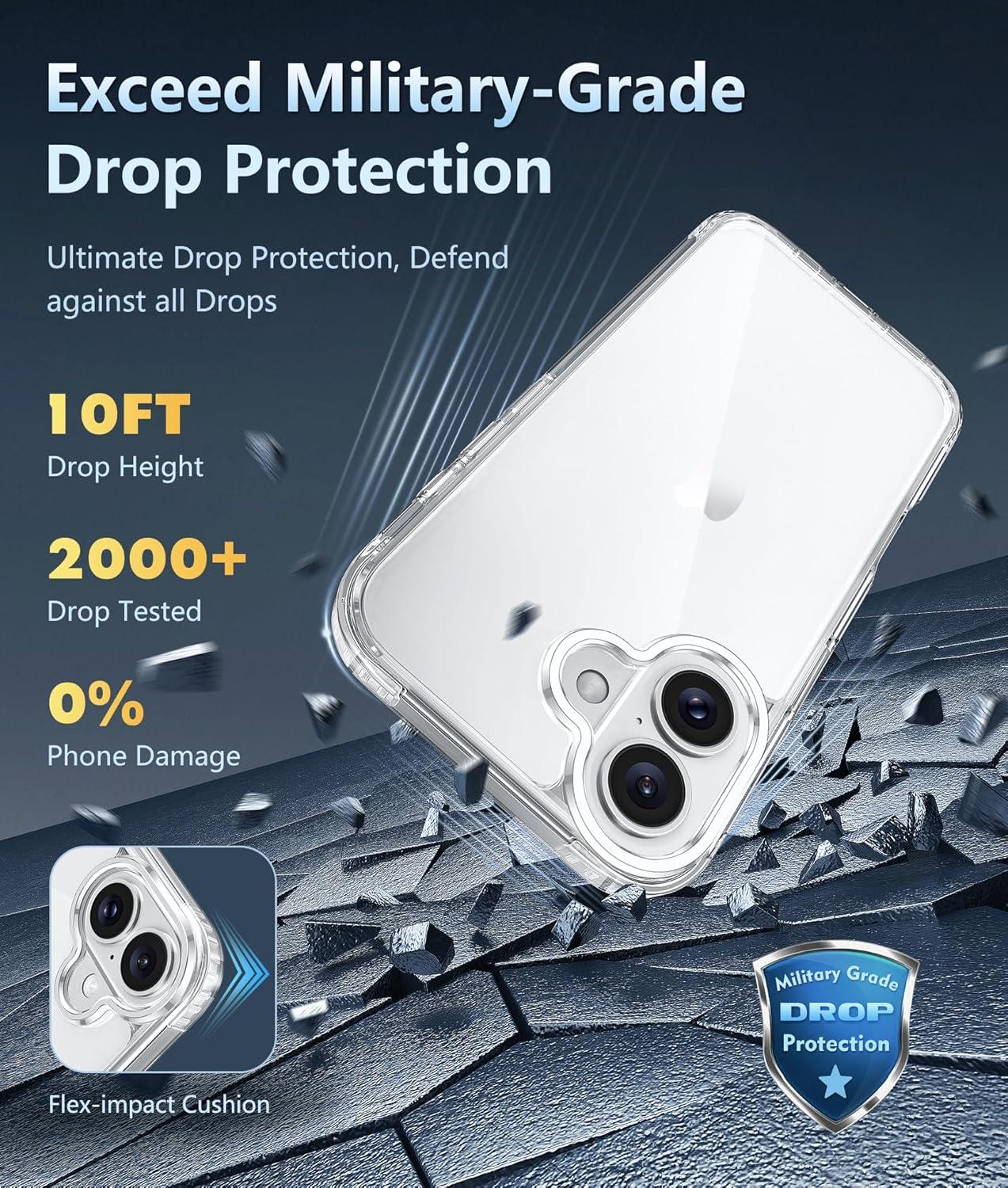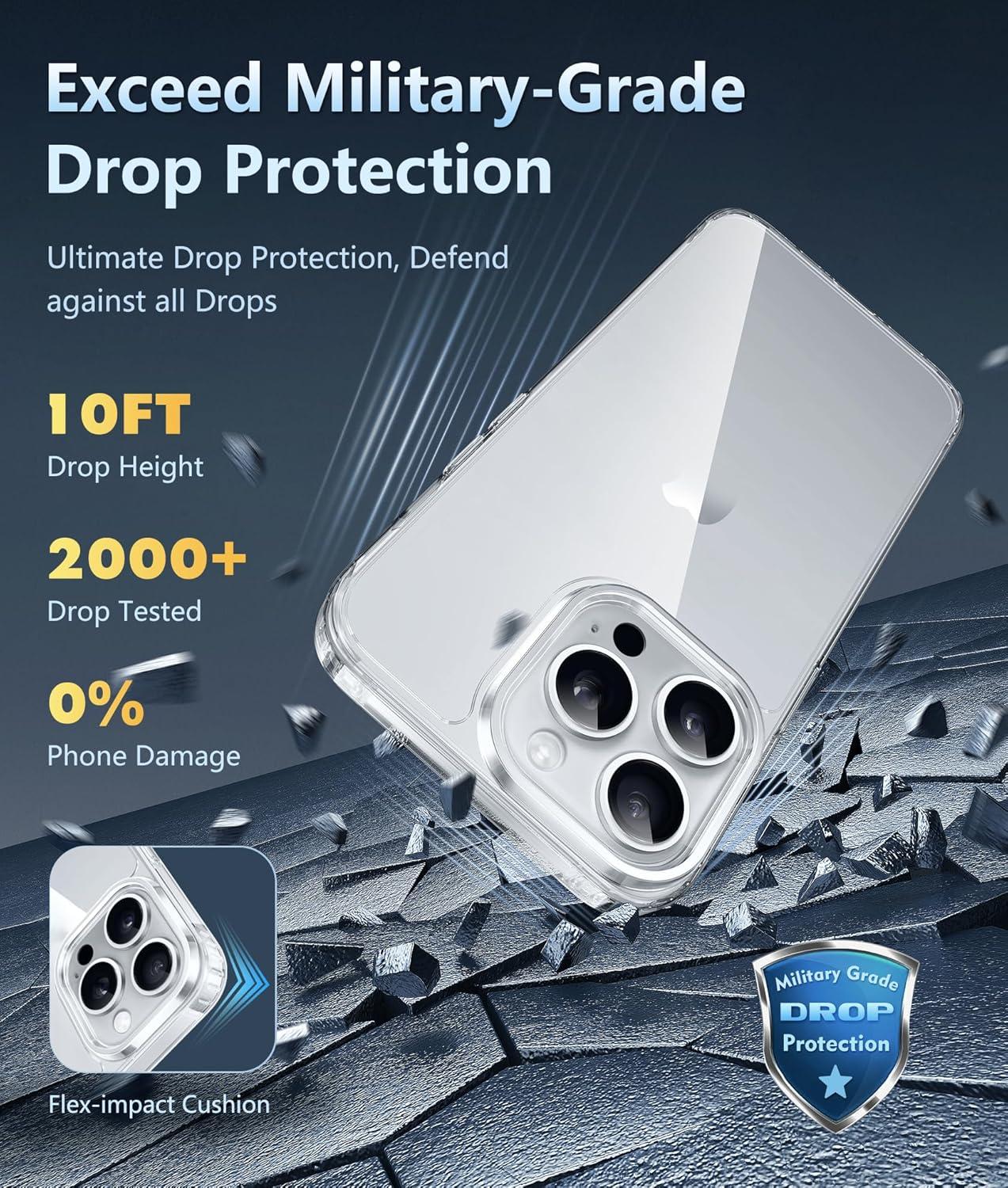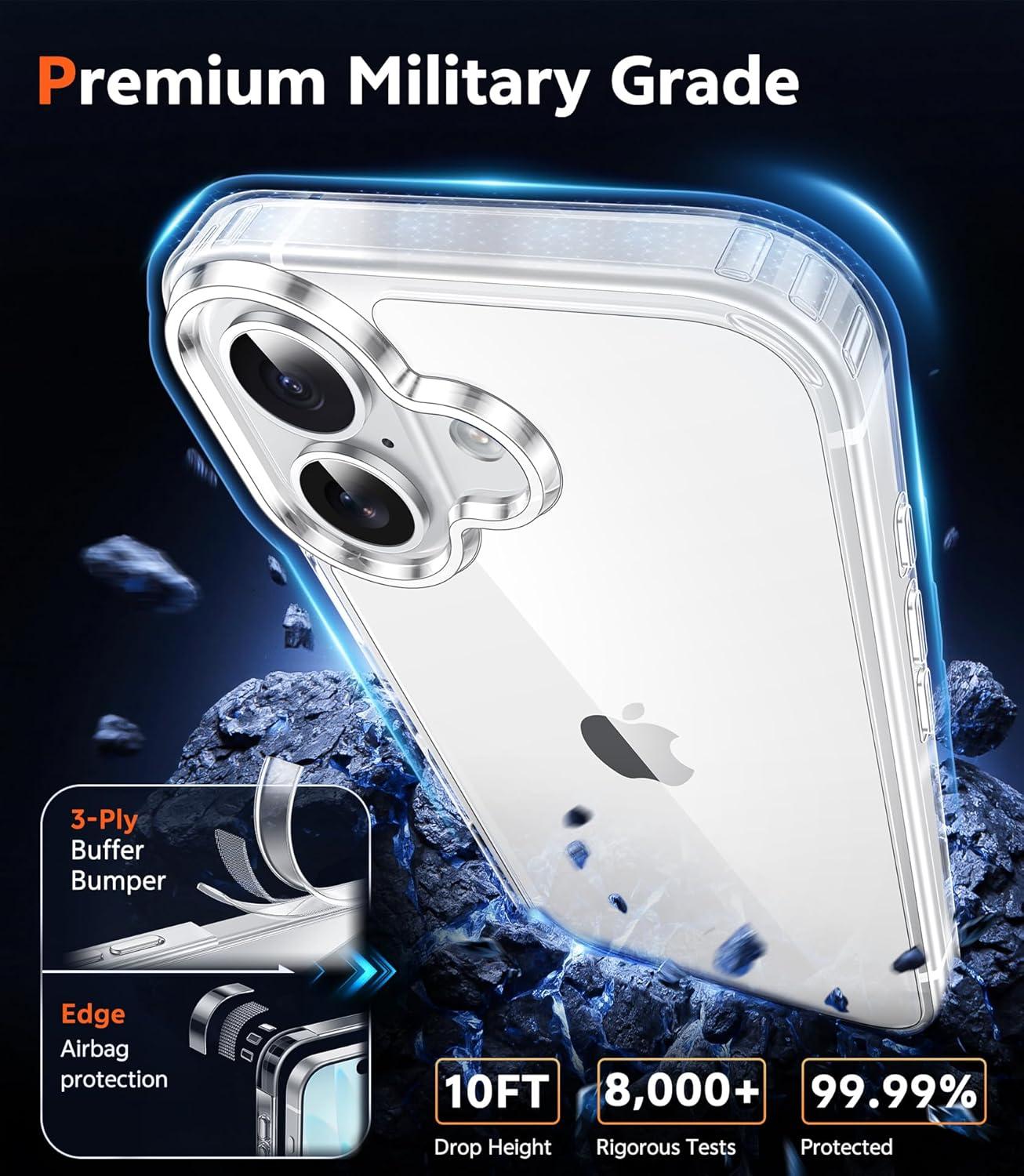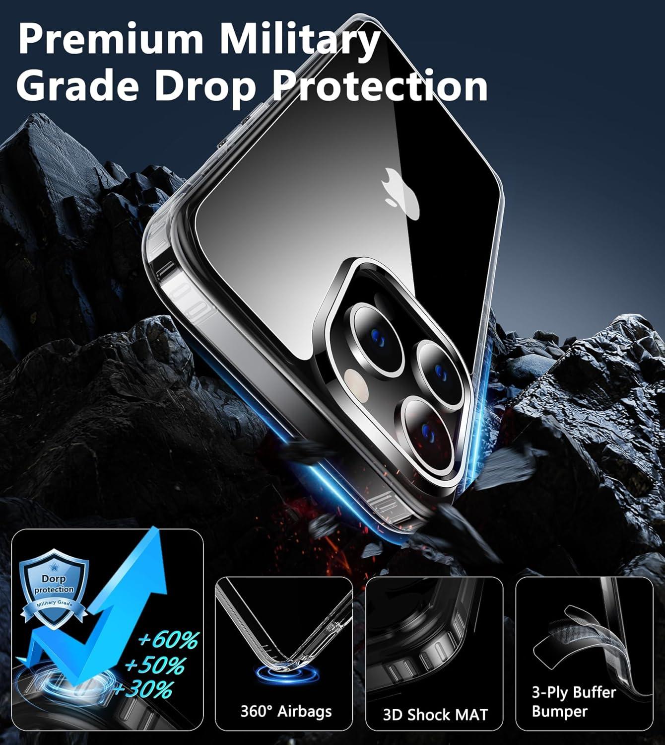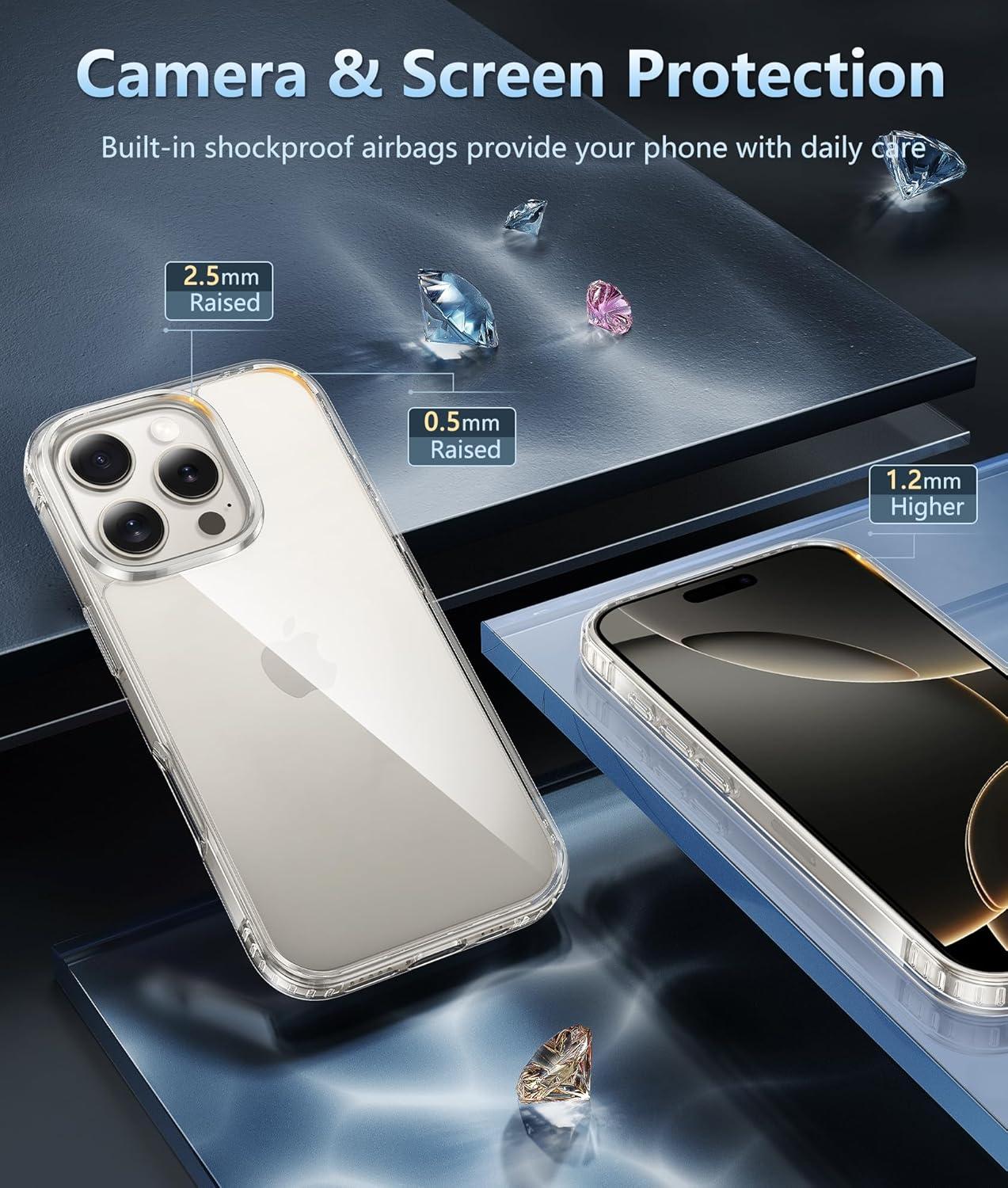 10FT Military Grade Protection: Passed Military Drop Tested up to 10 FT. This iPhone 16 Pro clear case backplane is made with rigid polycarbonate and flexible shockproof TPU bumpers around the edge and features 4 built-in corner Airbags to absorb impact