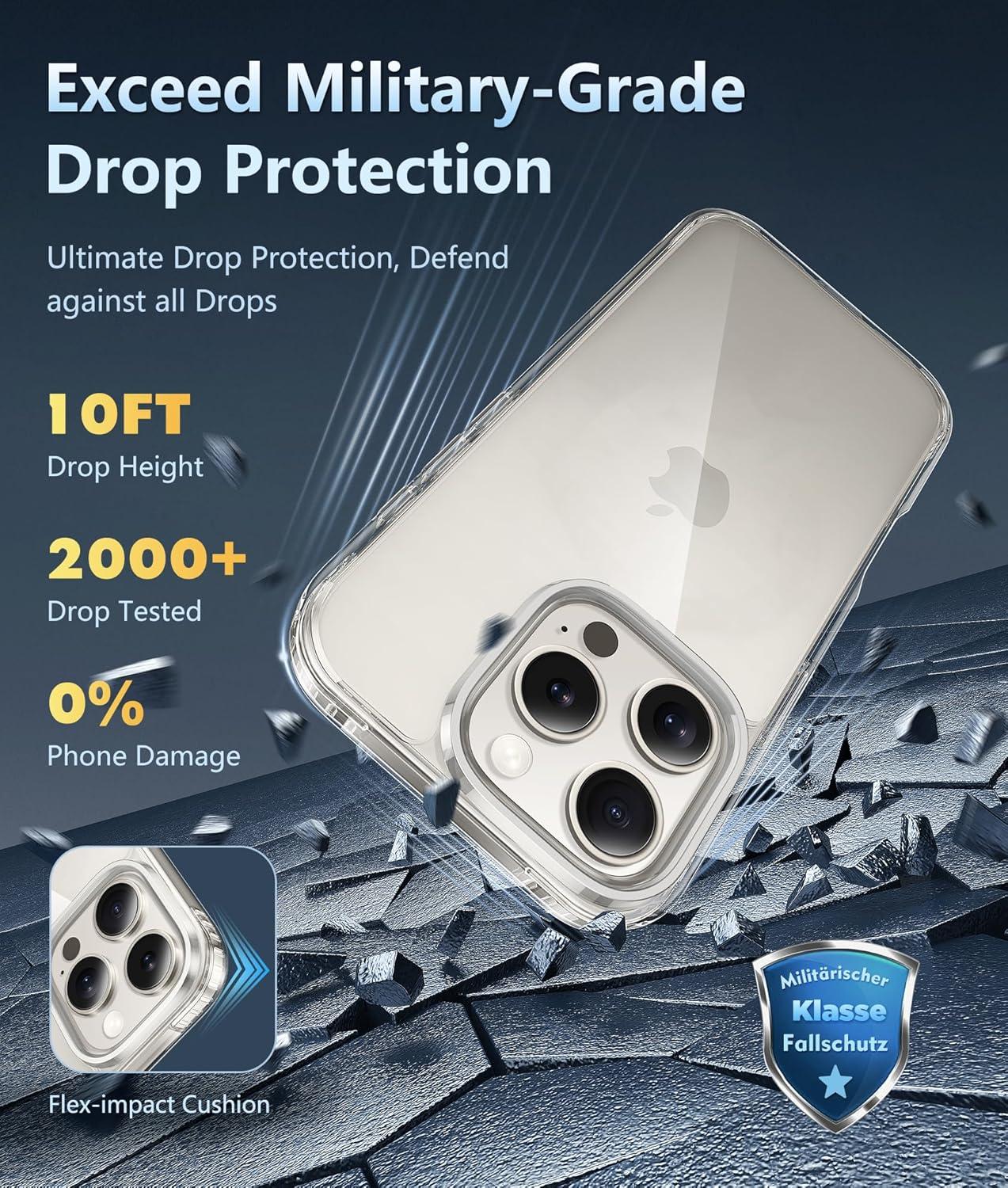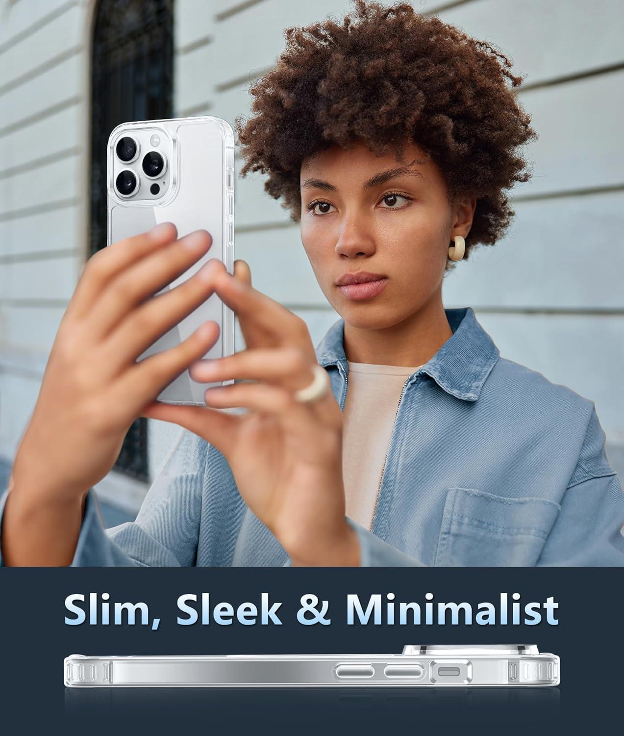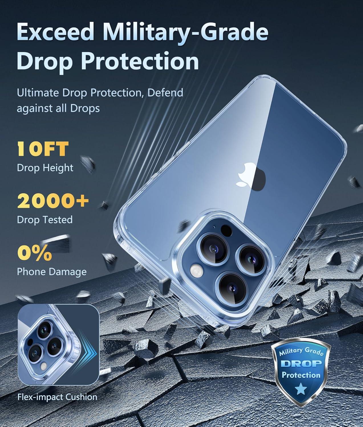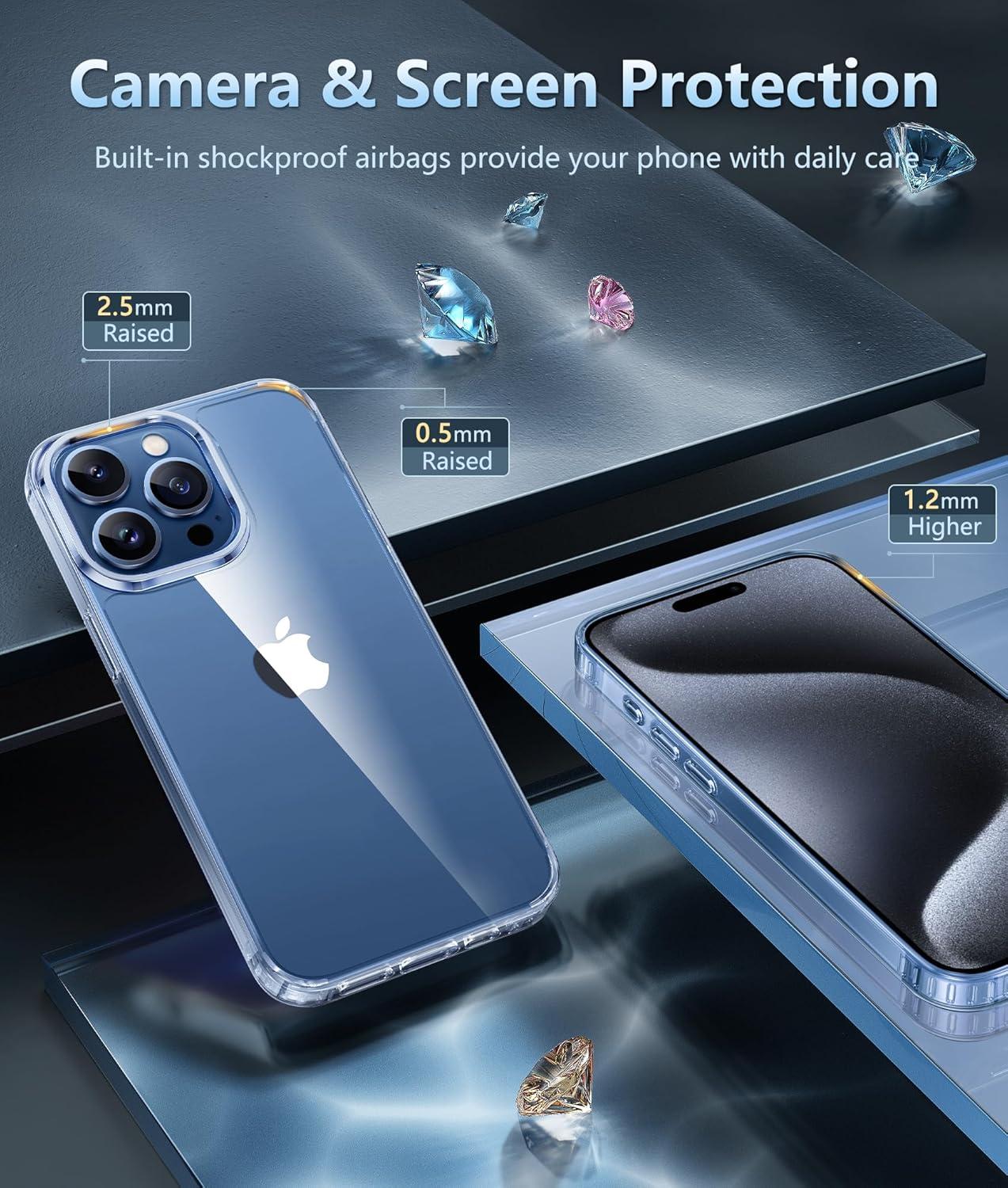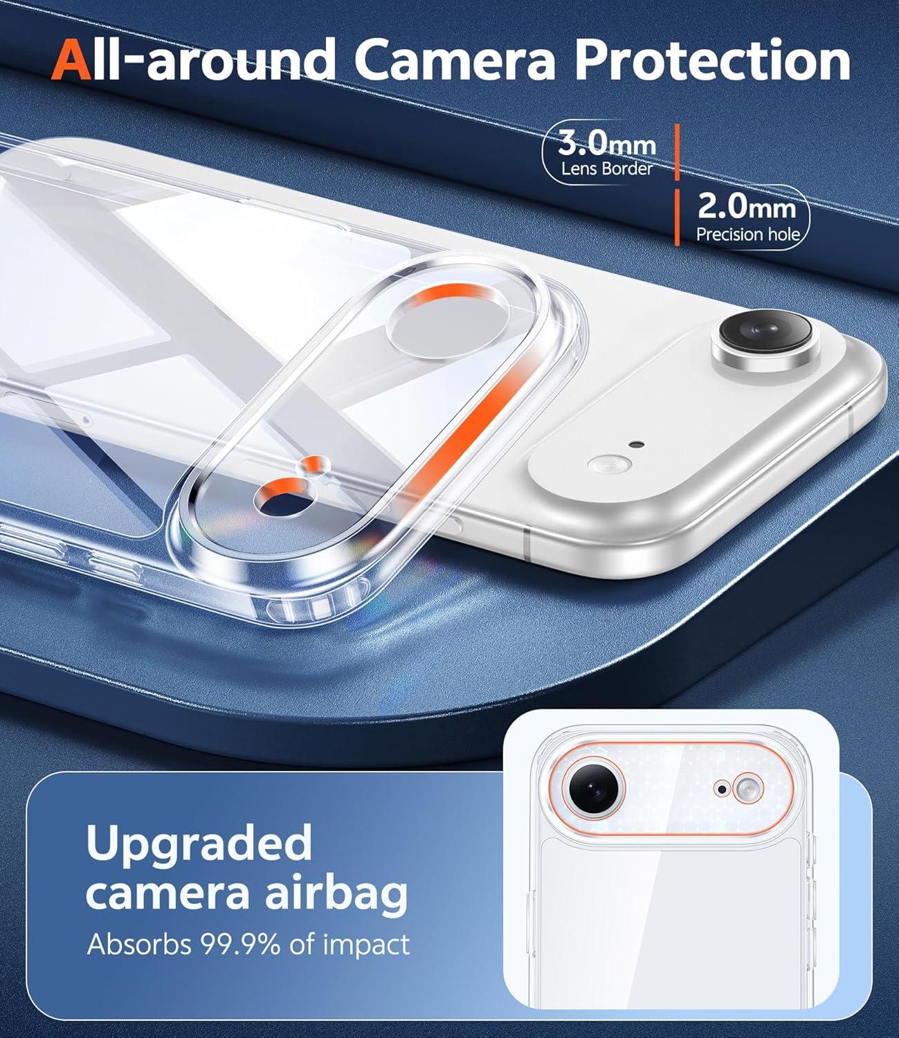 10FT Military Grade Protection: Passed Military Drop Tested up to 10 FT. This iPhone 16 Pro clear case backplane is made with rigid polycarbonate and flexible shockproof TPU bumpers around the edge and features 4 built-in corner Airbags to absorb impact