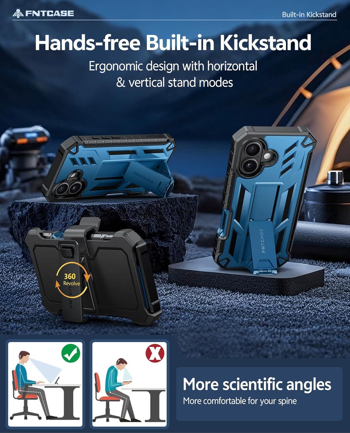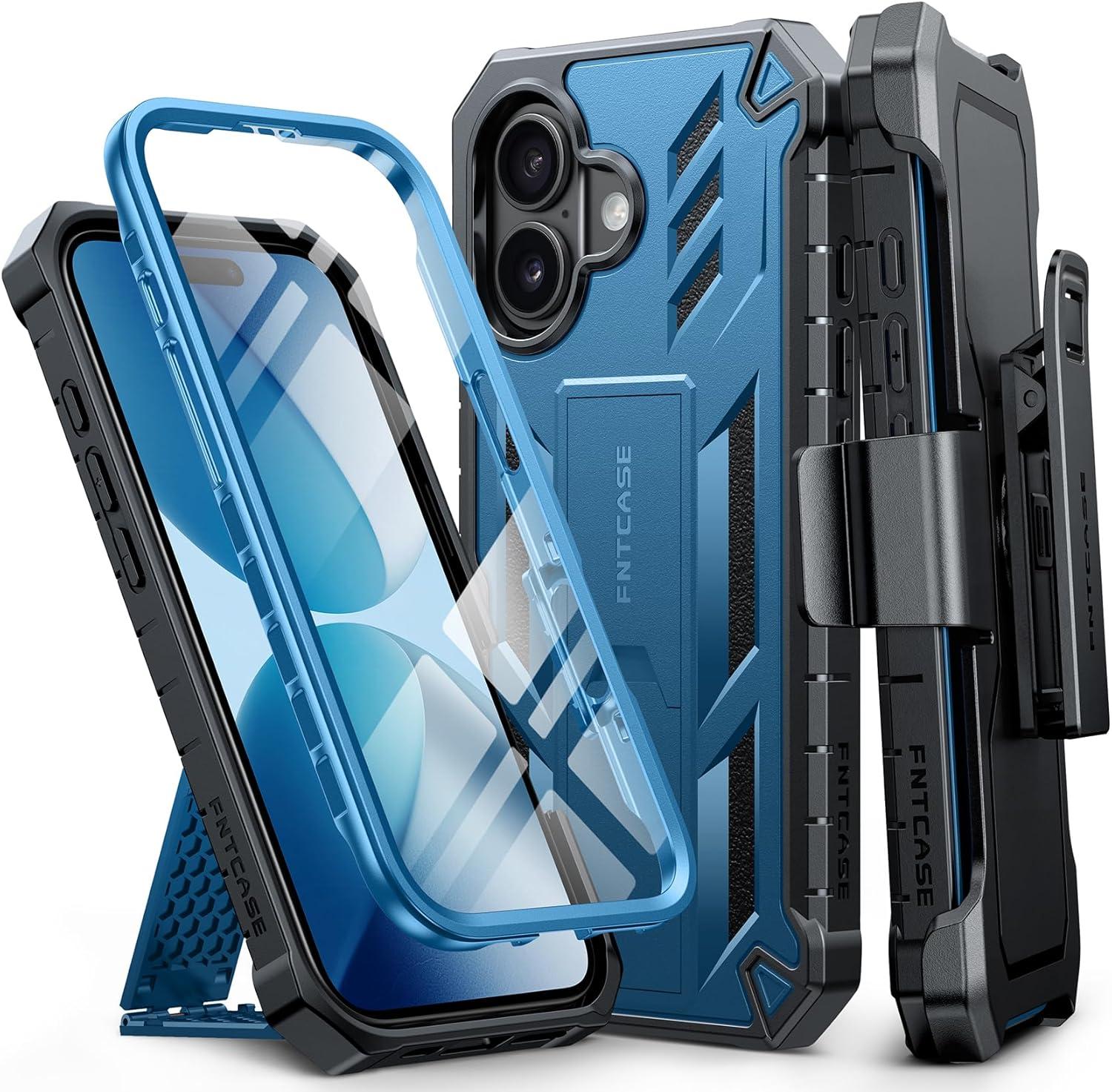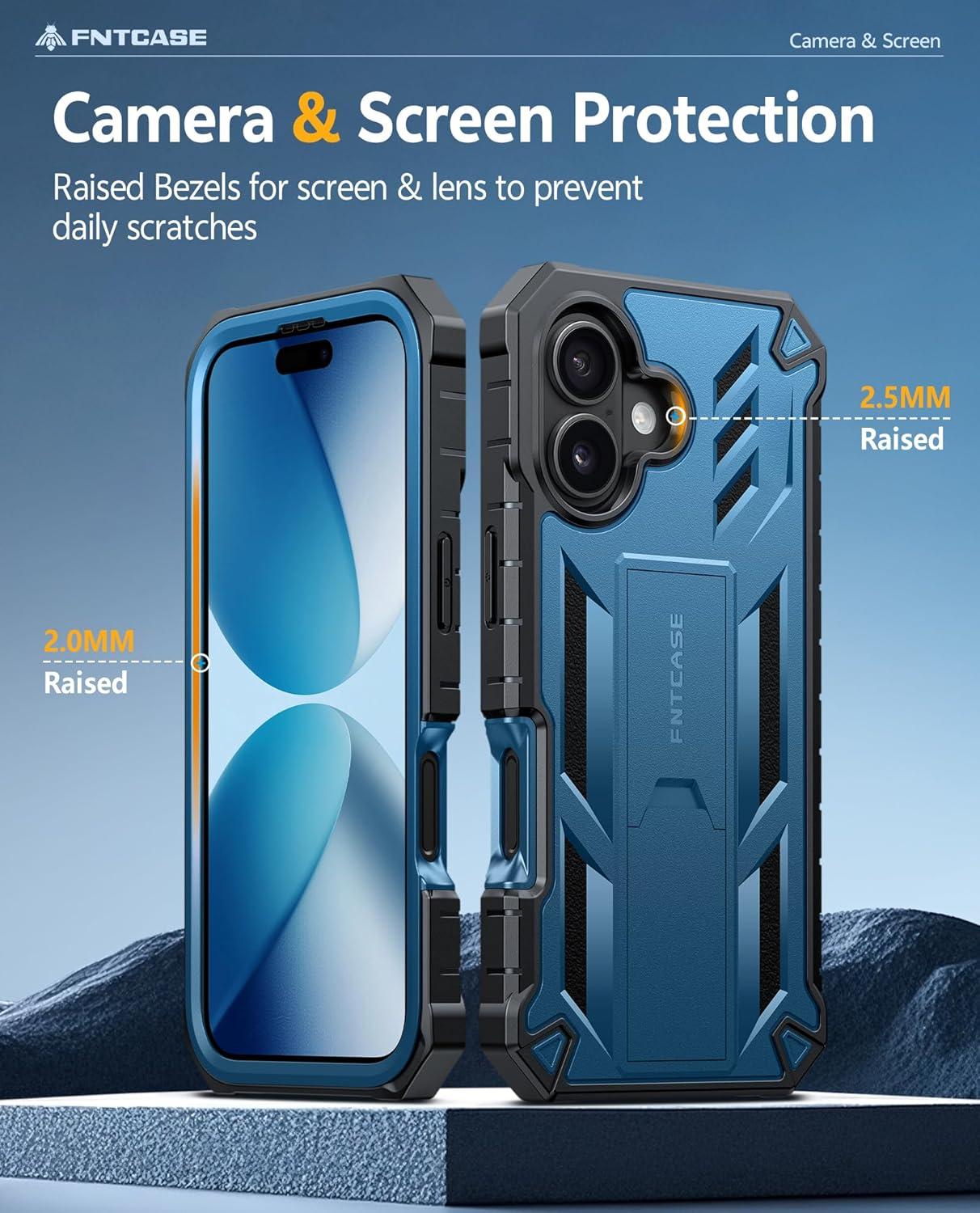 FNTCASE for iPhone 16e 2025 Case: for iPhone 16E Military Grade Rugged Phone Cover with Kickstand & Holster | Shockproof TPU Protection Bumper Matte Textured Design | Heavy Duty Protector (Black)(Blue)
