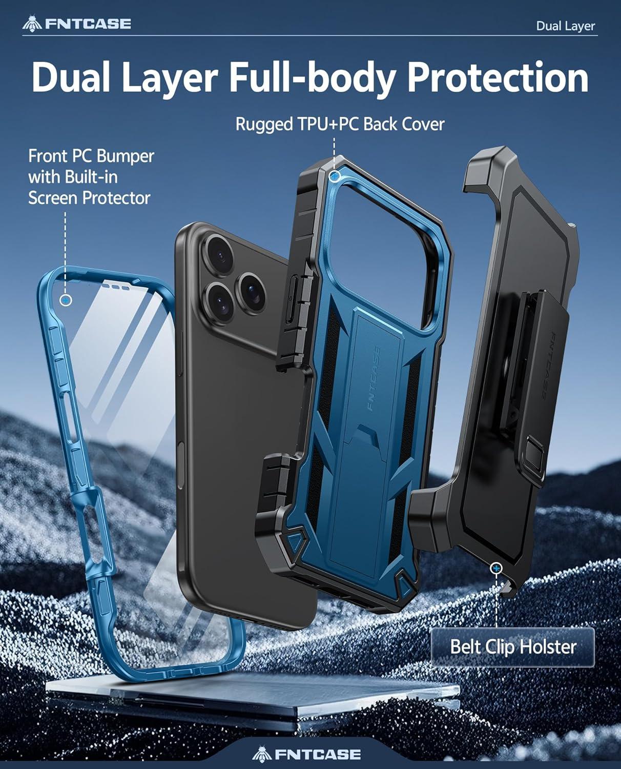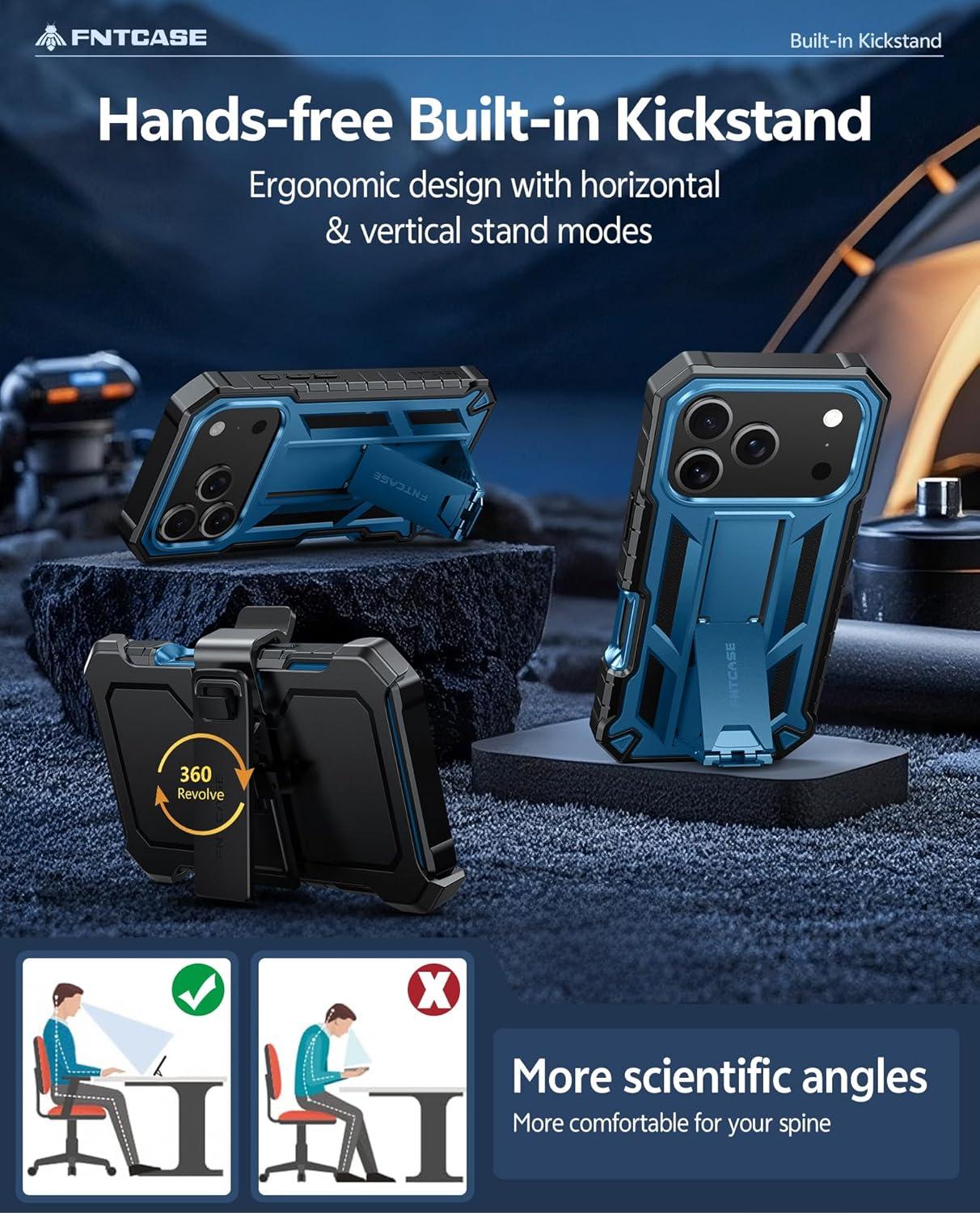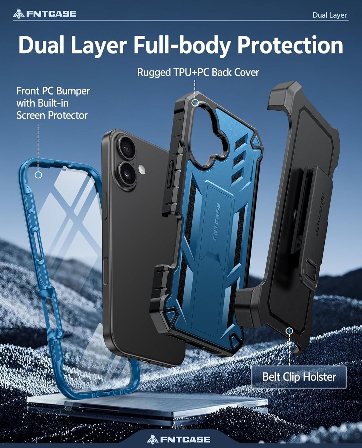 FNTCASE for iPhone 16e 2025 Case: for iPhone 16E Military Grade Rugged Phone Cover with Kickstand & Holster | Shockproof TPU Protection Bumper Matte Textured Design | Heavy Duty Protector (Black)(Blue)