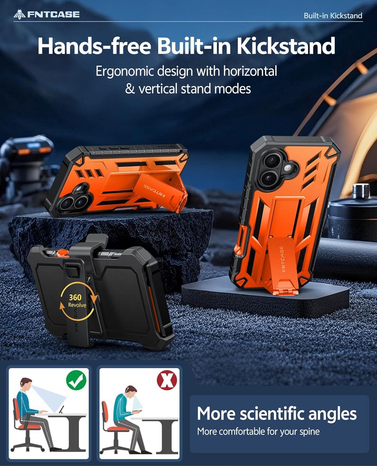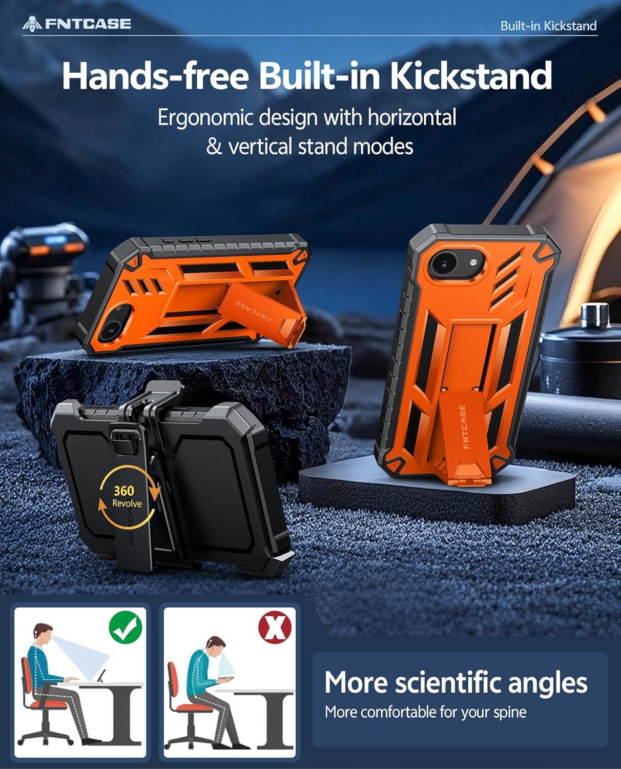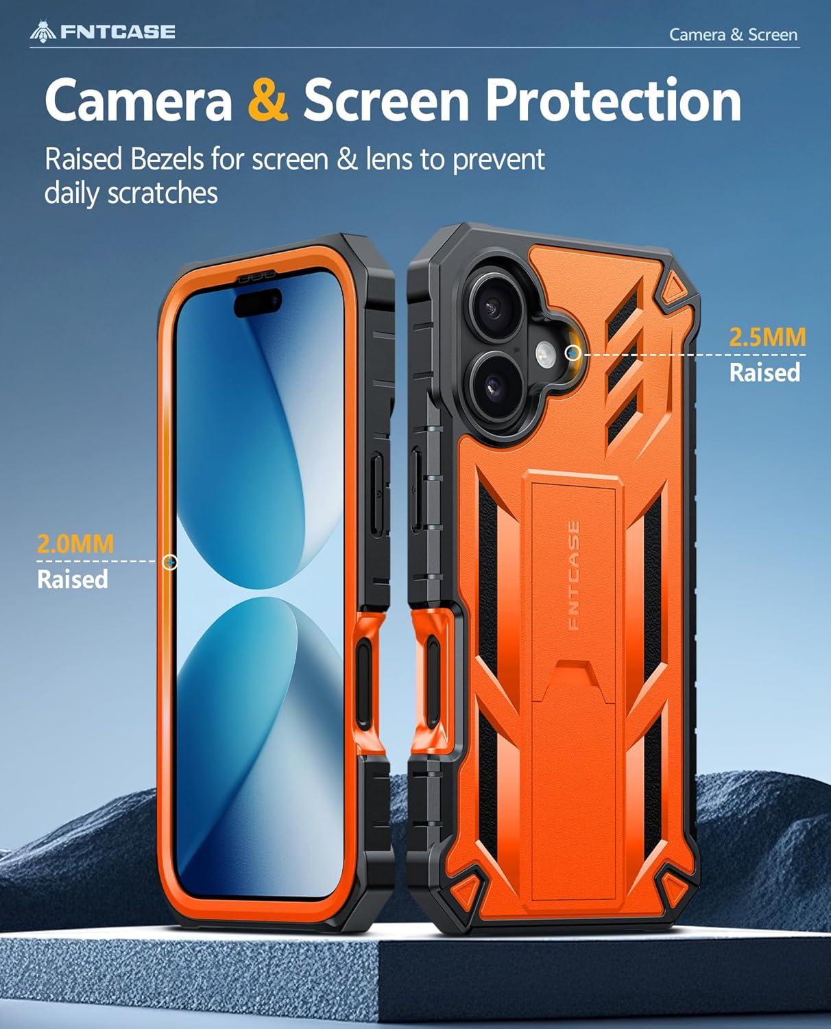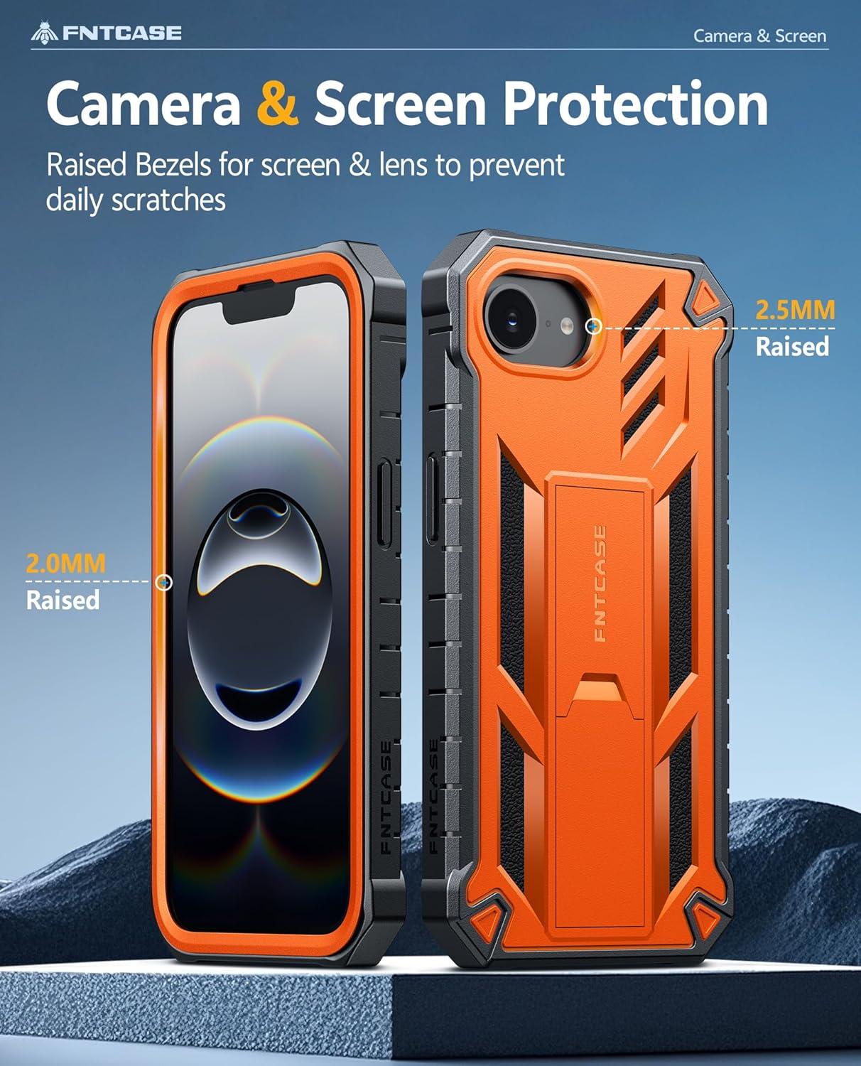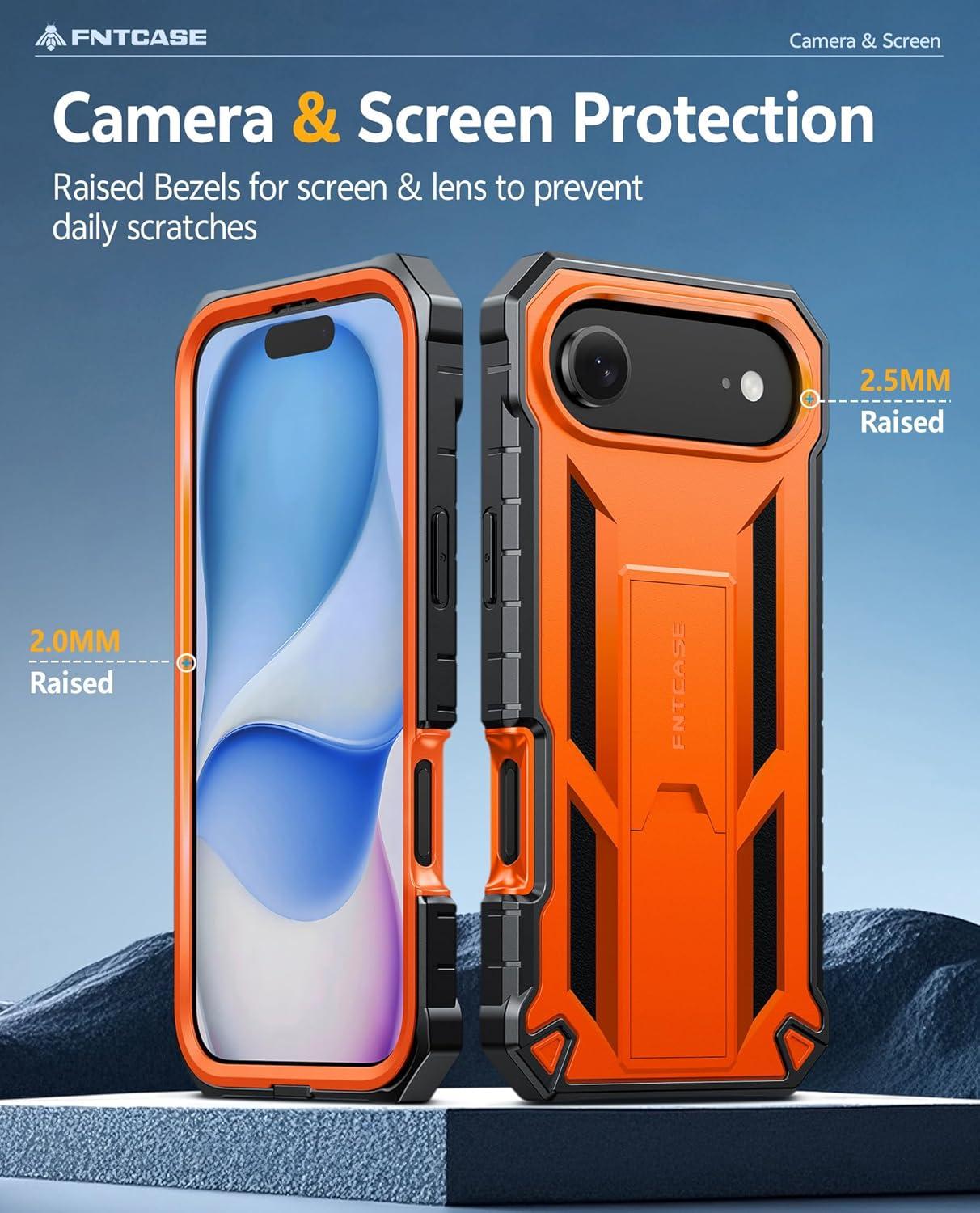 FNTCASE for iPhone 16e 2025 Case: for iPhone 16E Military Grade Rugged Phone Cover with Kickstand & Holster | Shockproof TPU Protection Bumper Matte Textured Design | Heavy Duty Protector (Black)(Orange)