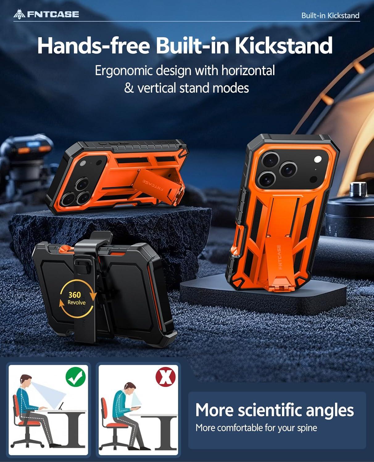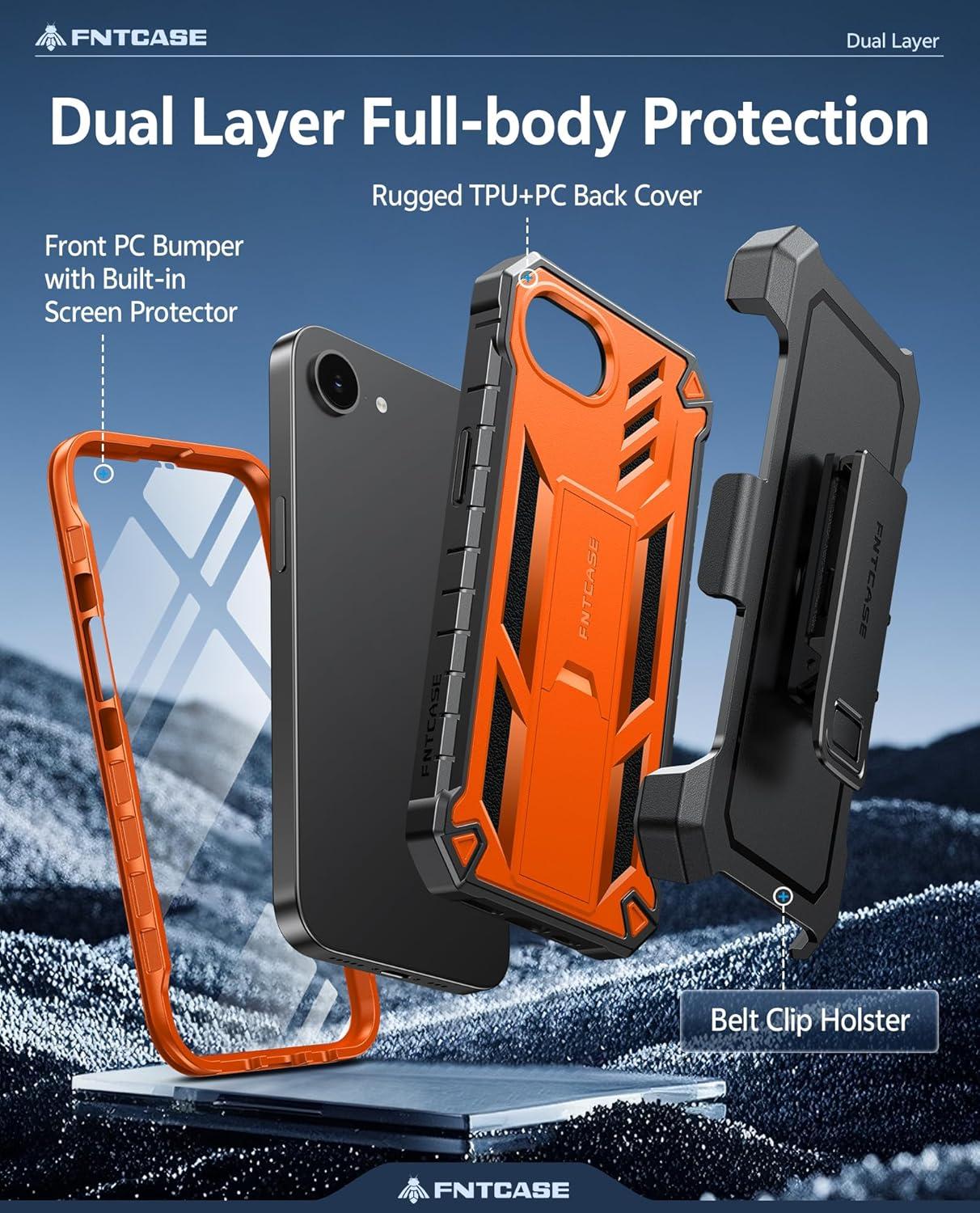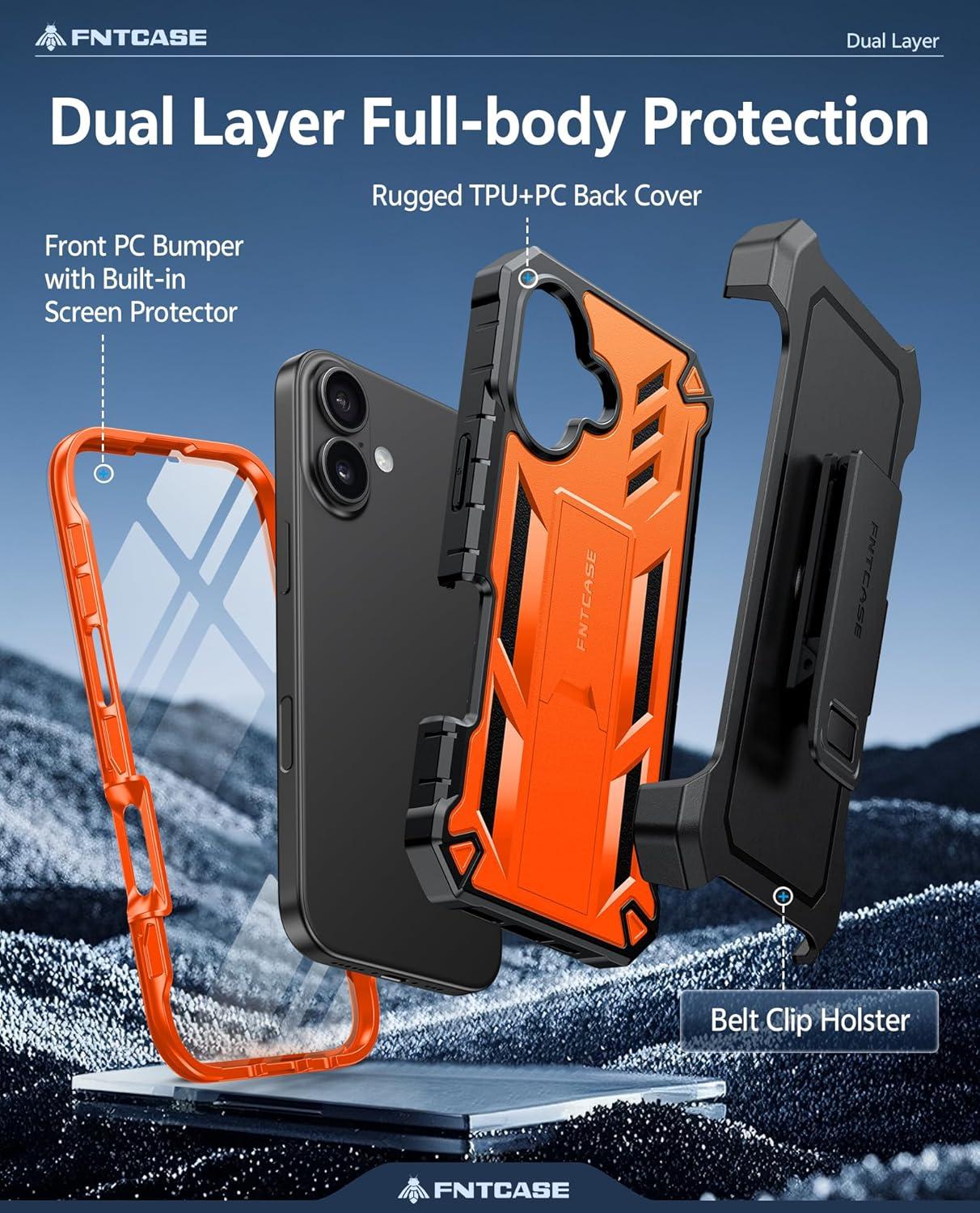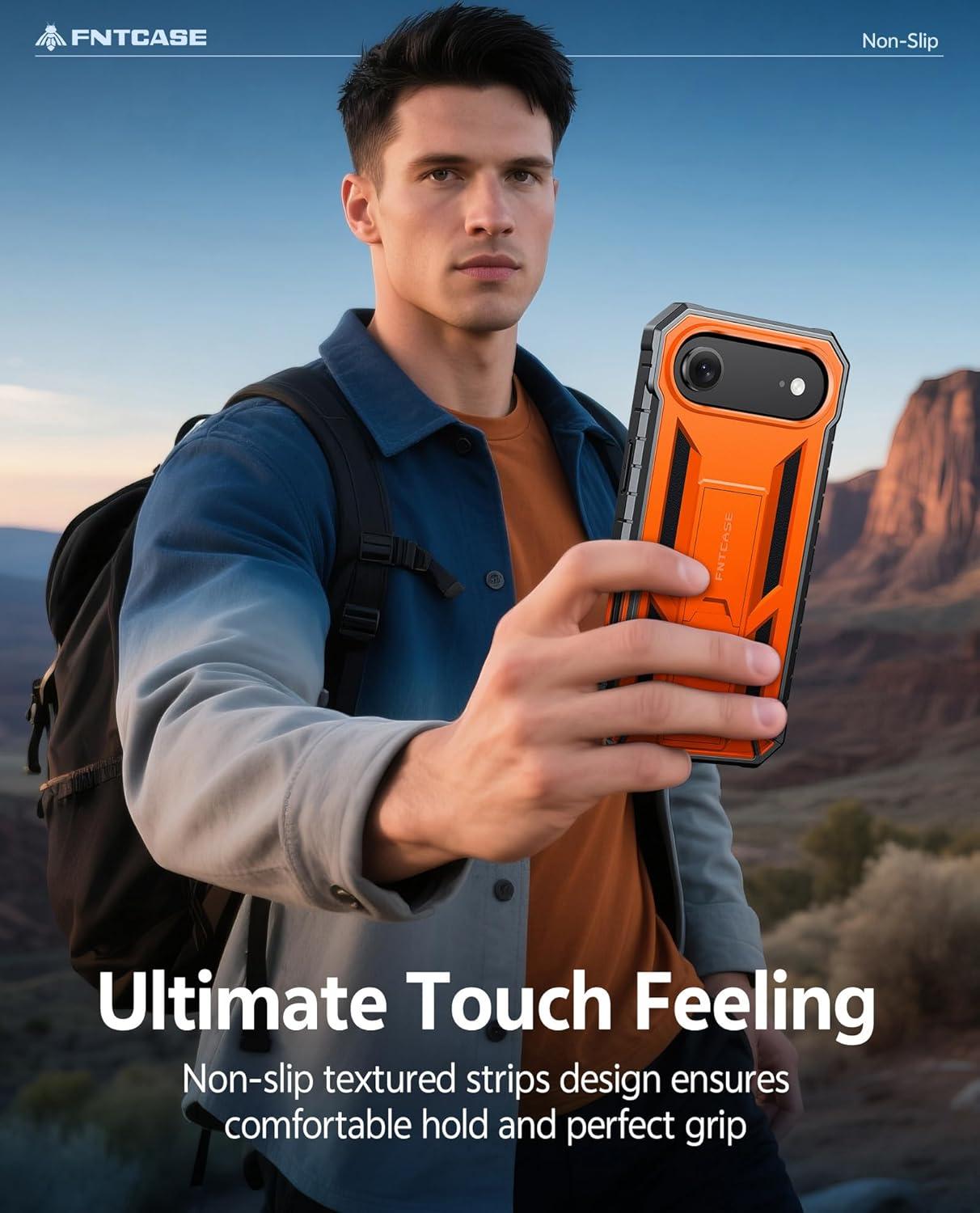 FNTCASE for iPhone 16e 2025 Case: for iPhone 16E Military Grade Rugged Phone Cover with Kickstand & Holster | Shockproof TPU Protection Bumper Matte Textured Design | Heavy Duty Protector (Black)(Orange)