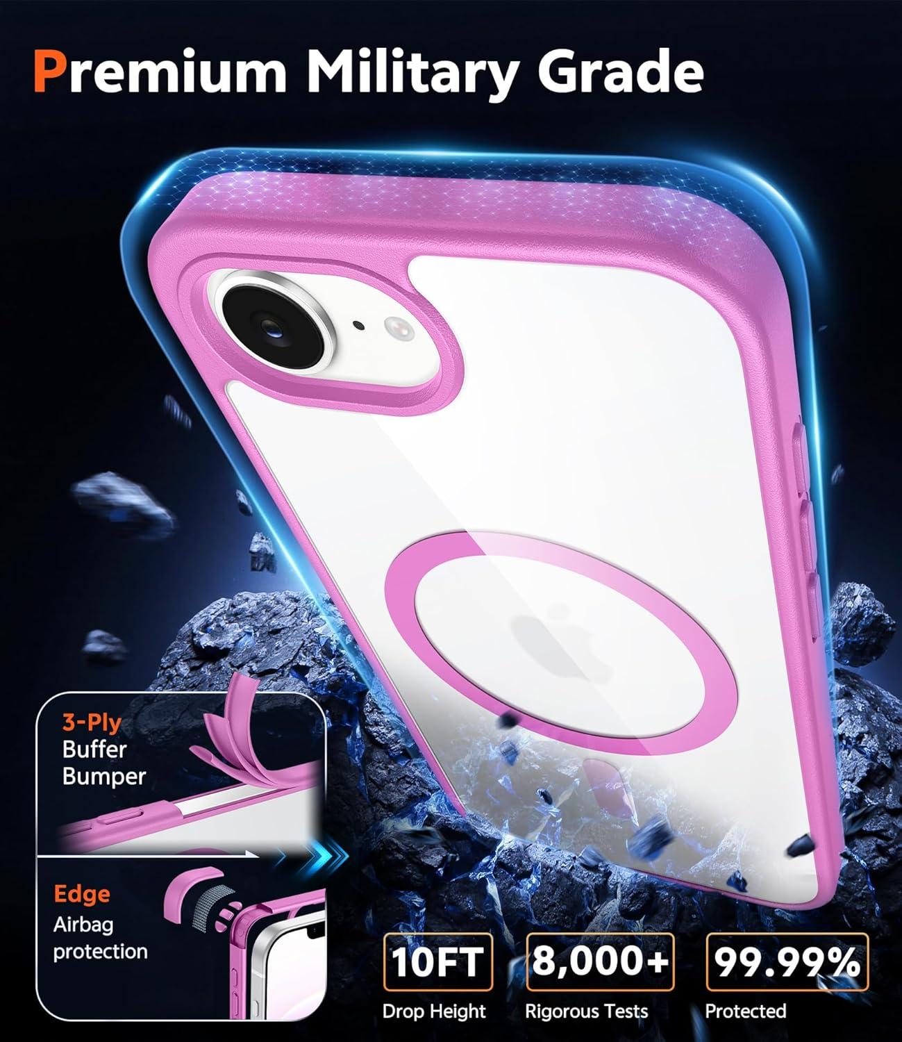 FNTCASE for iPhone 16e Case Clear: Magnetic Phone Cases with Screen Protector Drop Proof Compatible with Magsafe Slim Anti Yellowing Rugged Shockproof Protective Transparent Cell Cover (B-Pink)