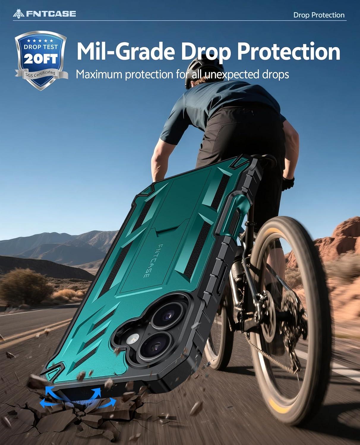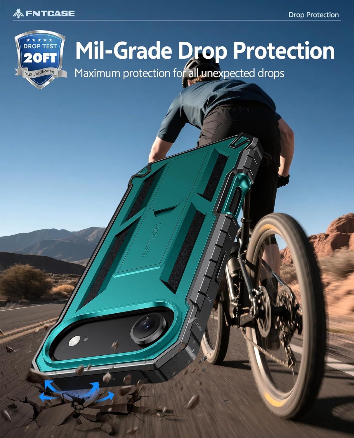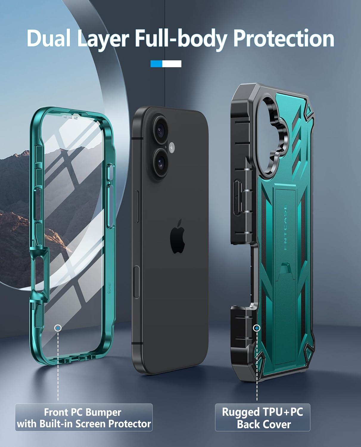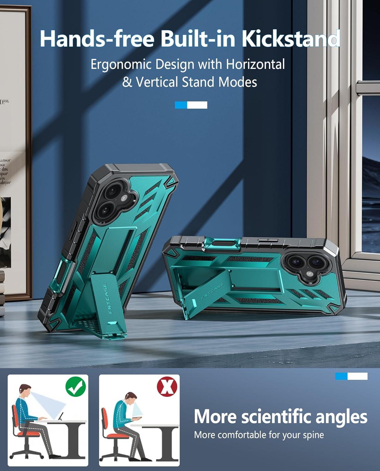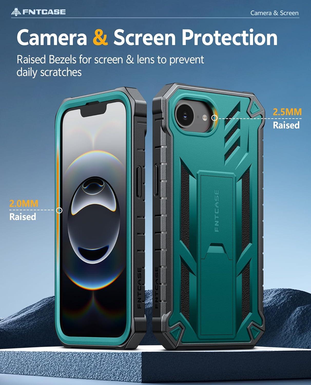 FNTCASE for iPhone 16e Phone Case: Military Grade [Built-in Screen Protector] [Kickstand] Matte Textured Drop Proof Protection Cover | Rugged Shockproof TPU Protective Sturdy Cases 2025 – Black(Green)