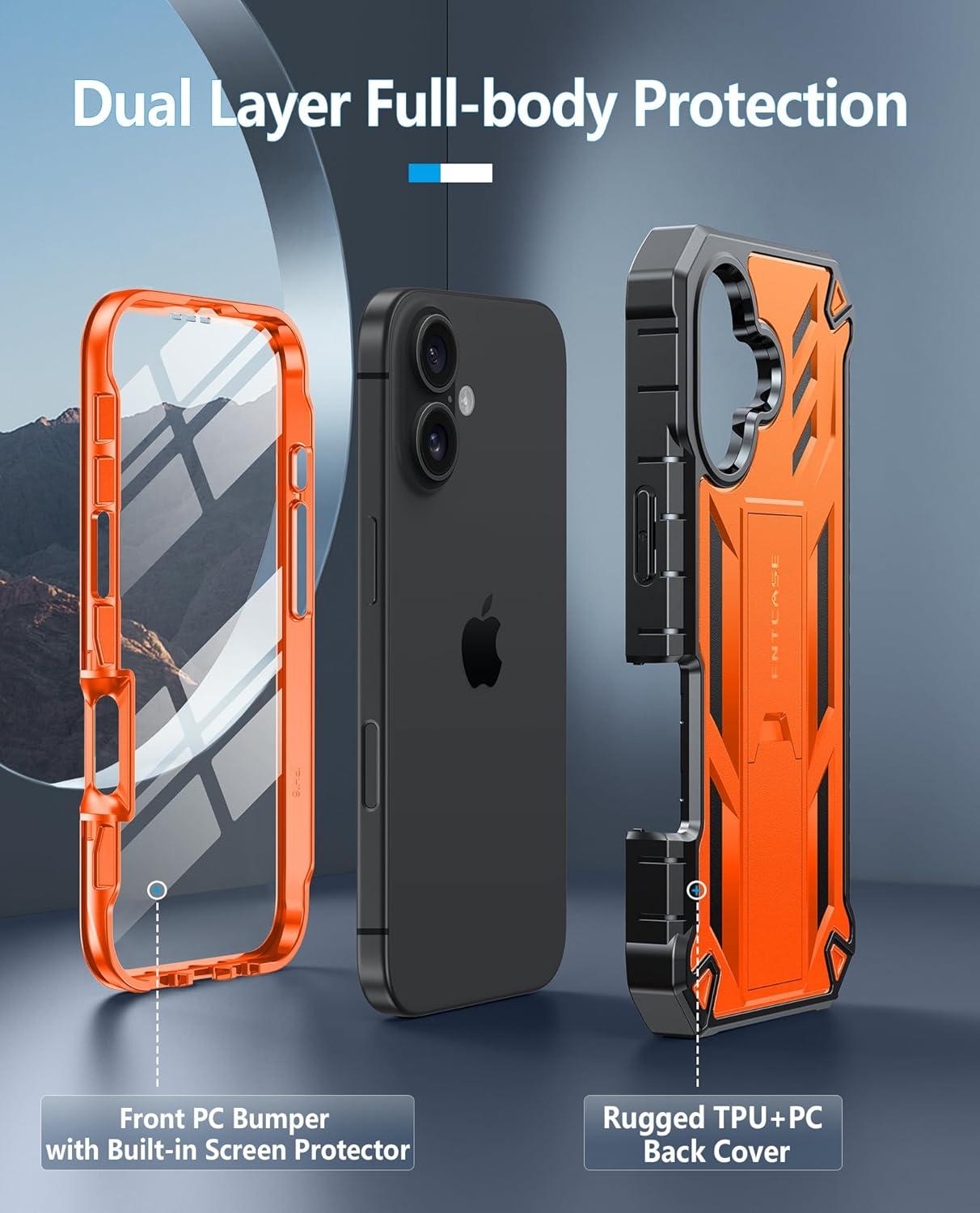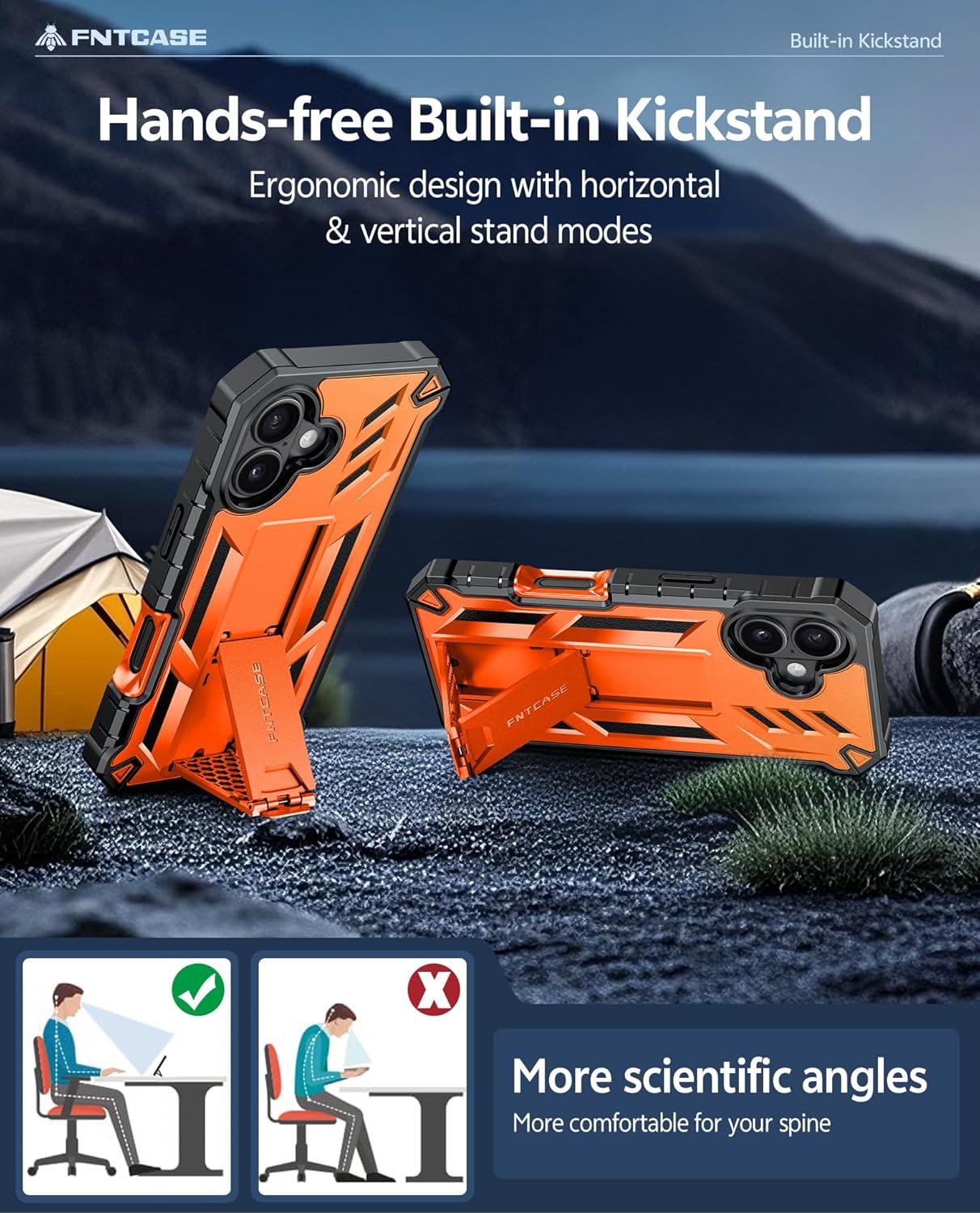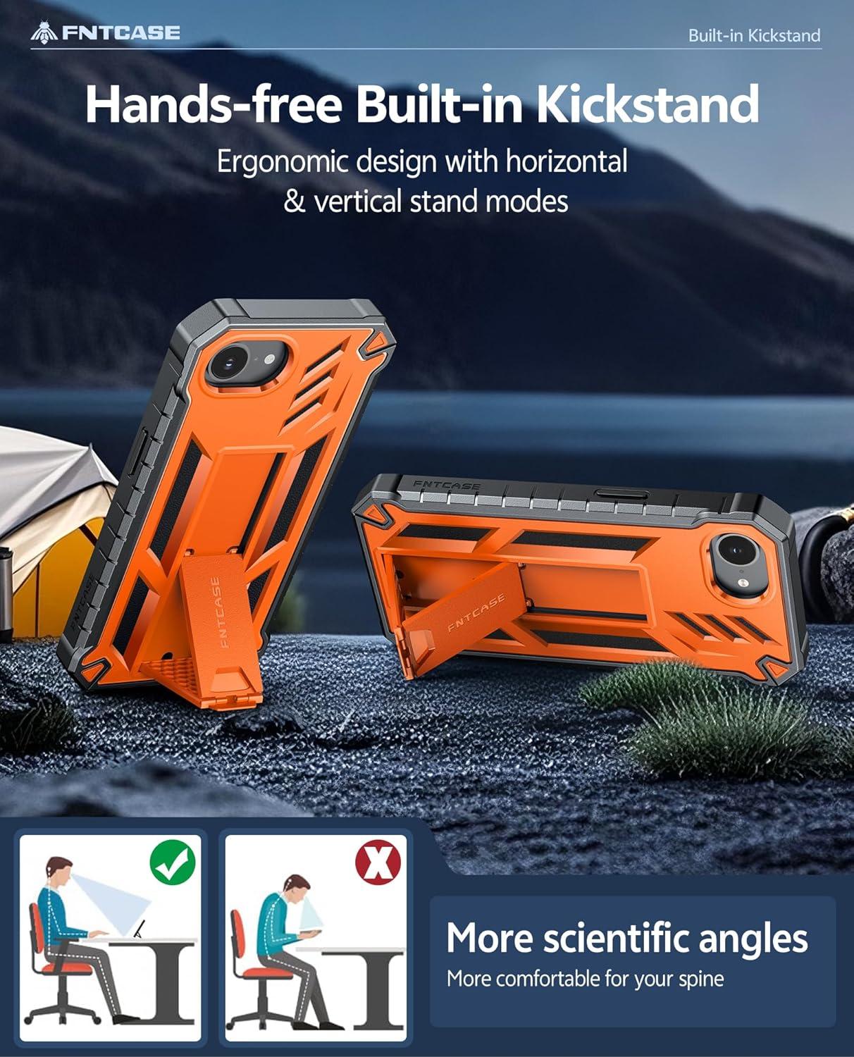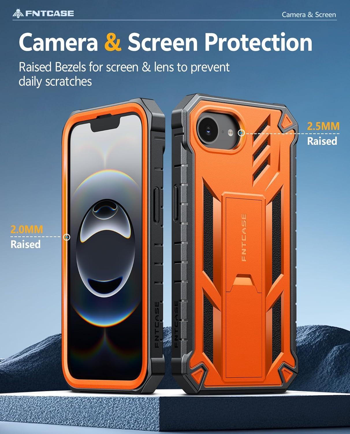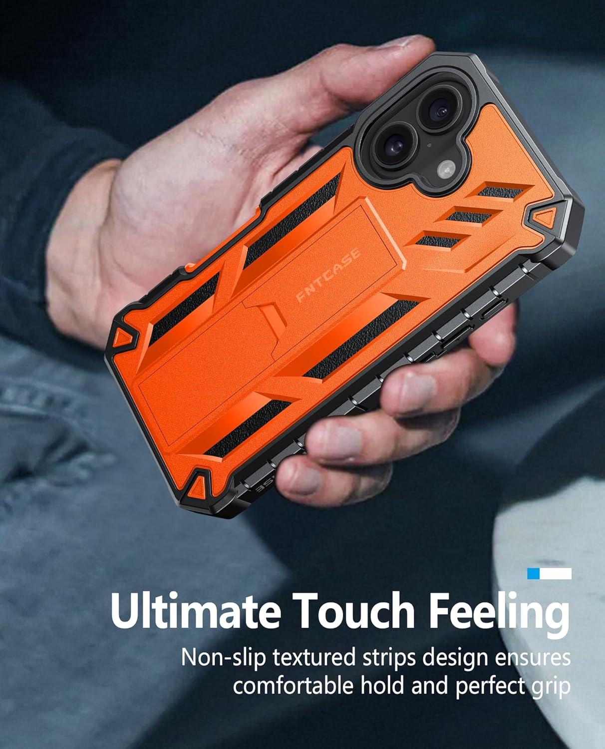 FNTCASE for iPhone 16e Phone Case: Military Grade [Built-in Screen Protector] [Kickstand] Matte Textured Drop Proof Protection Cover | Rugged Shockproof TPU Protective Sturdy Cases 2025 – Black(Orange)