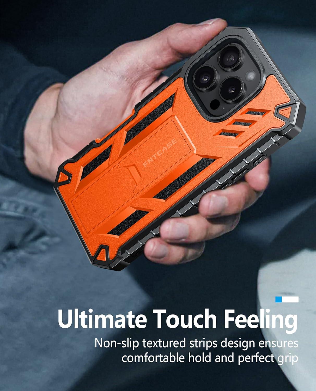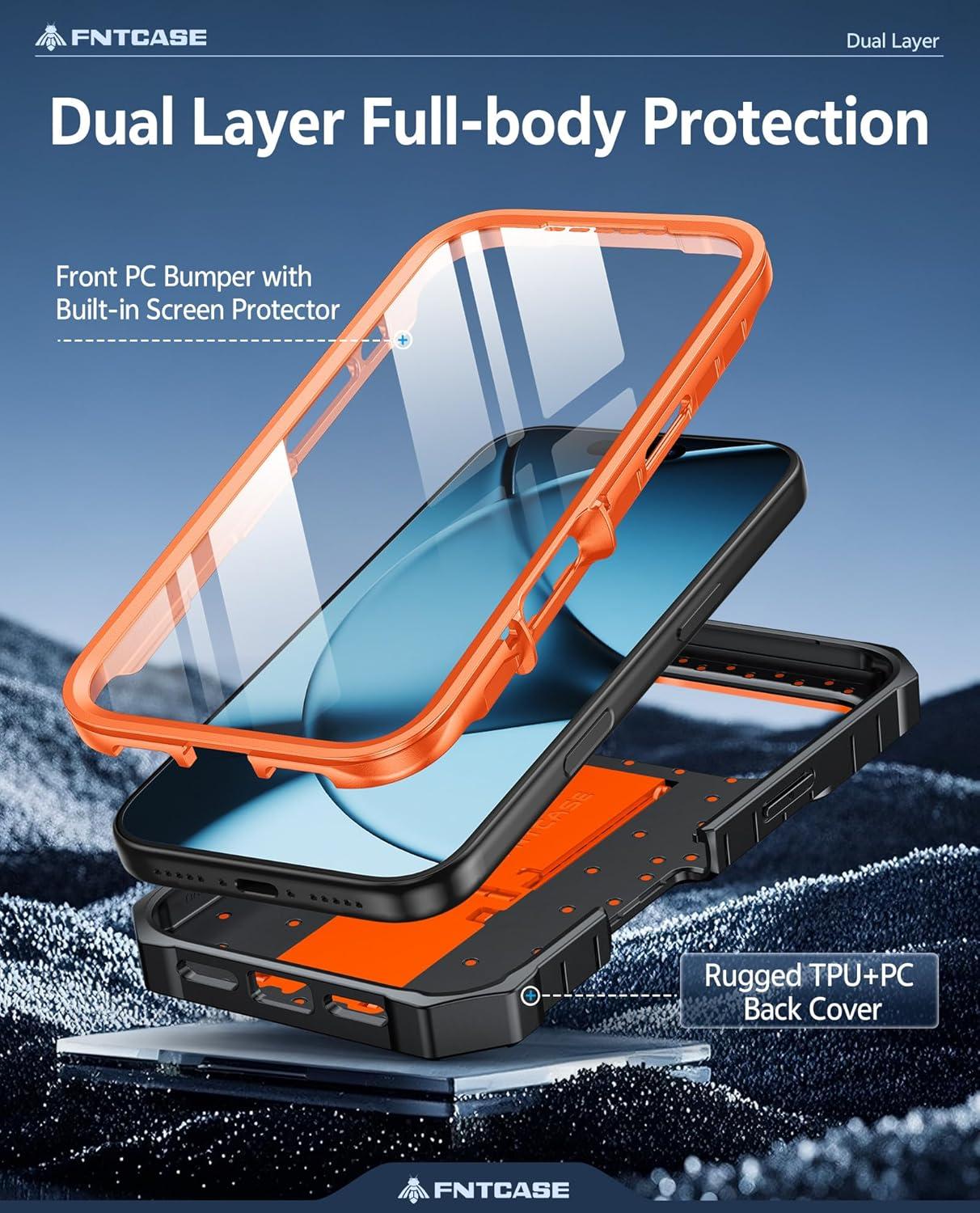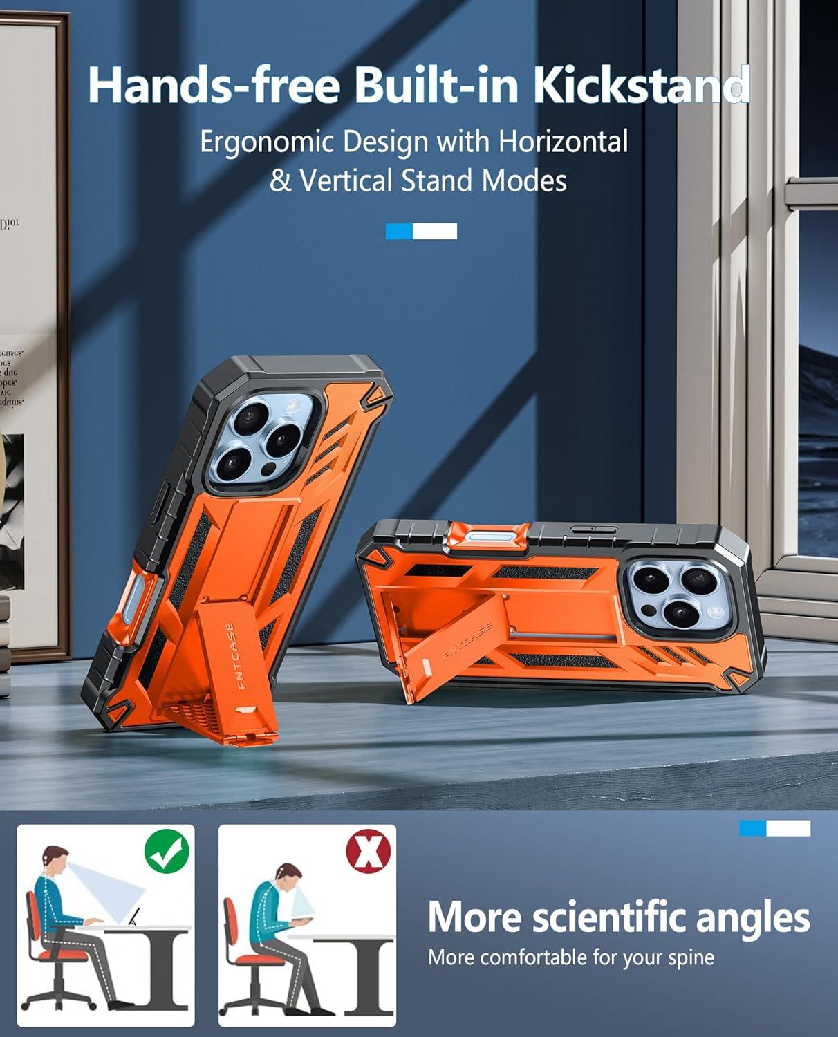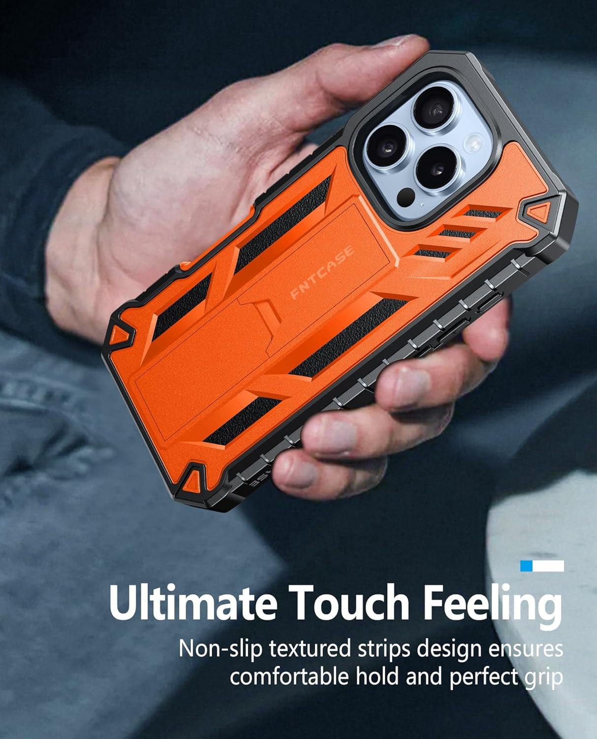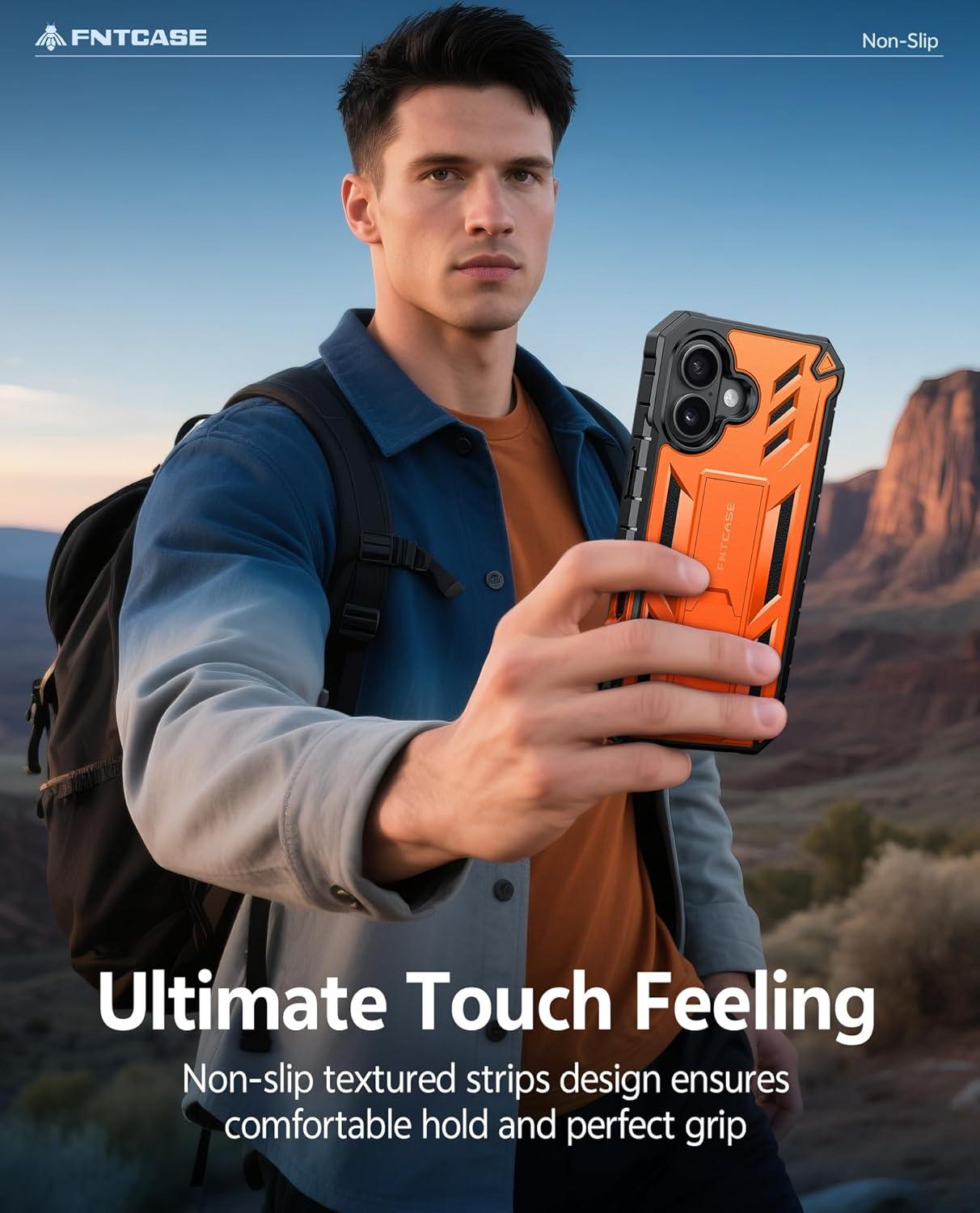 FNTCASE for iPhone 16e Phone Case: Military Grade [Built-in Screen Protector] [Kickstand] Matte Textured Drop Proof Protection Cover | Rugged Shockproof TPU Protective Sturdy Cases 2025 – Black(Orange)