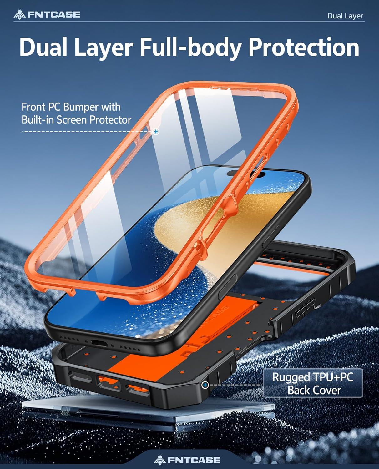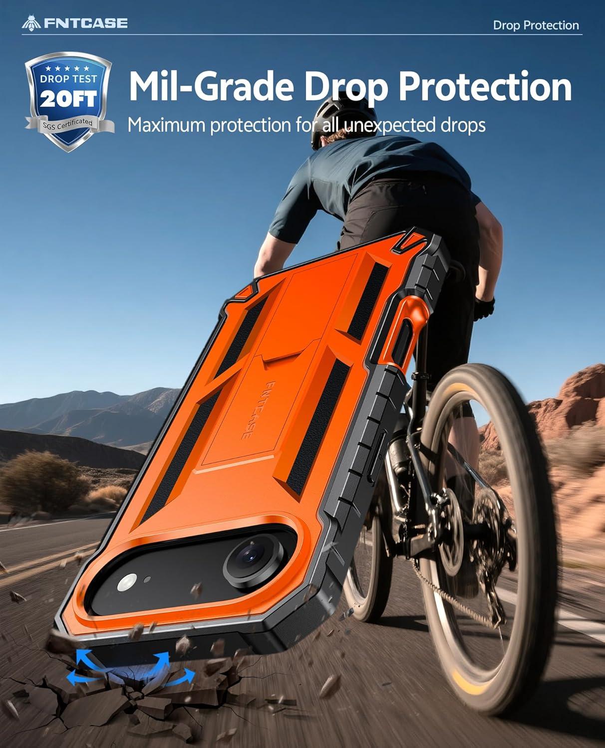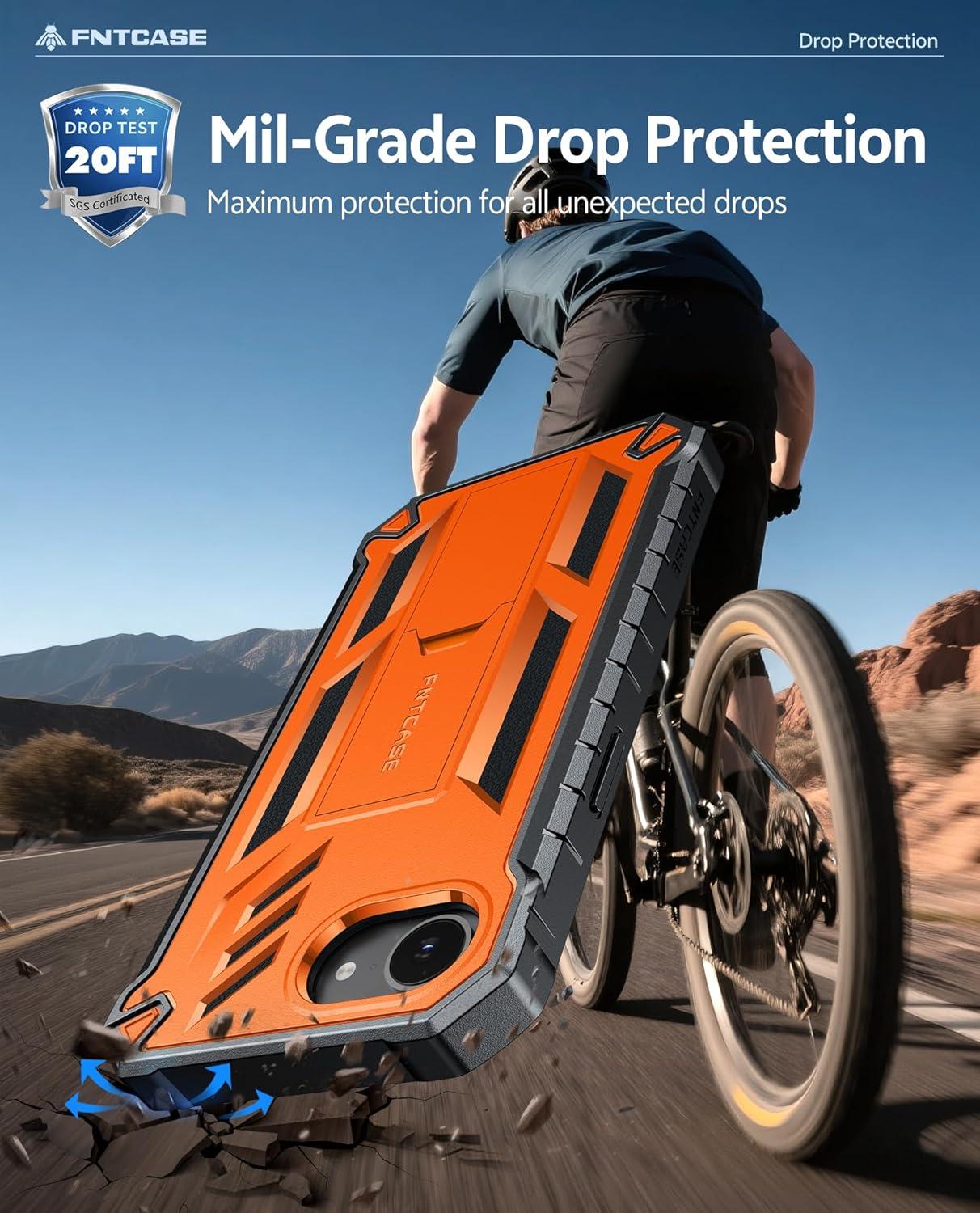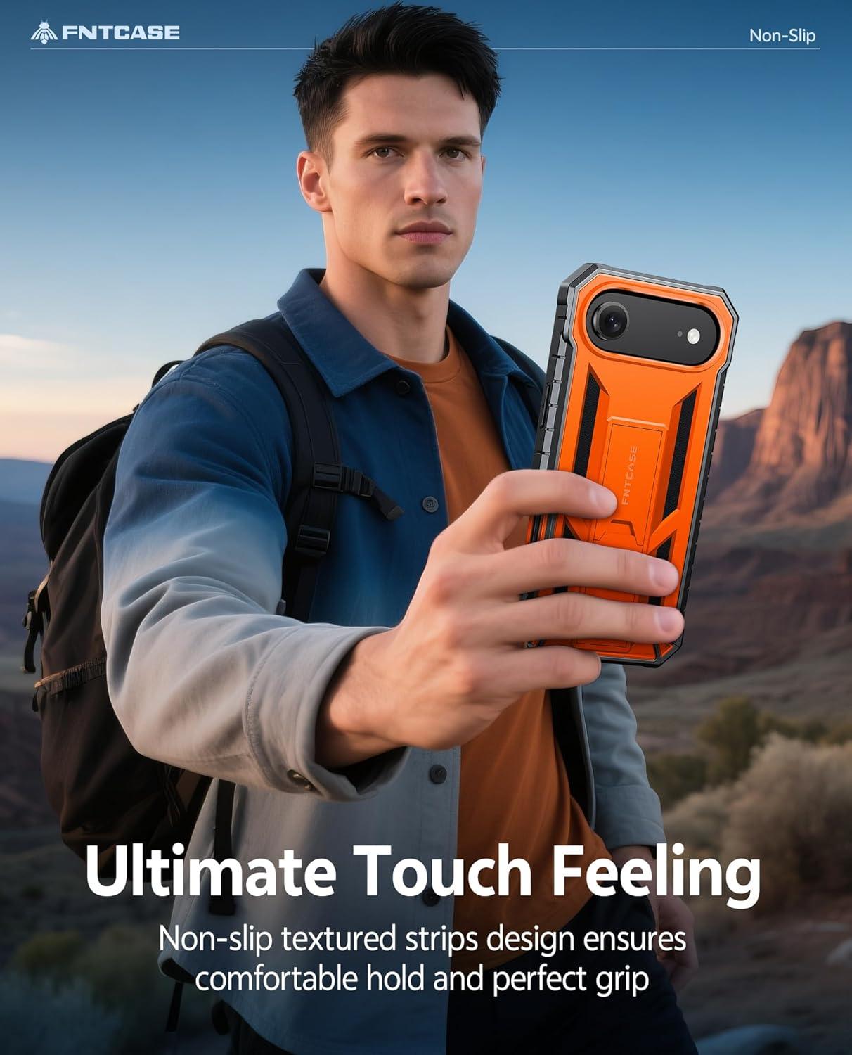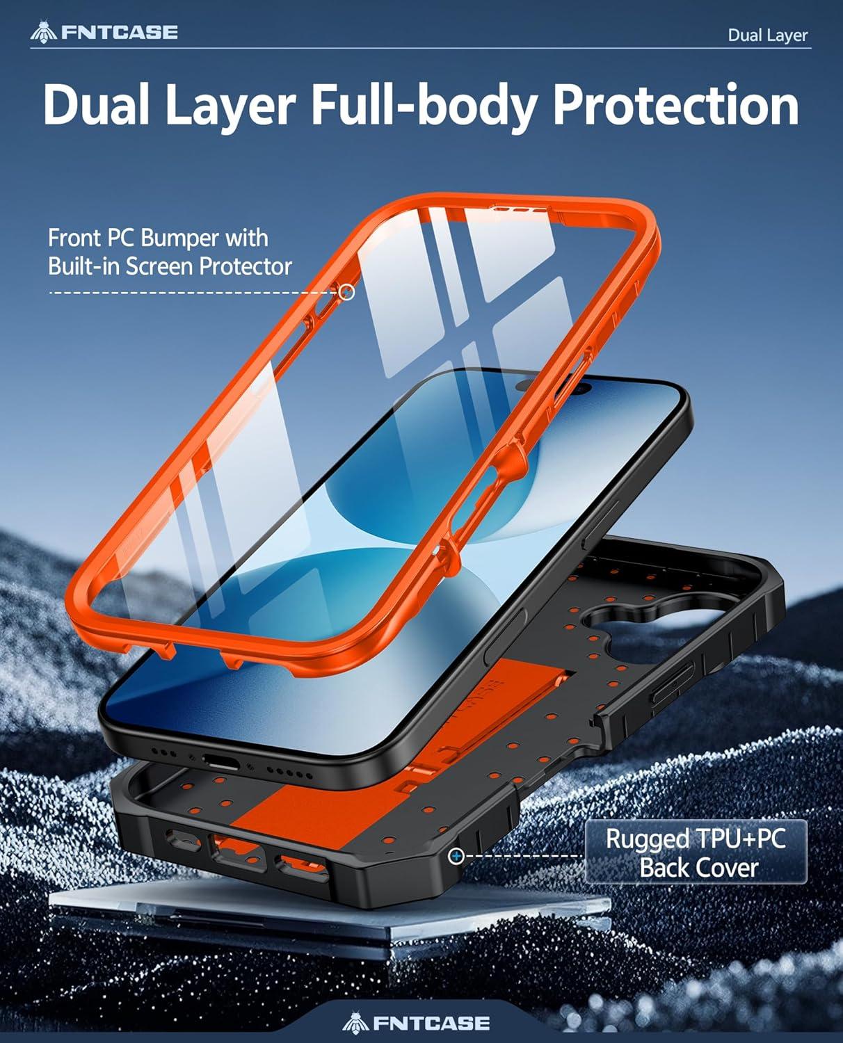 FNTCASE for iPhone 16e Phone Case: Military Grade [Built-in Screen Protector] [Kickstand] Matte Textured Drop Proof Protection Cover | Rugged Shockproof TPU Protective Sturdy Cases 2025 – Black(Orange)