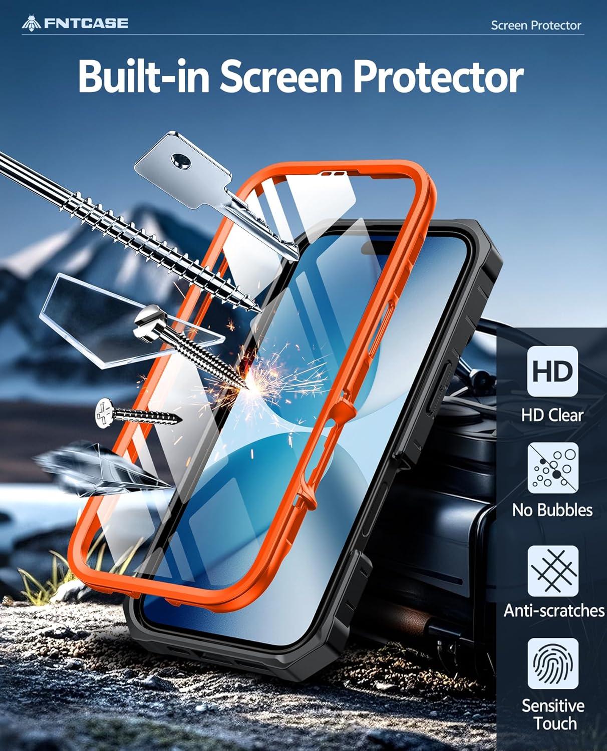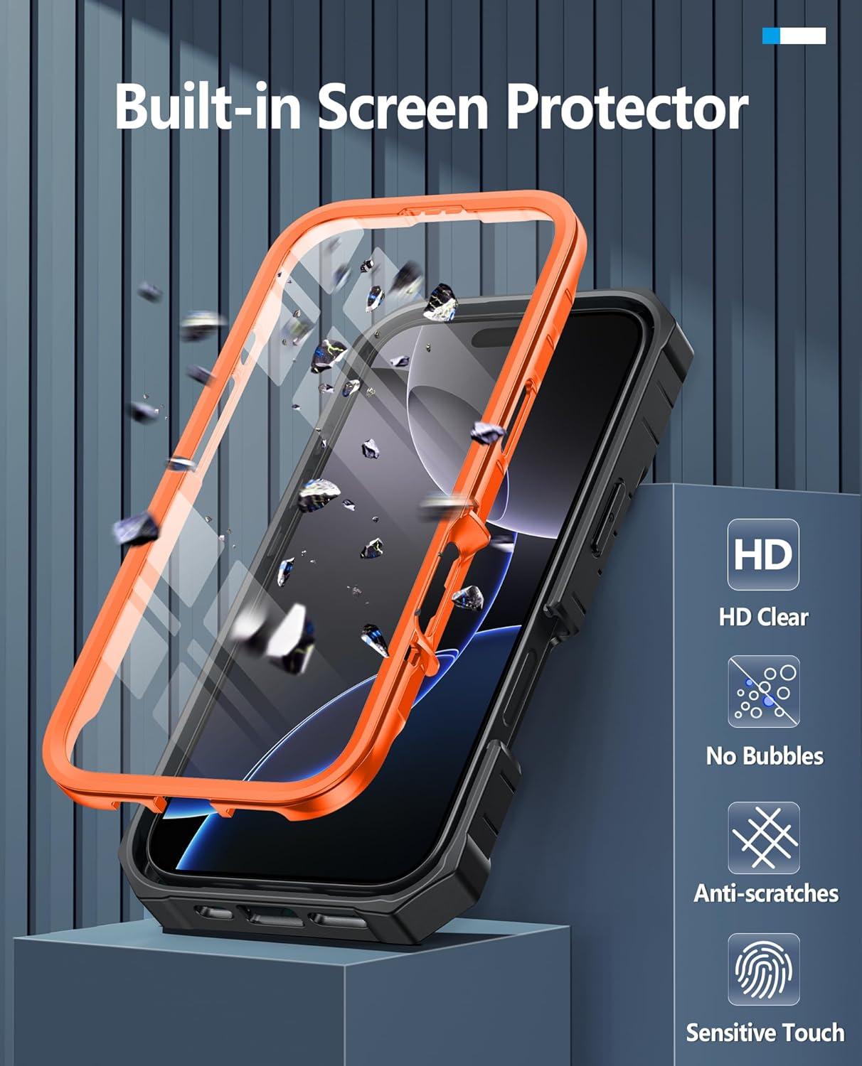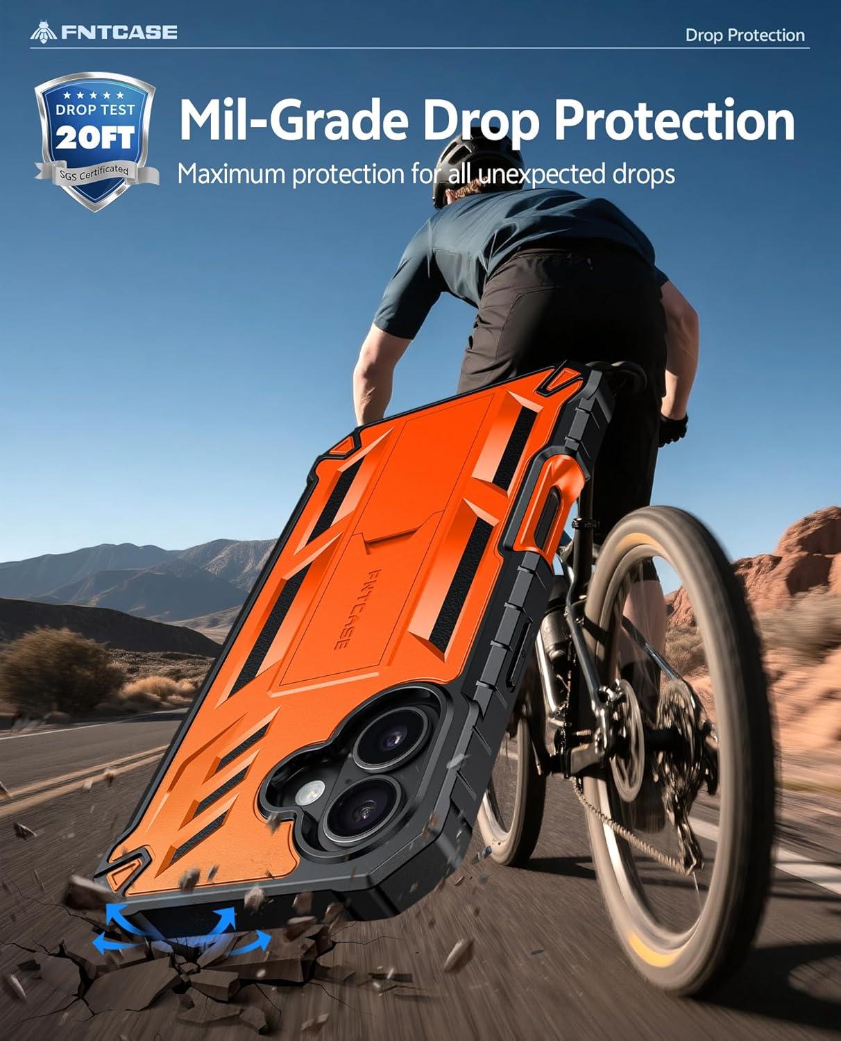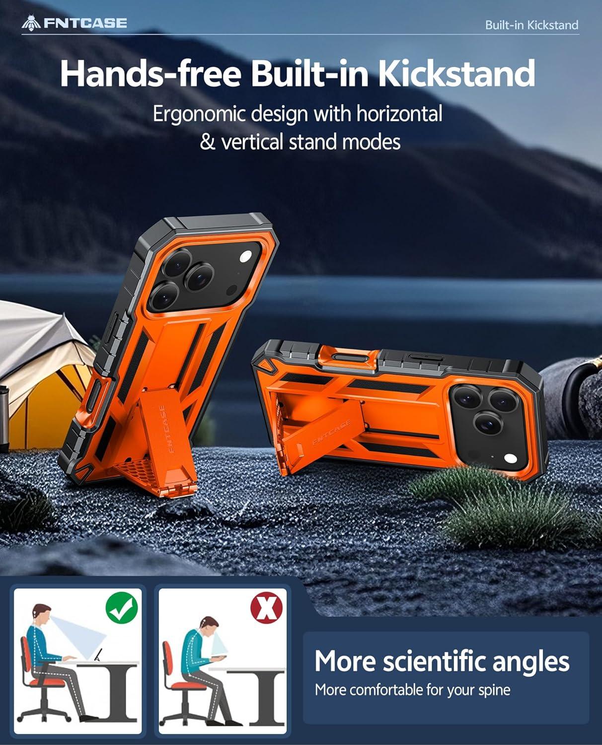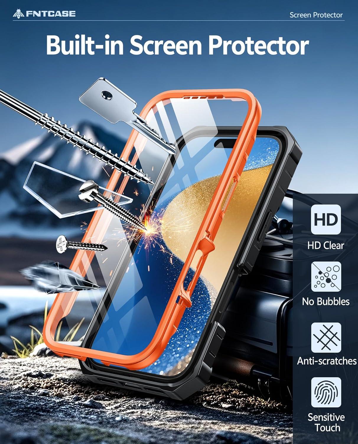 FNTCASE for iPhone 16e Phone Case: Military Grade [Built-in Screen Protector] [Kickstand] Matte Textured Drop Proof Protection Cover | Rugged Shockproof TPU Protective Sturdy Cases 2025 – Black(Orange)