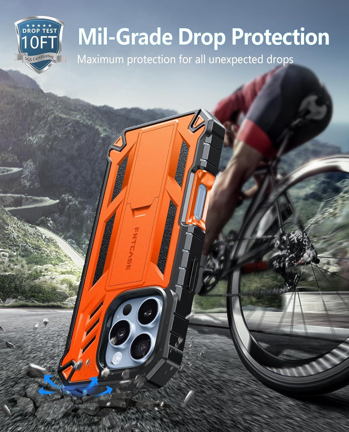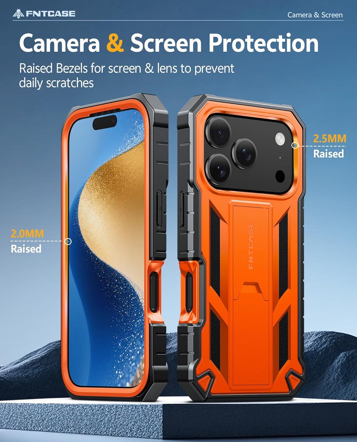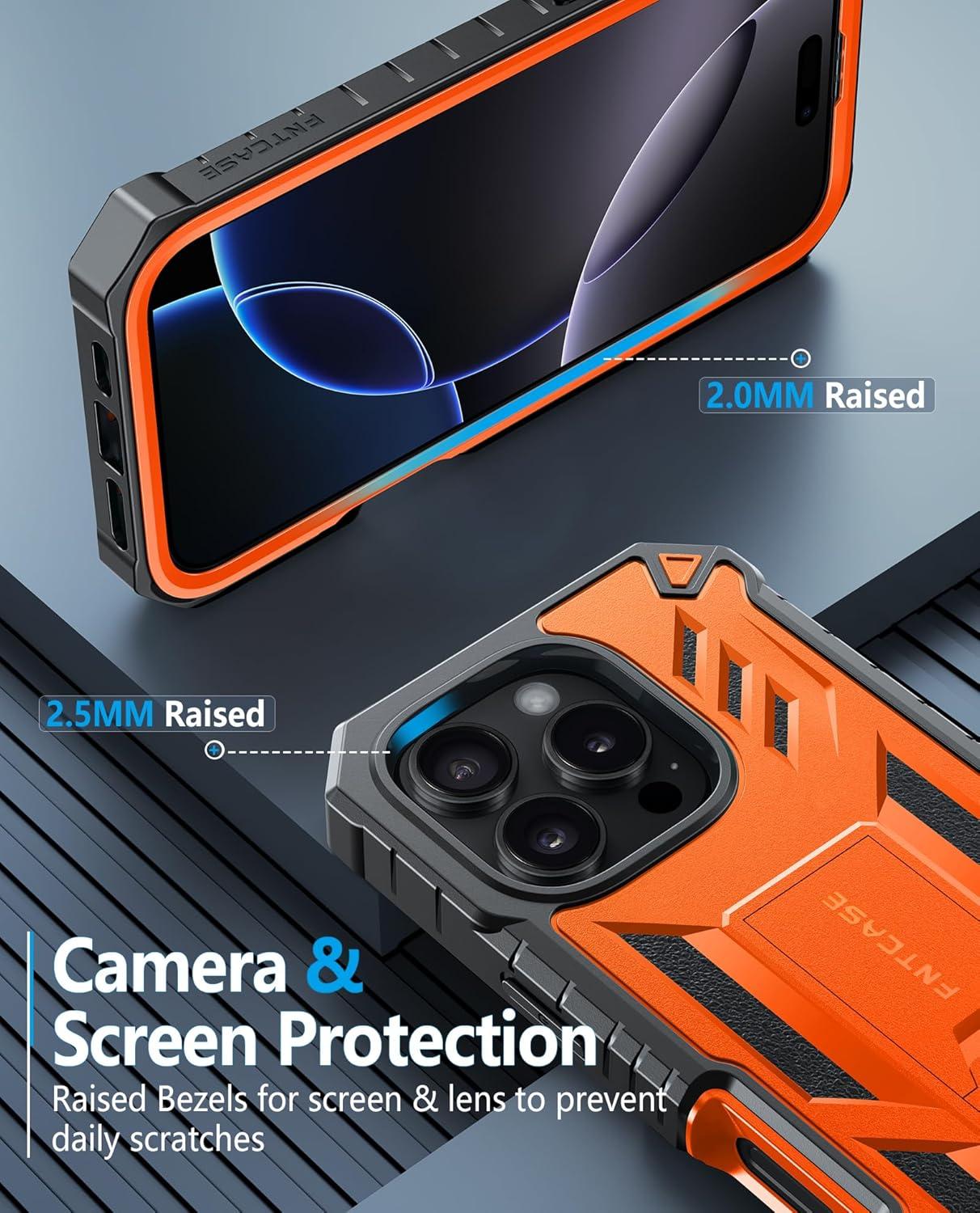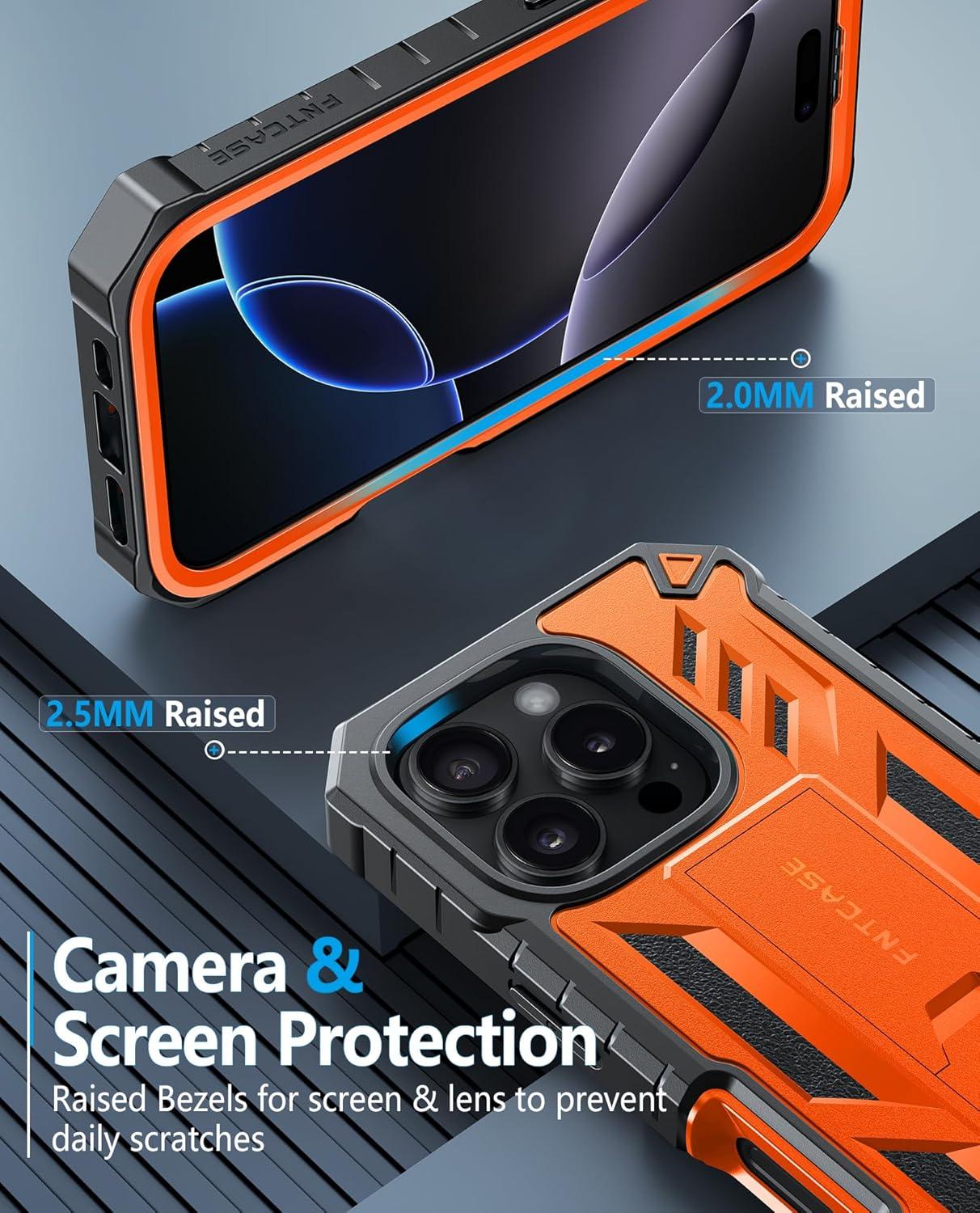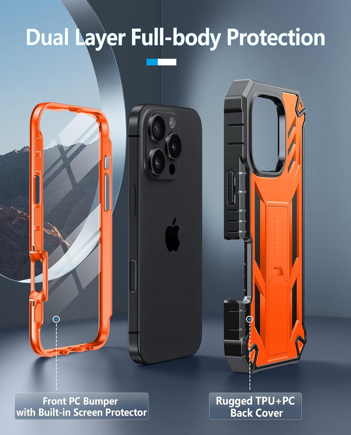 FNTCASE for iPhone 16e Phone Case: Military Grade [Built-in Screen Protector] [Kickstand] Matte Textured Drop Proof Protection Cover | Rugged Shockproof TPU Protective Sturdy Cases 2025 – Black(Orange)