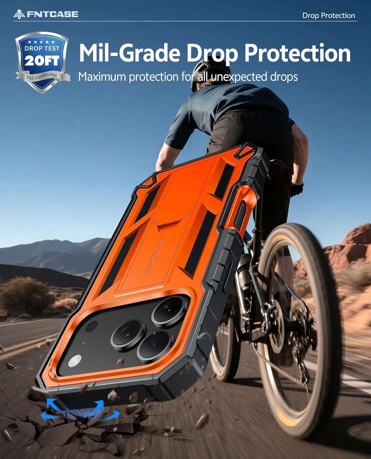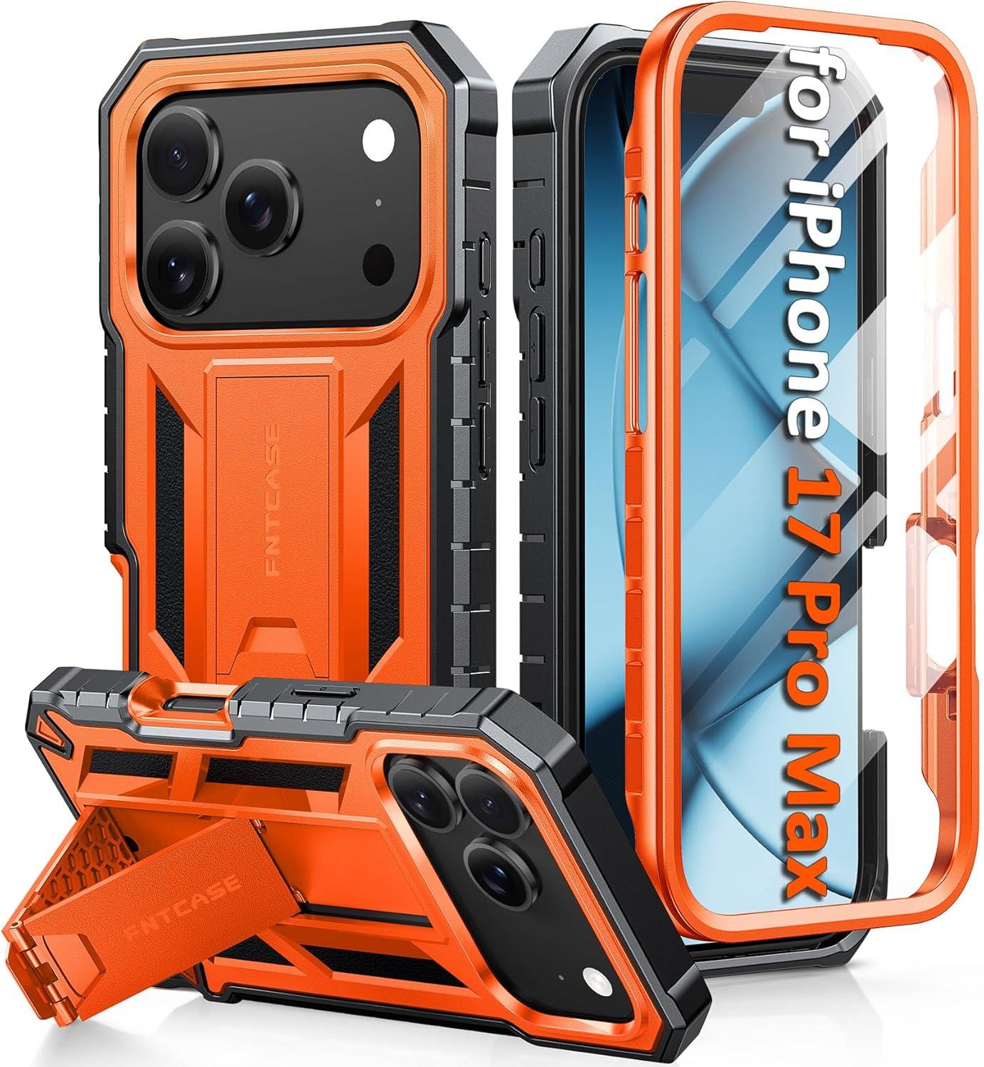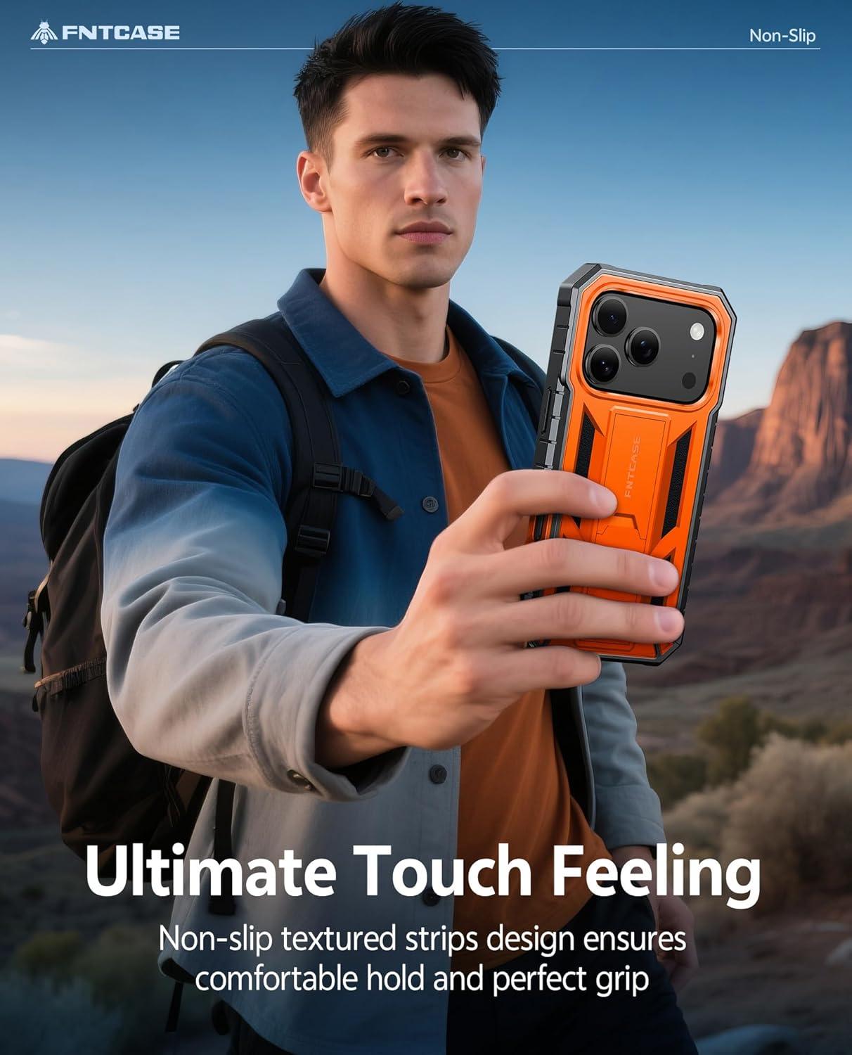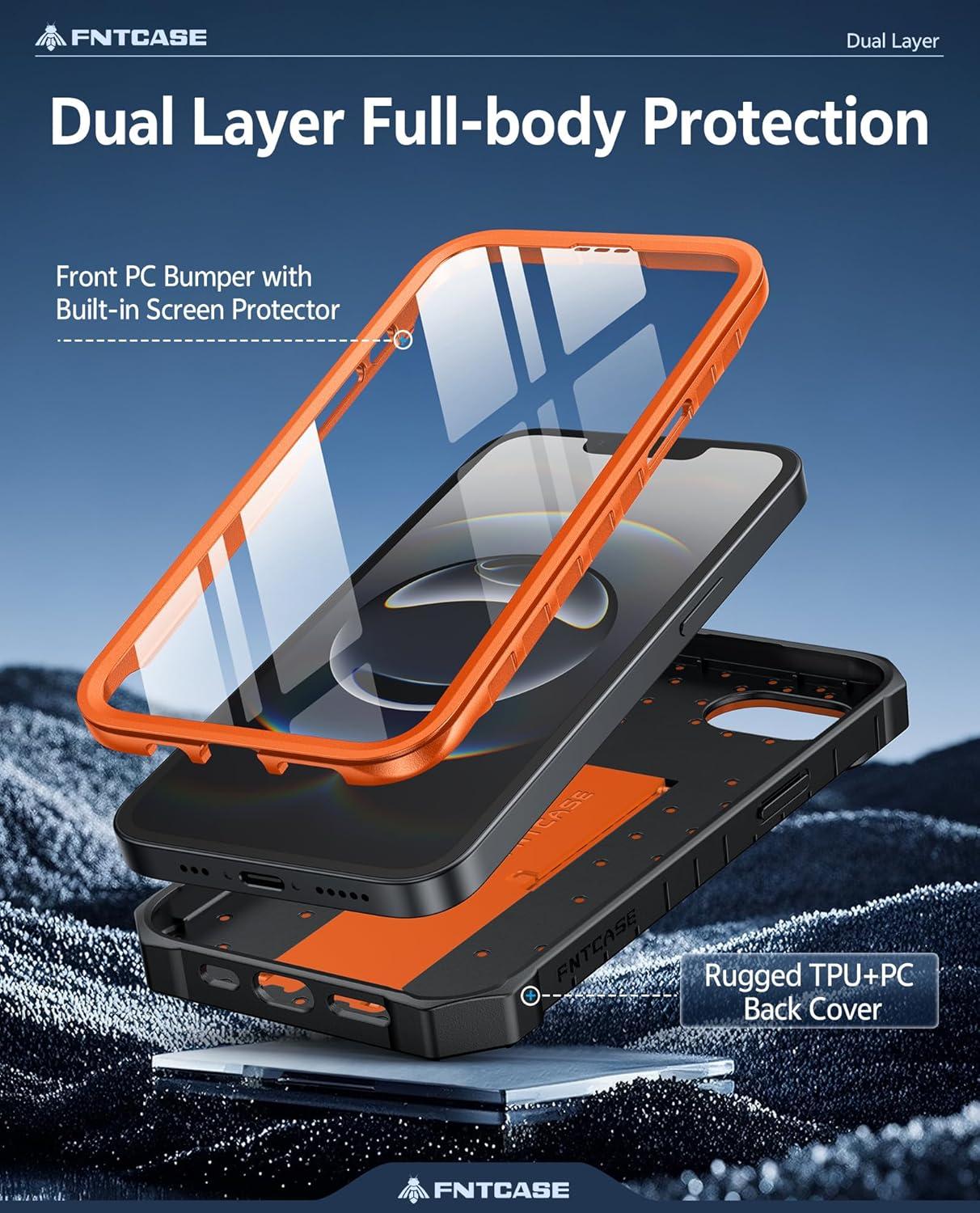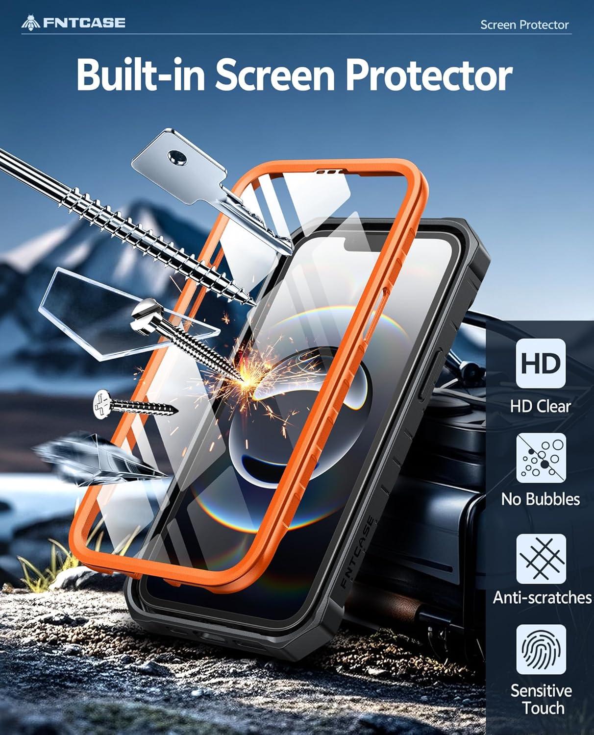 FNTCASE for iPhone 16e Phone Case: Military Grade [Built-in Screen Protector] [Kickstand] Matte Textured Drop Proof Protection Cover | Rugged Shockproof TPU Protective Sturdy Cases 2025 – Black(Orange)