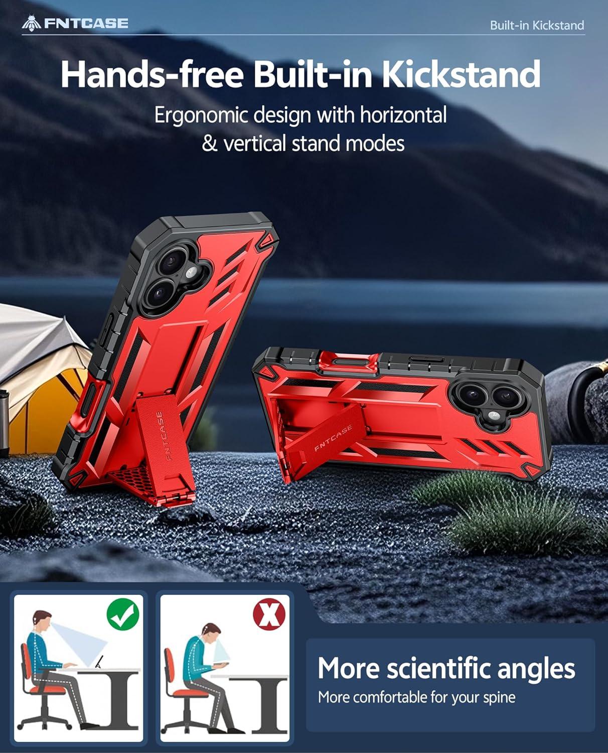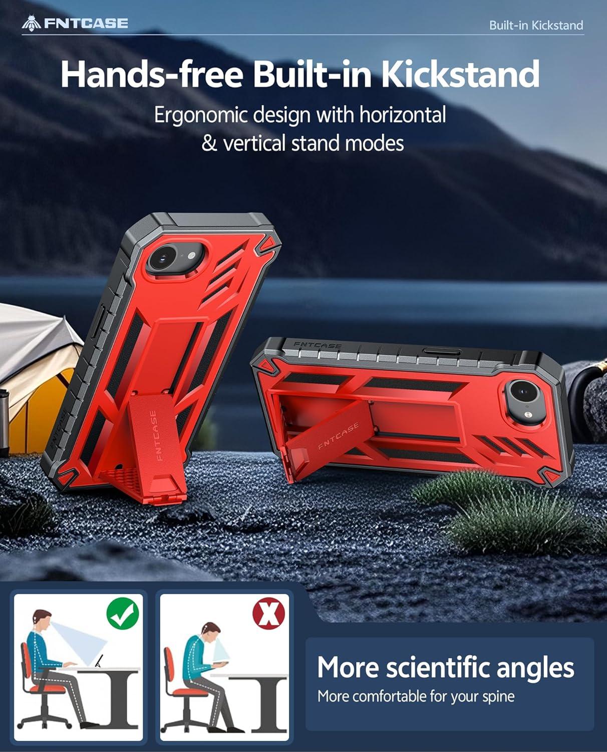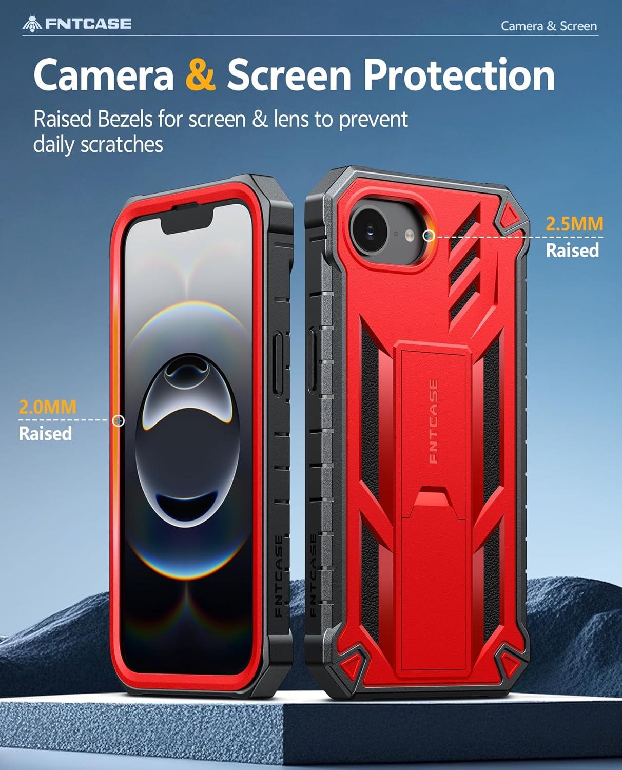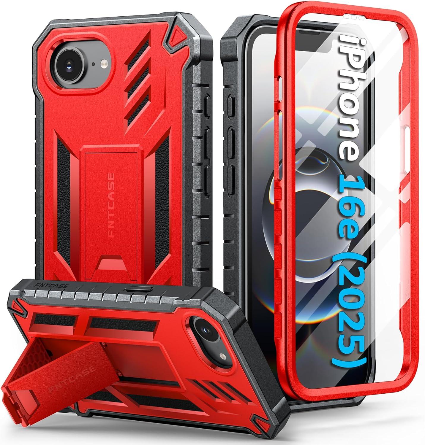 FNTCASE for iPhone 16e Phone Case: Military Grade [Built-in Screen Protector] [Kickstand] Matte Textured Drop Proof Protection Cover | Rugged Shockproof TPU Protective Sturdy Cases 2025 – Black(Red)