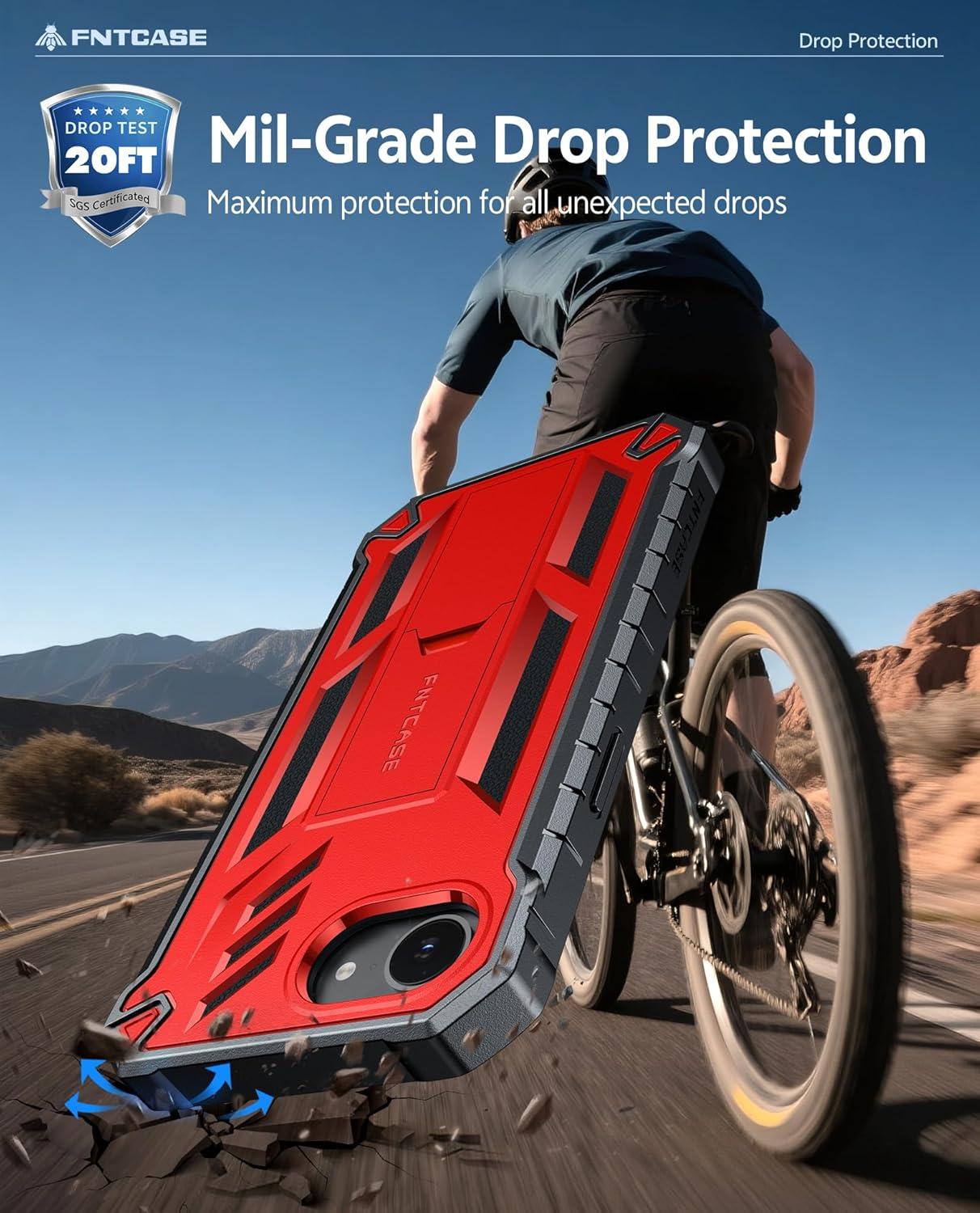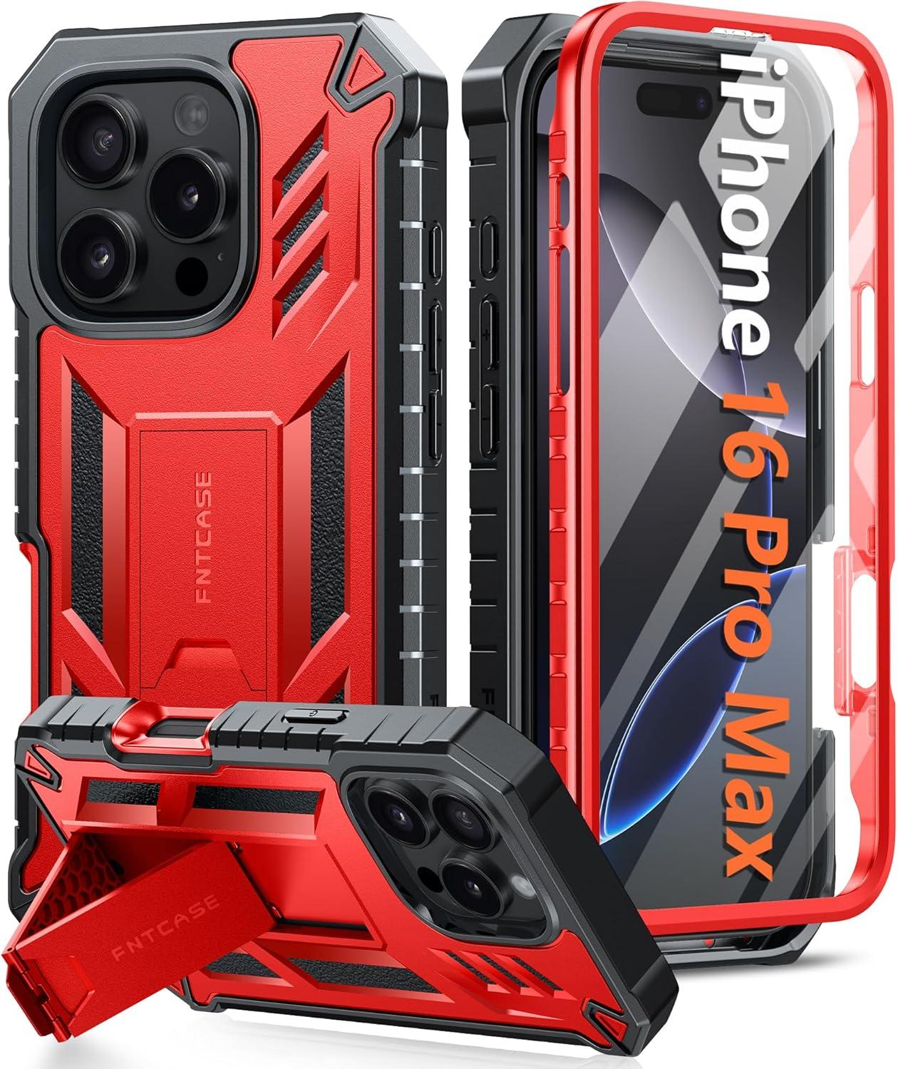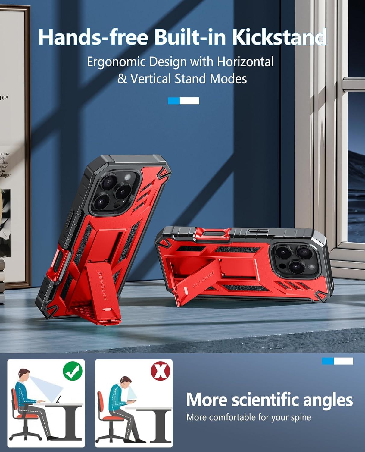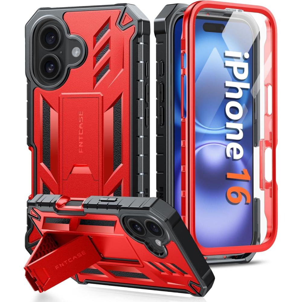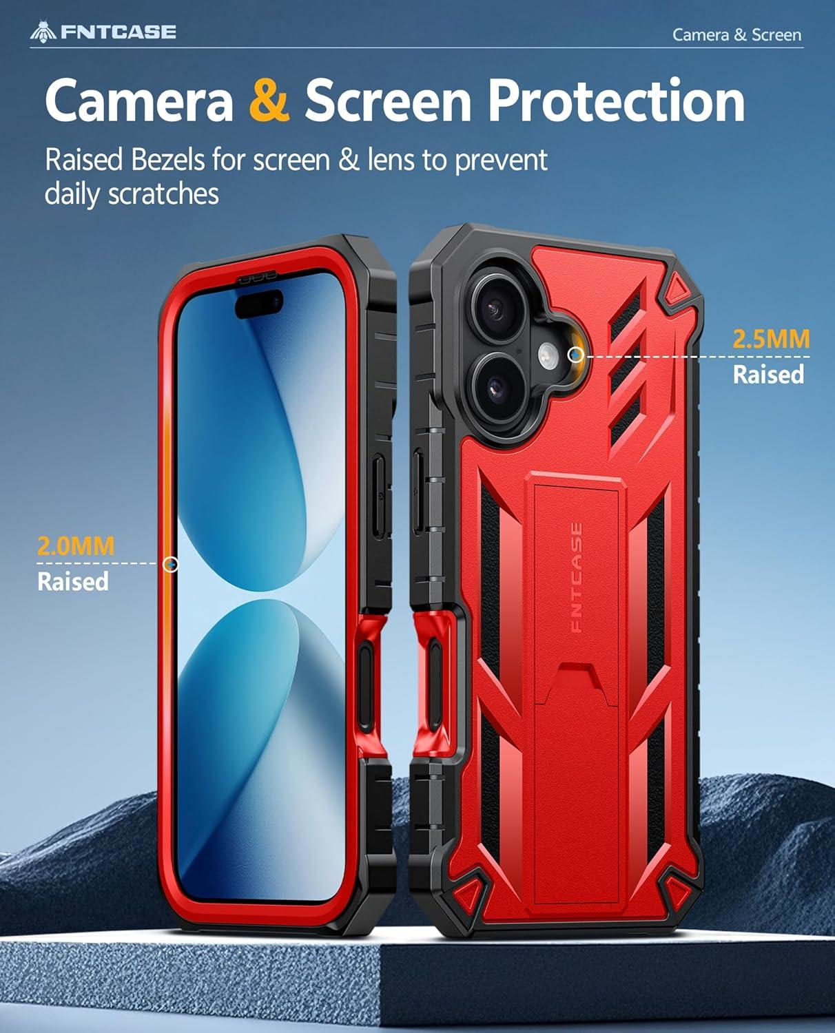 FNTCASE for iPhone 16e Phone Case: Military Grade [Built-in Screen Protector] [Kickstand] Matte Textured Drop Proof Protection Cover | Rugged Shockproof TPU Protective Sturdy Cases 2025 – Black(Red)
