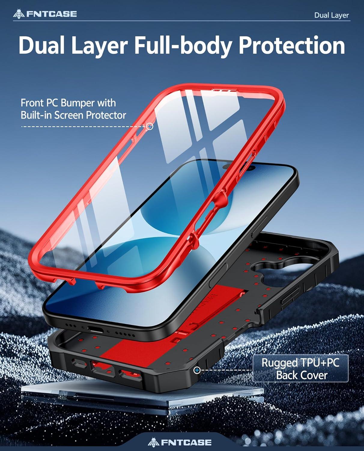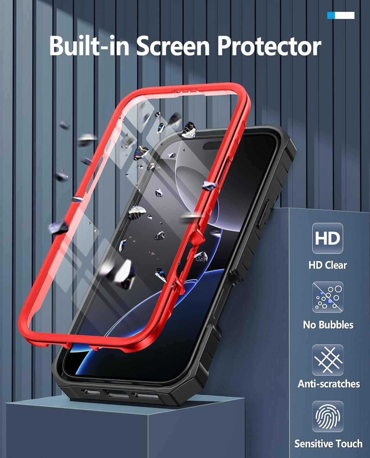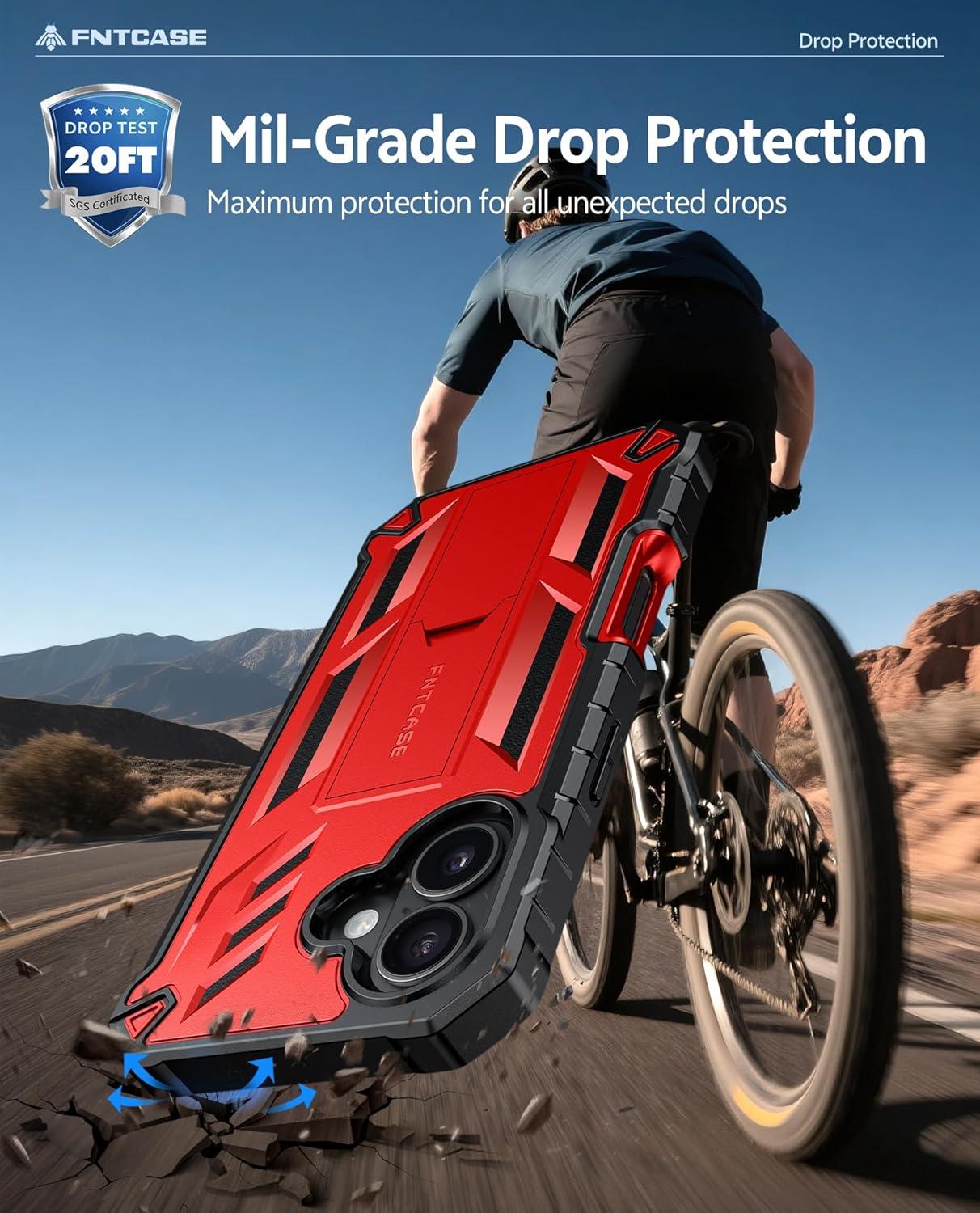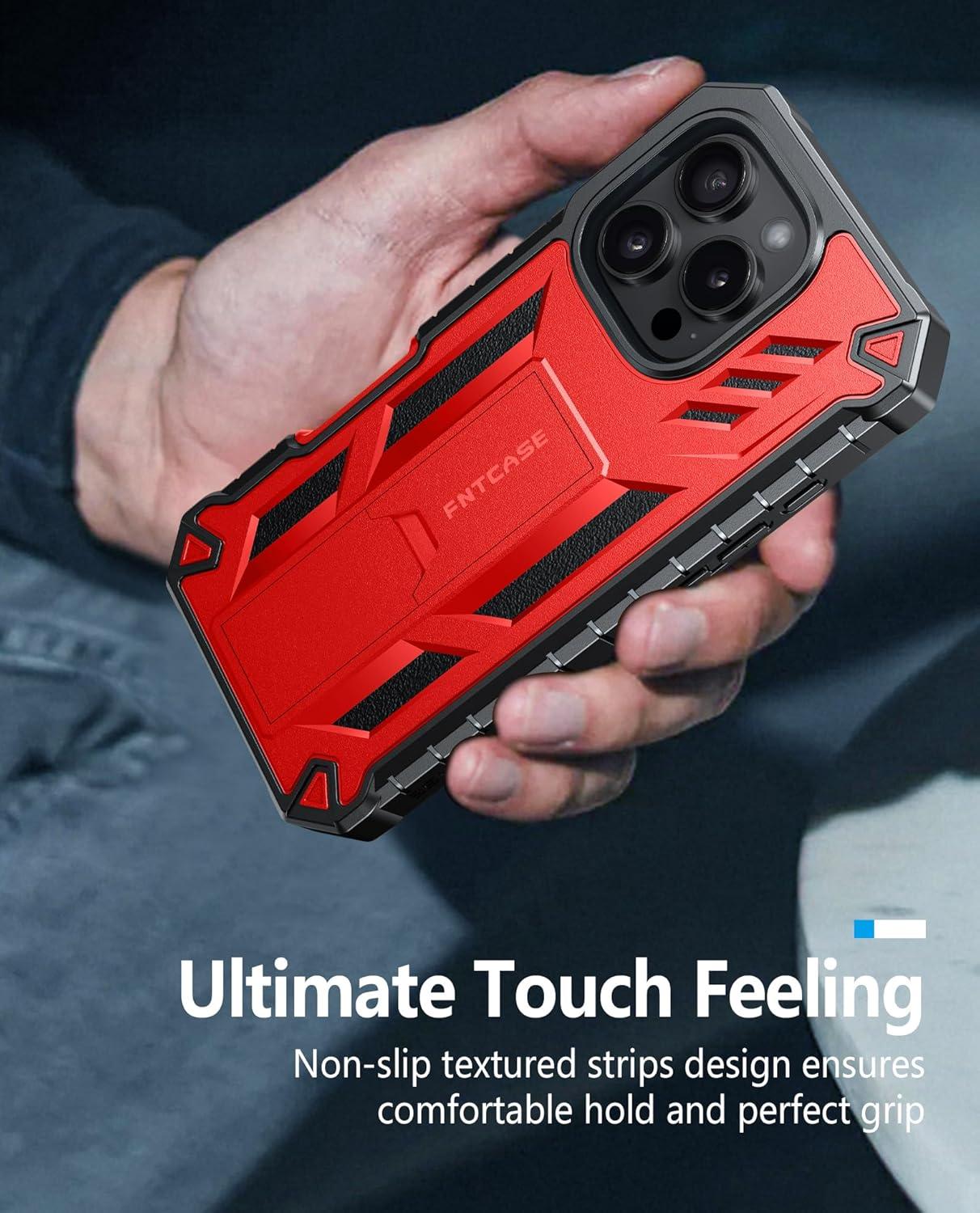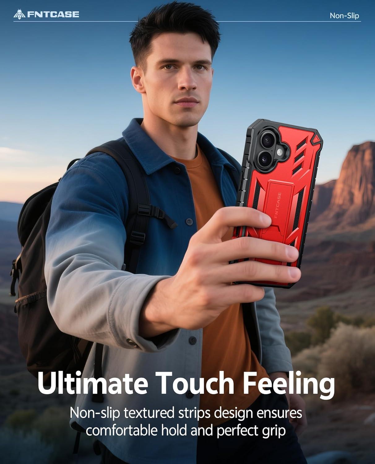 FNTCASE for iPhone 16e Phone Case: Military Grade [Built-in Screen Protector] [Kickstand] Matte Textured Drop Proof Protection Cover | Rugged Shockproof TPU Protective Sturdy Cases 2025 – Black(Red)