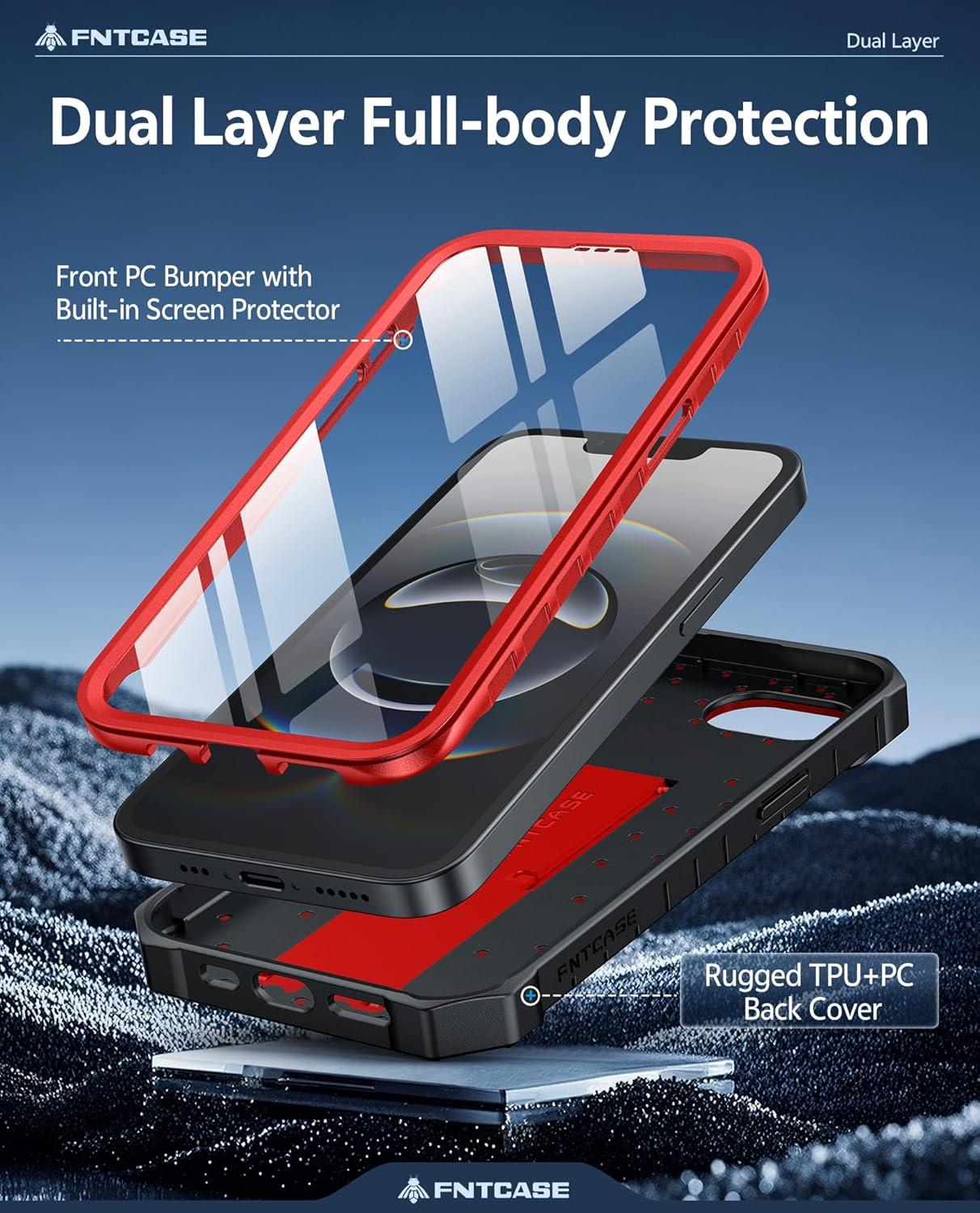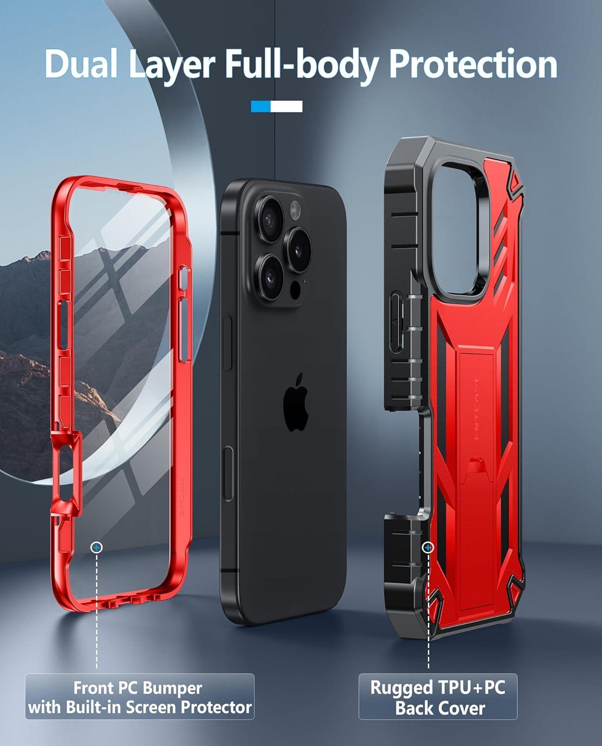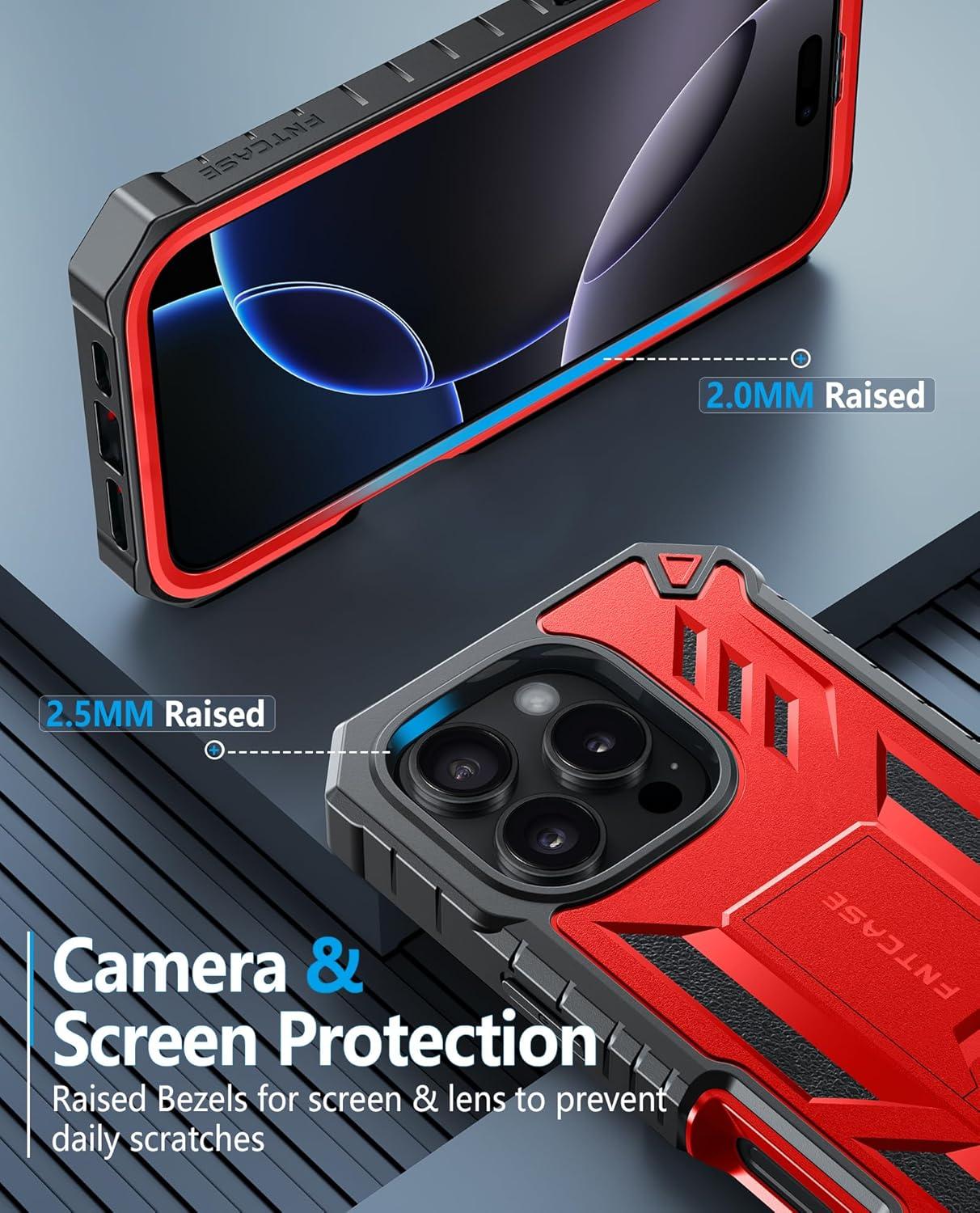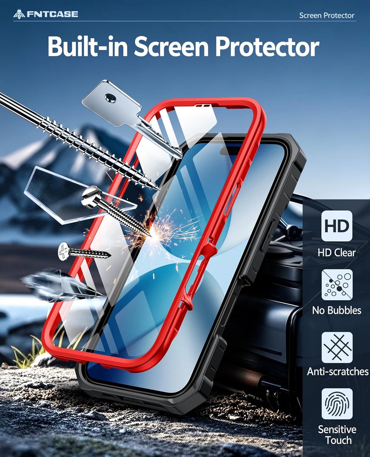 FNTCASE for iPhone 16e Phone Case: Military Grade [Built-in Screen Protector] [Kickstand] Matte Textured Drop Proof Protection Cover | Rugged Shockproof TPU Protective Sturdy Cases 2025 – Black(Red)