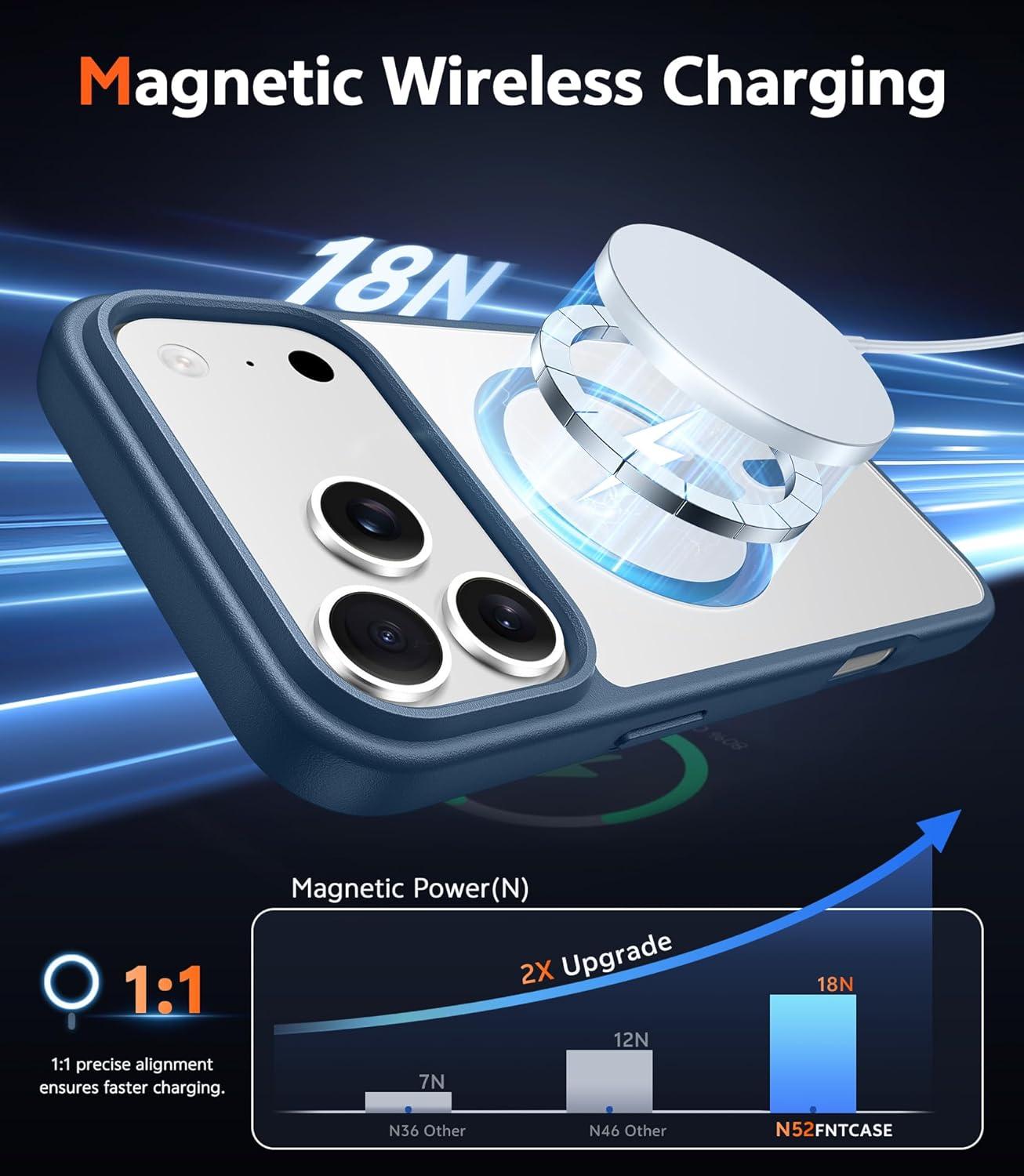 Strong Magnetic Attraction: Compatible for Magnetic chargers and other Qi Wireless chargers without signal influence. The iPhone 17 Pro magnetic case has built-in 38 super N52 magnets. Its magnetic attraction reaches 2400 gf