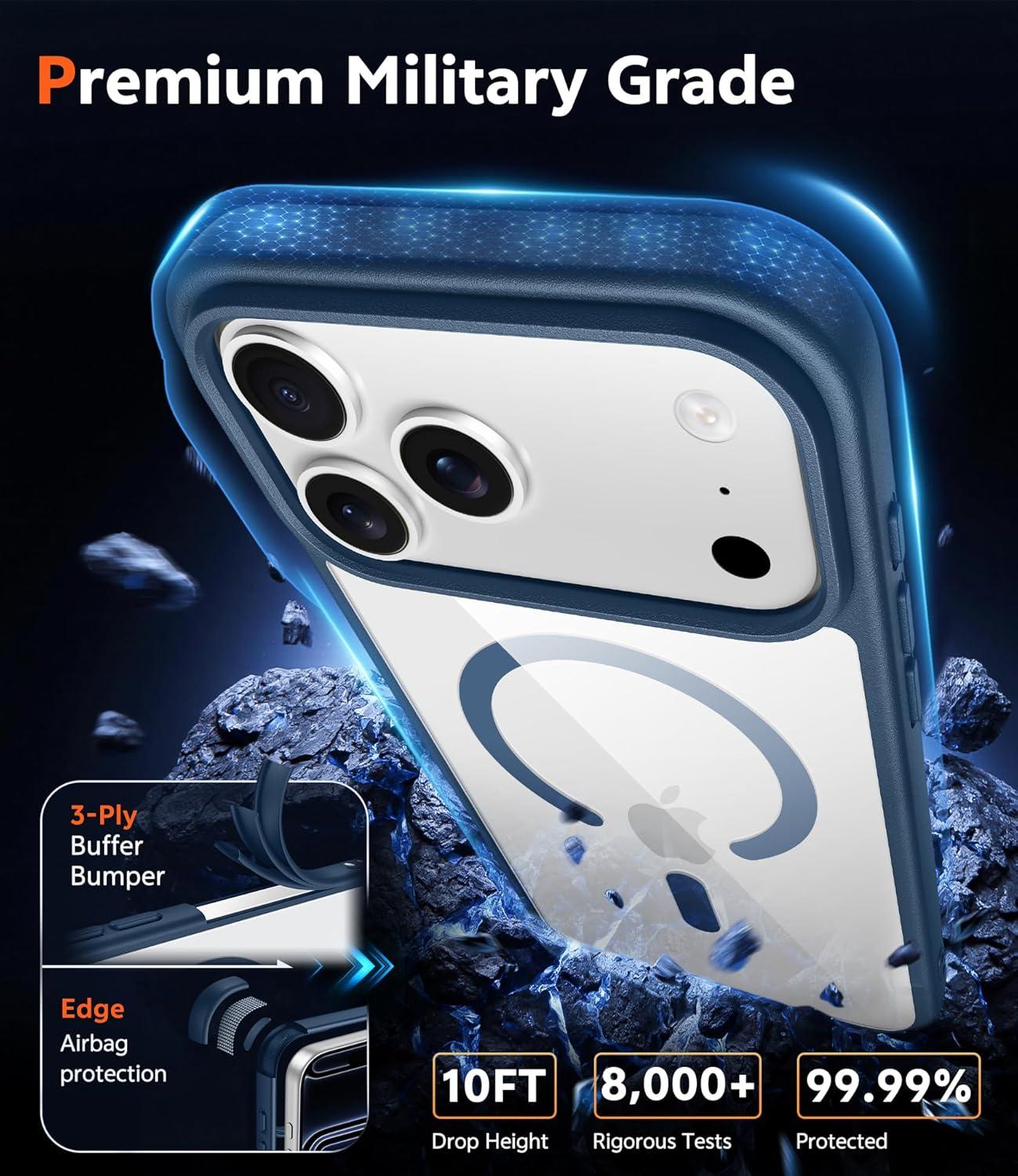 10FT Military Grade Protection: Passed Military Drop Tested up to 10 FT. This iPhone 17 Pro clear case backplane is made with rigid polycarbonate and flexible shockproof TPU bumpers around the edge and features 4 built-in corner Airbags to absorb impact