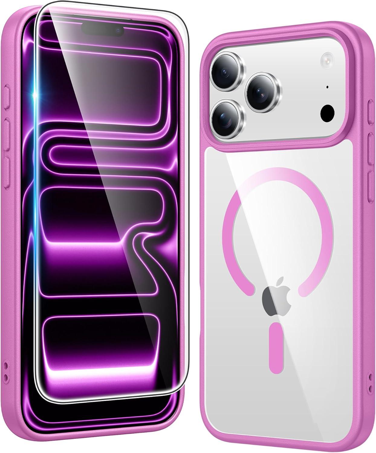 FNTCASE for iPhone 17 Pro Case, Compatible with Magsafe, Clear Transparent Magnetic Shockproof Protective Rugged Phone Cover with Screen Protector – 6.3 inch (A-Clear)(B-Pink)