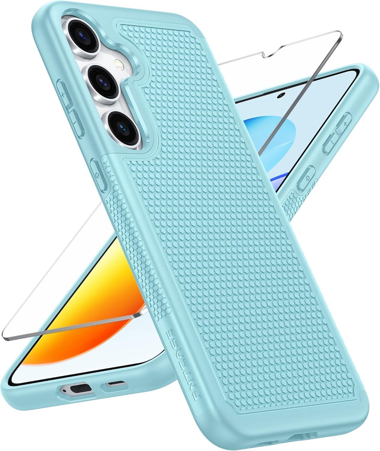 FNTCASE for Samsung Galaxy S24 Case: Dual Layer Heavy Duty Cell Phone Protective Cover Shockproof Rugged with Non-Slip Textured – Military Drop Protection Bumper Tough – 2024, 6.2inch Black(Teal)