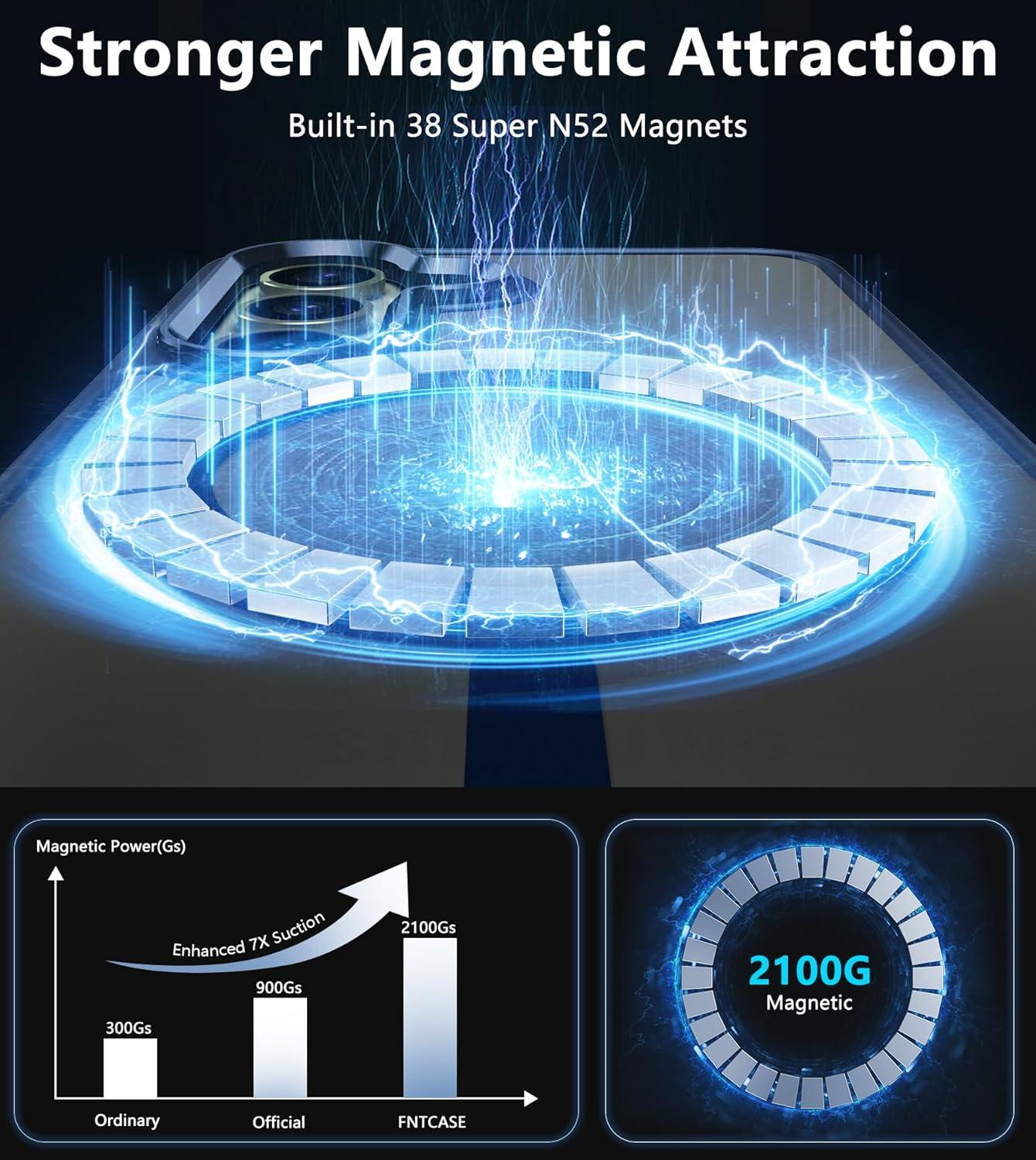 Strong Magnetic Attraction: For Magnetic chargers and other Qi Wireless chargers without signal influence. The Samsung Galaxy Z Fold 7 case has built-in 38 super N52 magnets. Its magnetic attraction reaches 2400 gf, which is almost 7X stronger than ordinary, therefore it won't fall off no matter how it shakes when you are charging