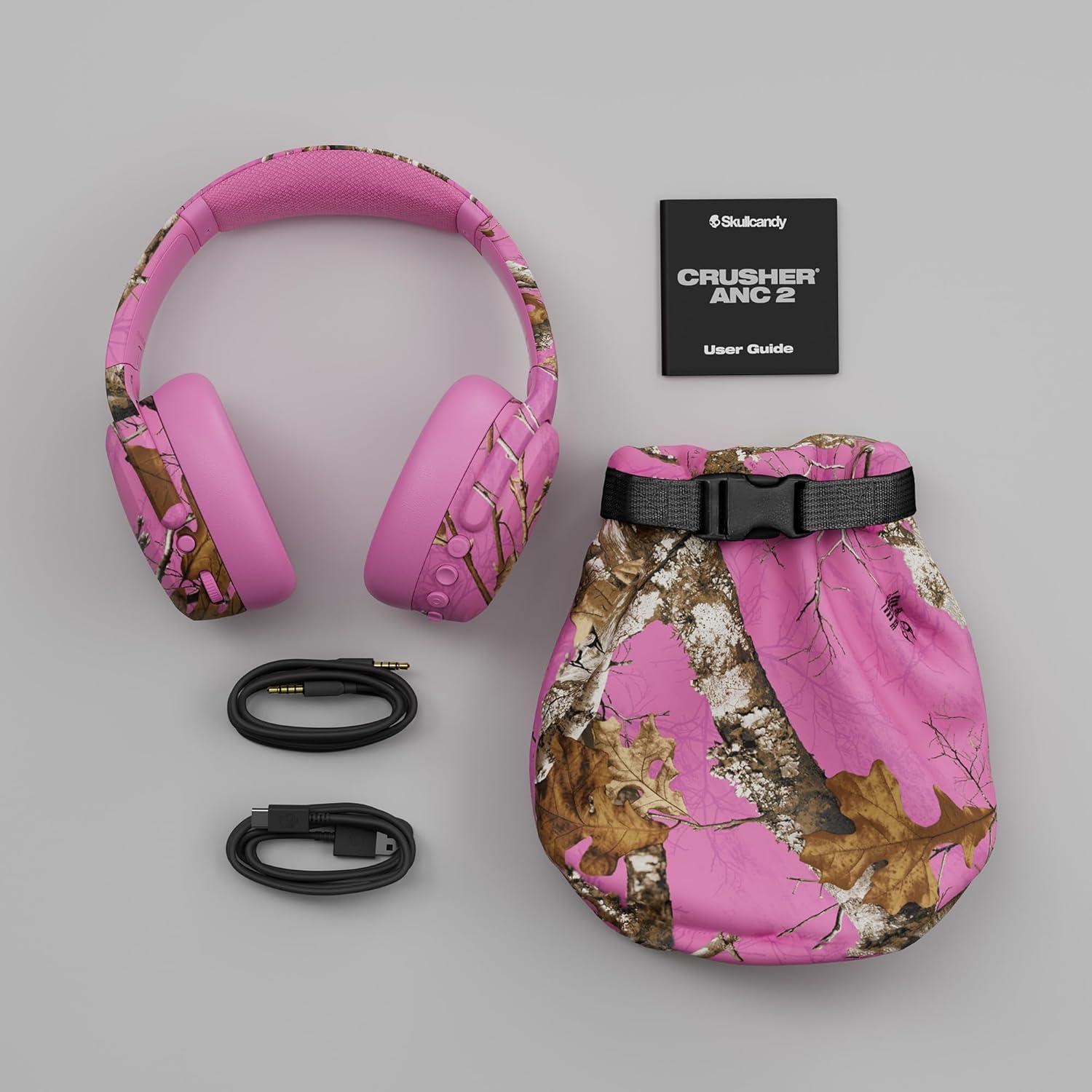 Skullcandy Crusher ANC 2 Wireless Over-Ear Bluetooth Headphones with Extra USB-C Charging Cable, Multi-Sensory Bass, Active Noise Cancelling, 60 Hours Battery, Microphone iPhone Android – Bone(Realtree Edge Colors Pink)