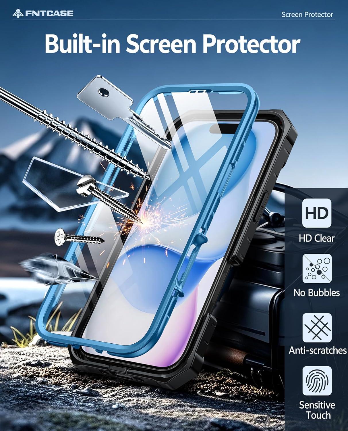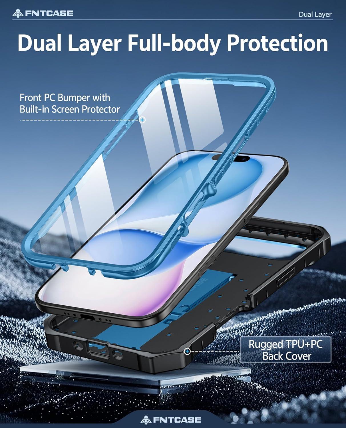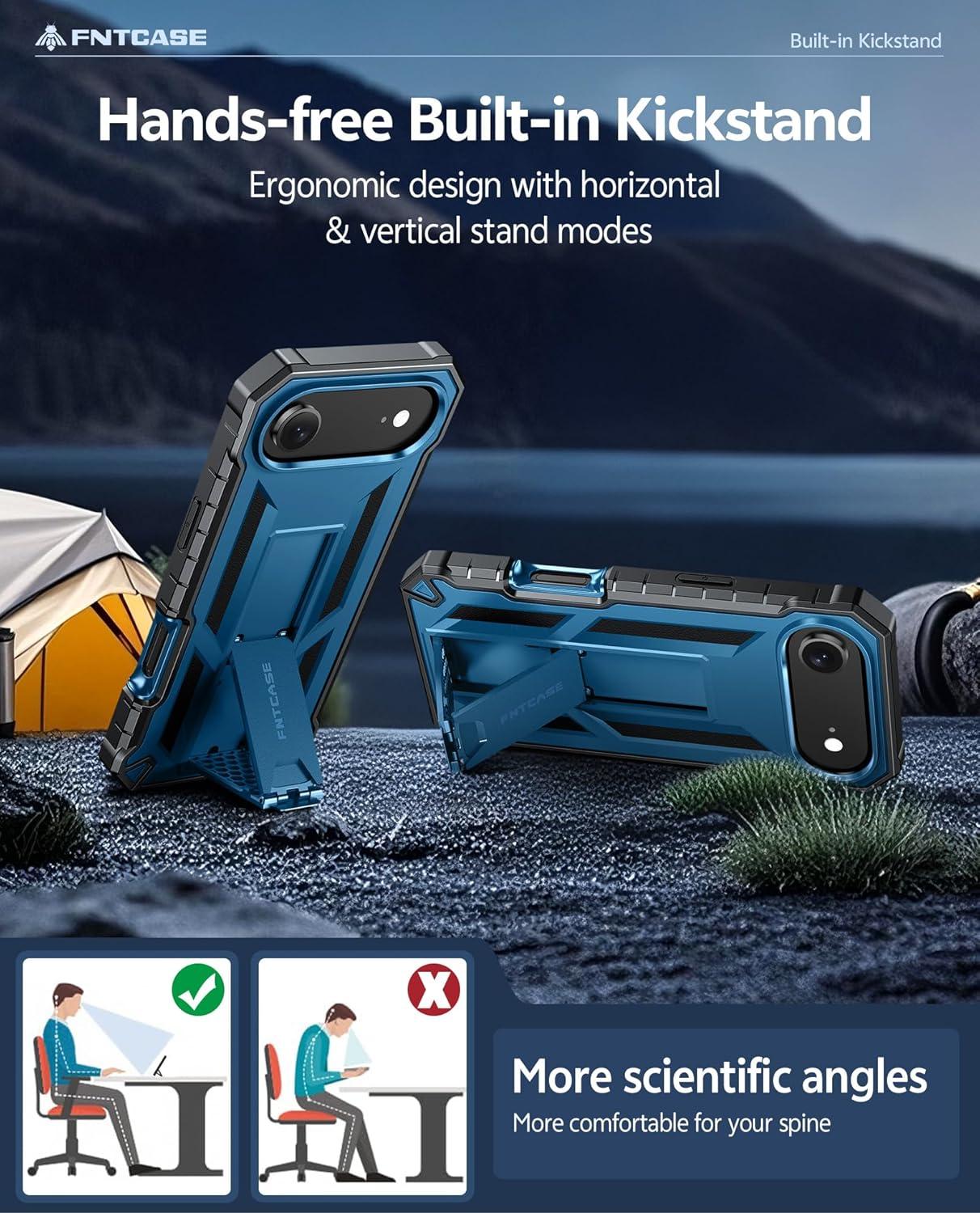 FNTCASE for iPhone 16e Phone Case: Military Grade [Built-in Screen Protector] [Kickstand] Matte Textured Drop Proof Protection Cover | Rugged Shockproof TPU Protective Sturdy Cases 2025 – Black(Blue)