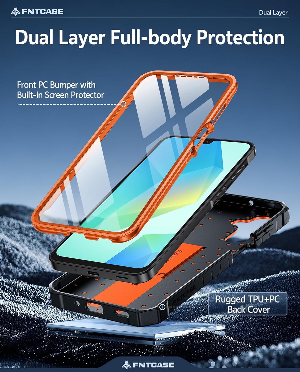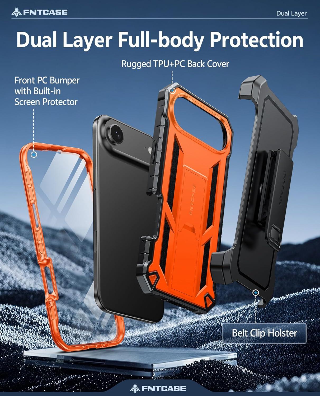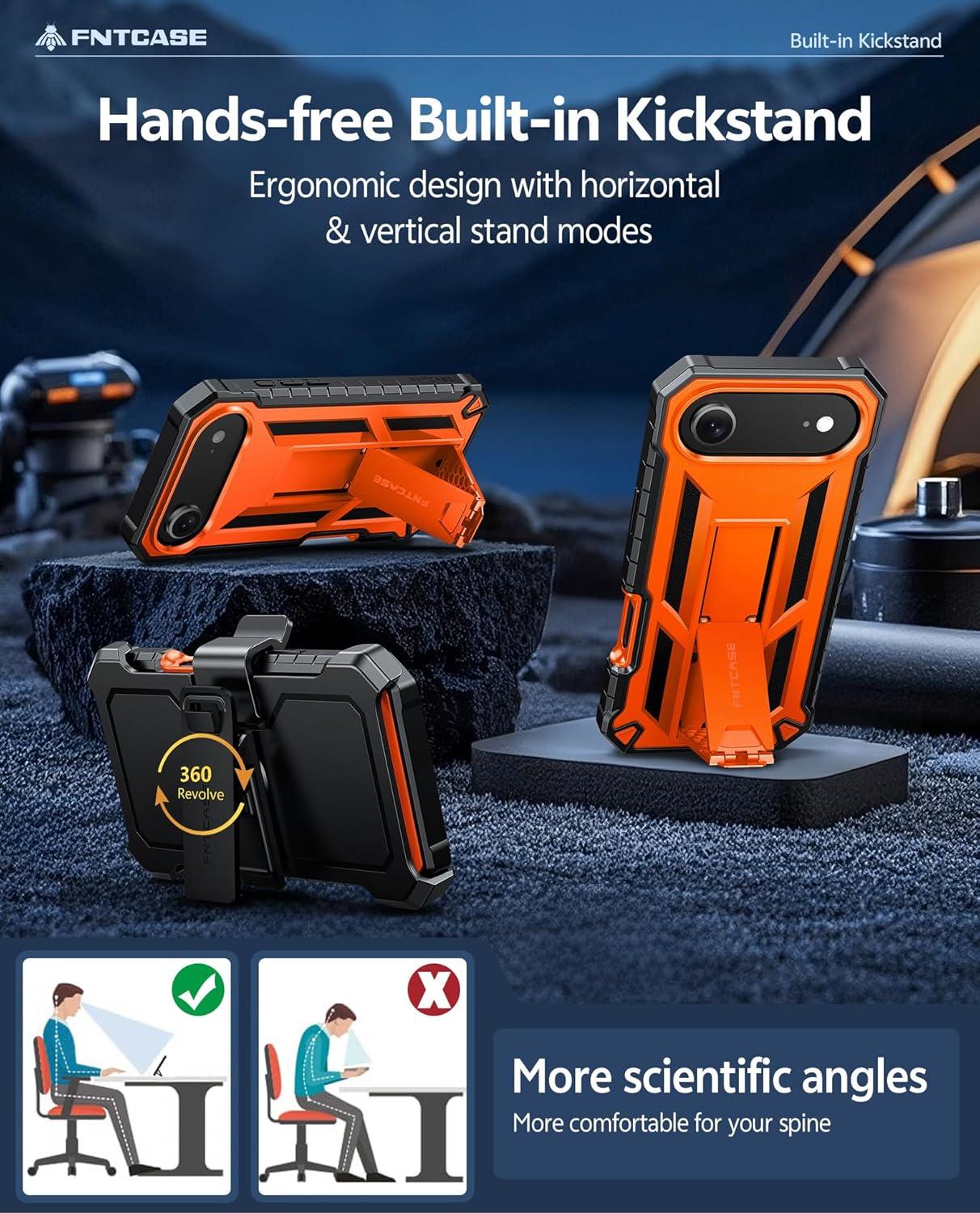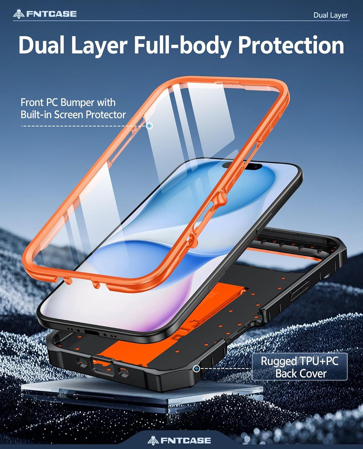 FNTCASE for iPhone 16e 2025 Case: for iPhone 16E Military Grade Rugged Phone Cover with Kickstand & Holster | Shockproof TPU Protection Bumper Matte Textured Design | Heavy Duty Protector (Black)(Orange)
