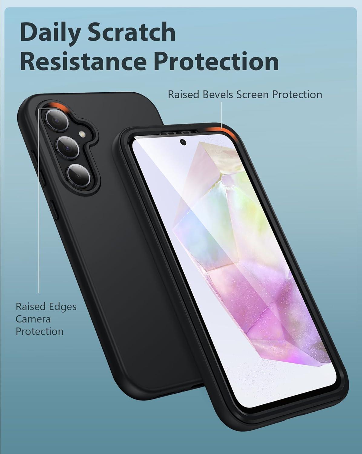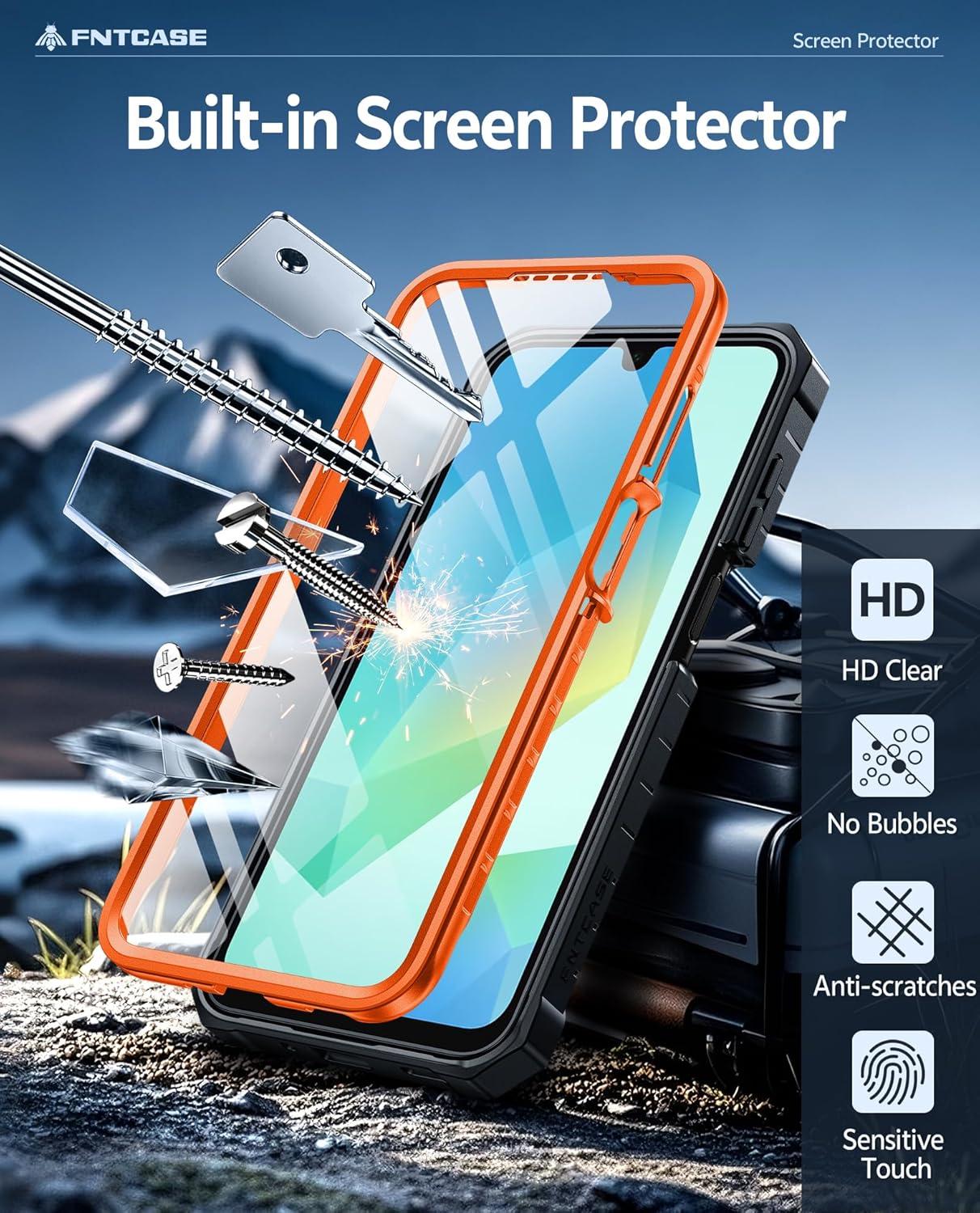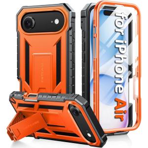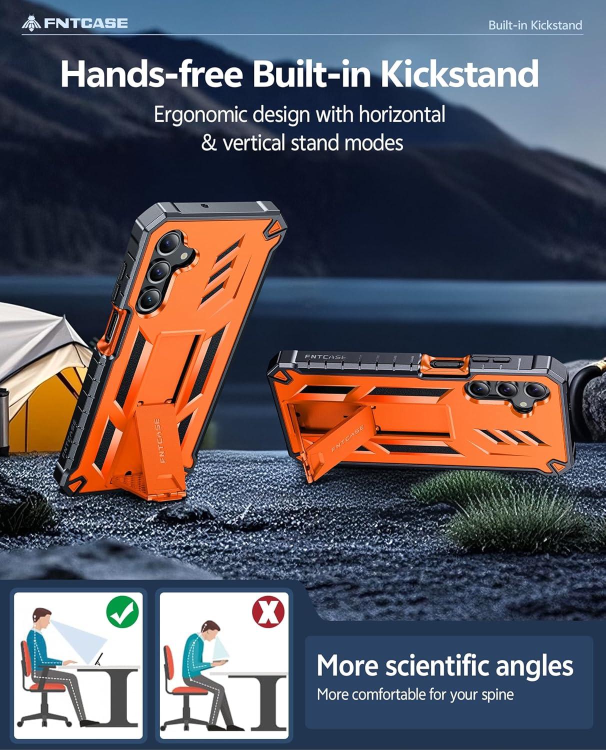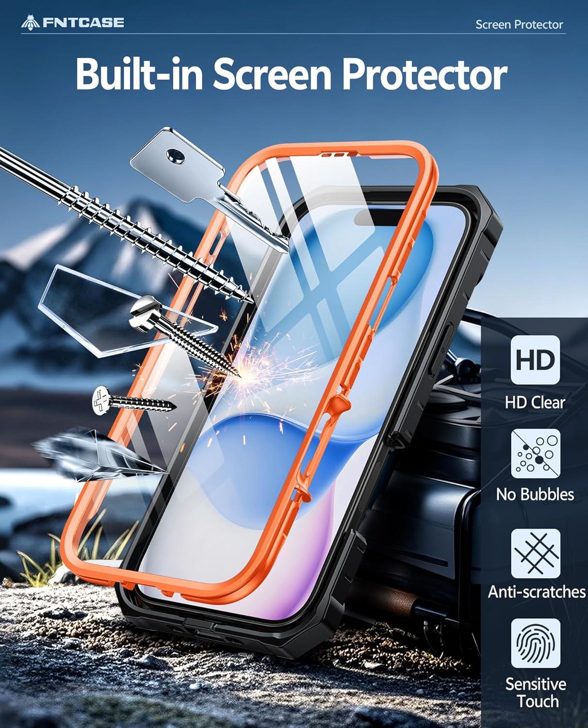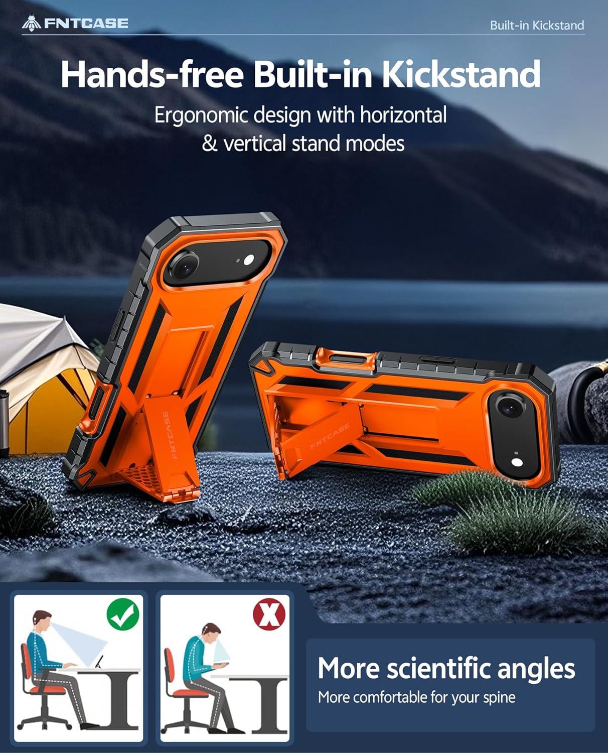 FNTCASE for iPhone 16e Phone Case: Military Grade [Built-in Screen Protector] [Kickstand] Matte Textured Drop Proof Protection Cover | Rugged Shockproof TPU Protective Sturdy Cases 2025 – Black(Orange)