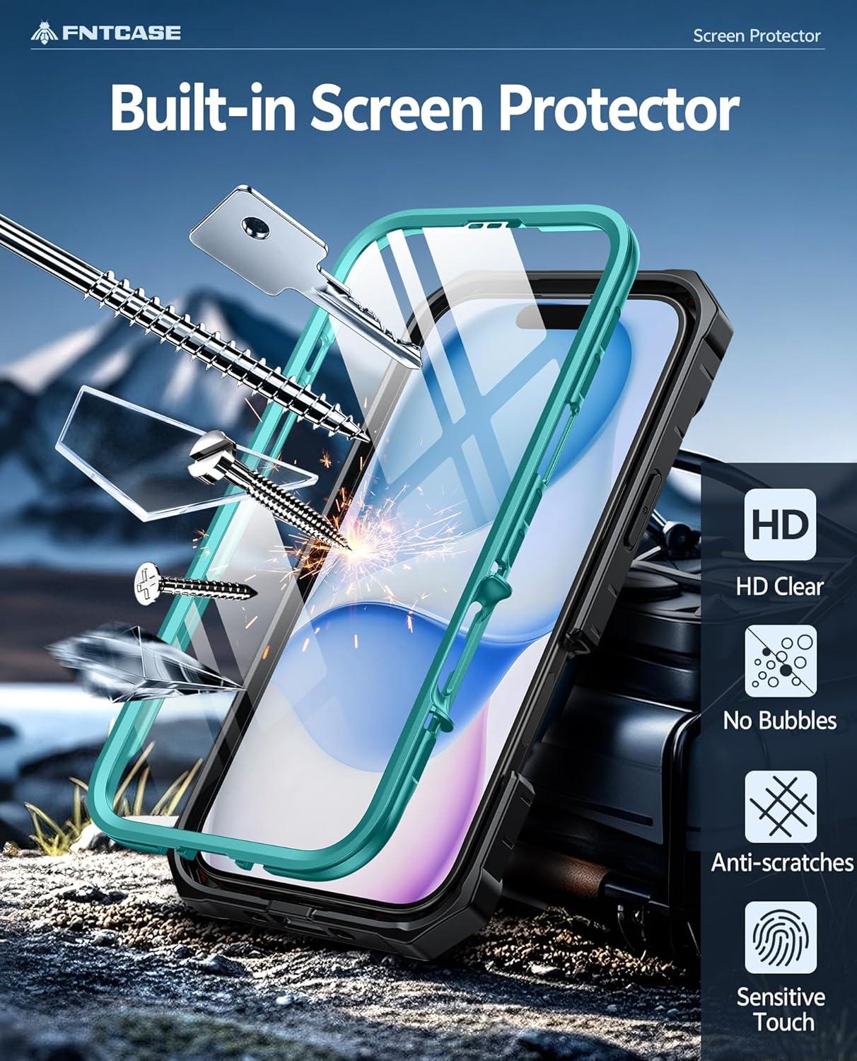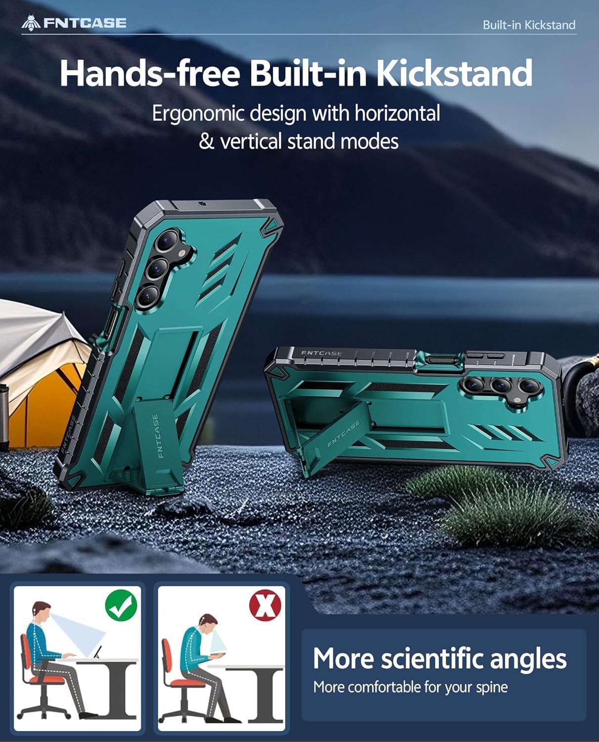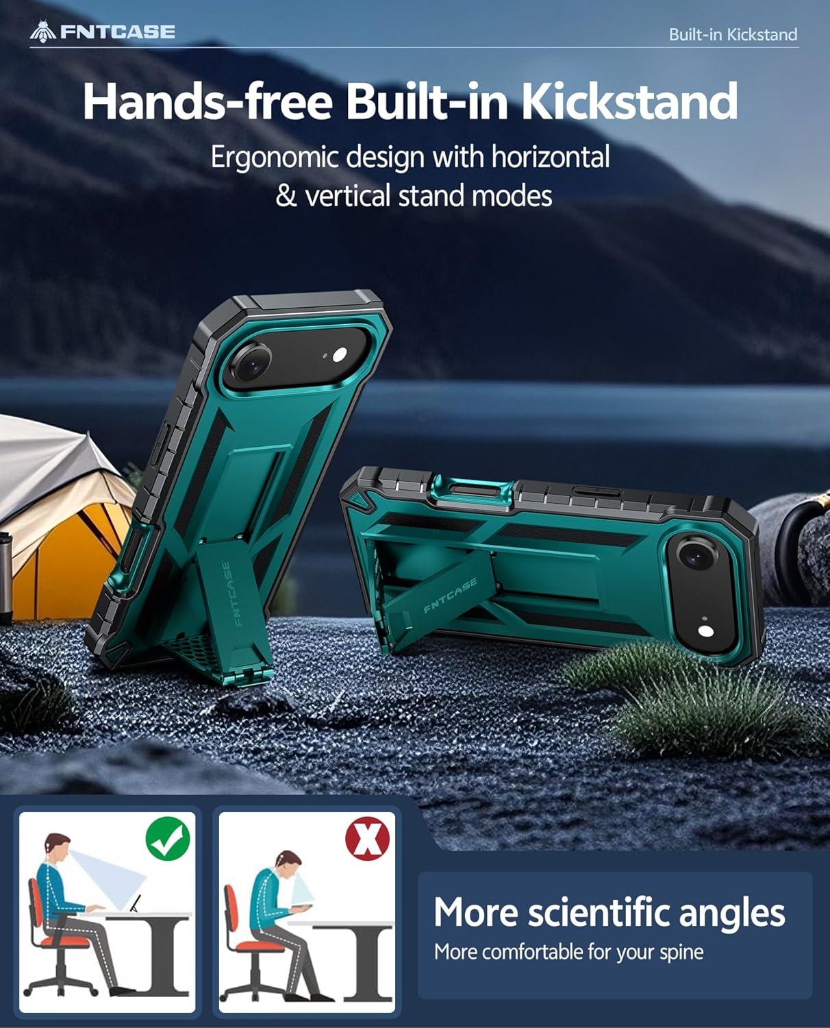 FNTCASE for iPhone 16e Phone Case: Military Grade [Built-in Screen Protector] [Kickstand] Matte Textured Drop Proof Protection Cover | Rugged Shockproof TPU Protective Sturdy Cases 2025 – Black(Green)