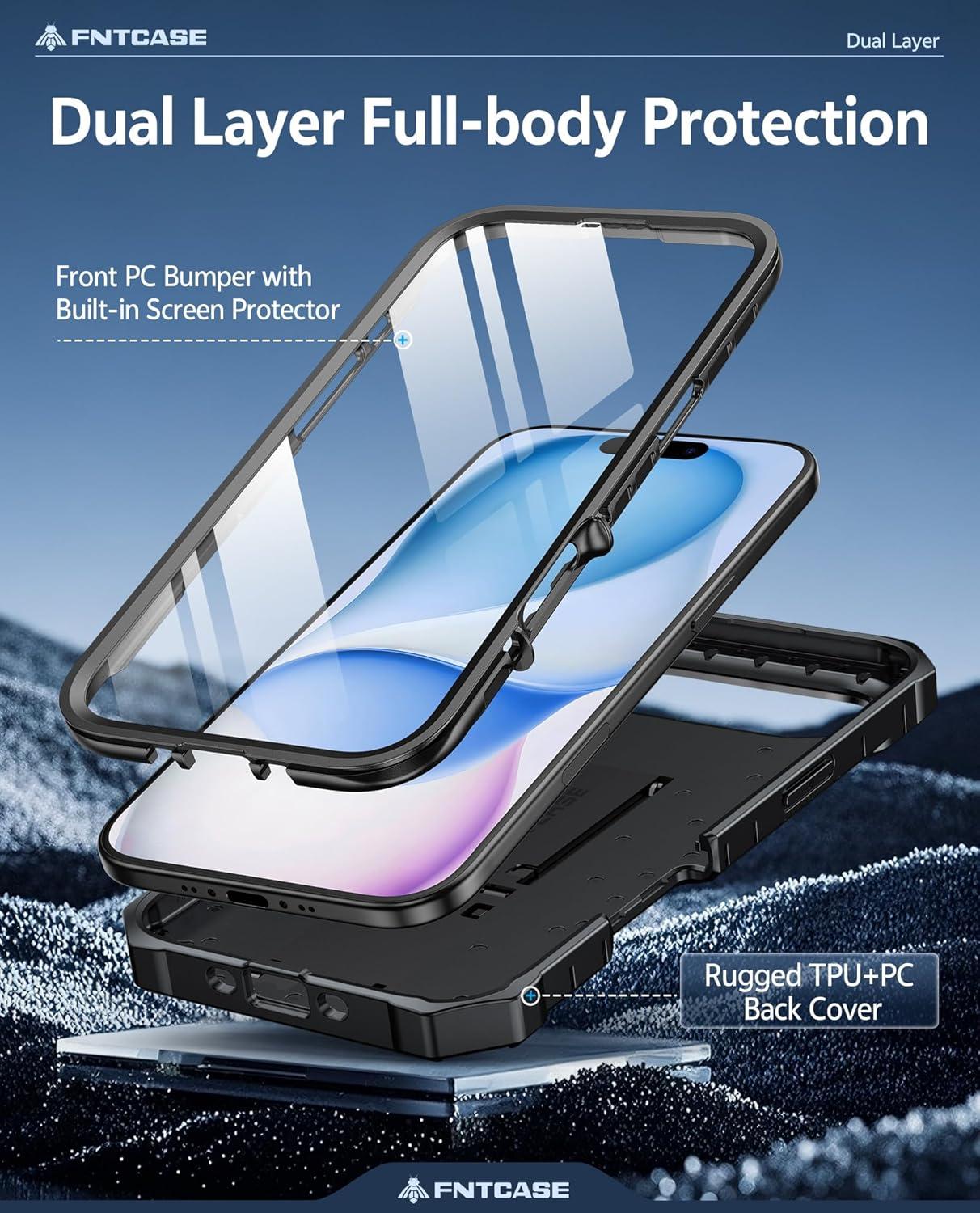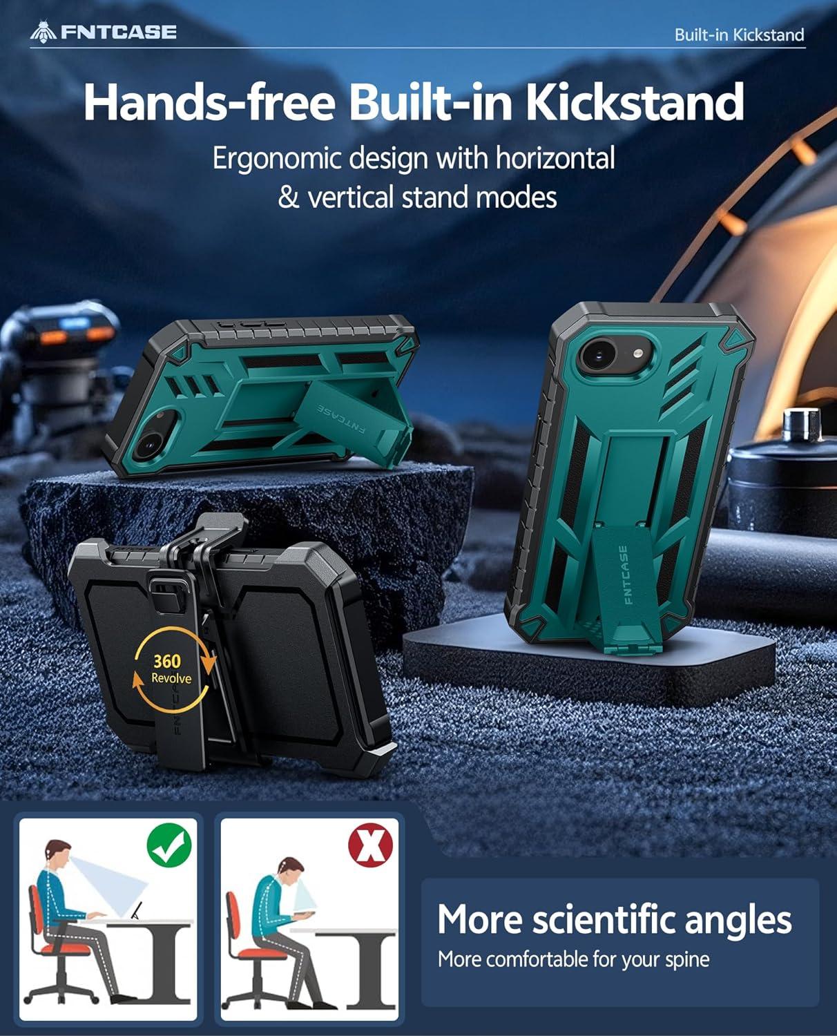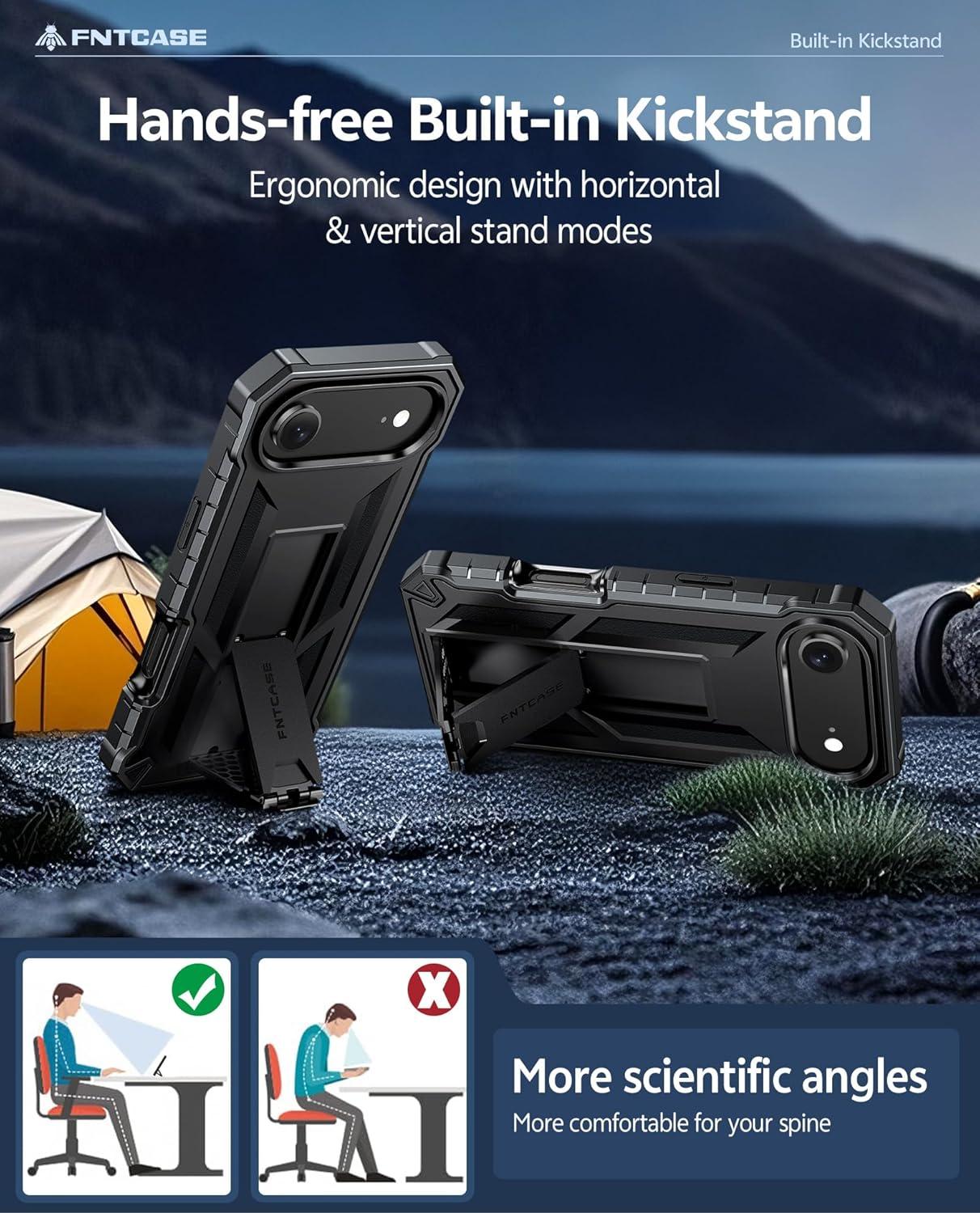 FNTCASE for iPhone 16e 2025 Case: for iPhone 16E Military Grade Rugged Phone Cover with Kickstand & Holster | Shockproof TPU Protection Bumper Matte Textured Design | Heavy Duty Protector (Black)(Black)