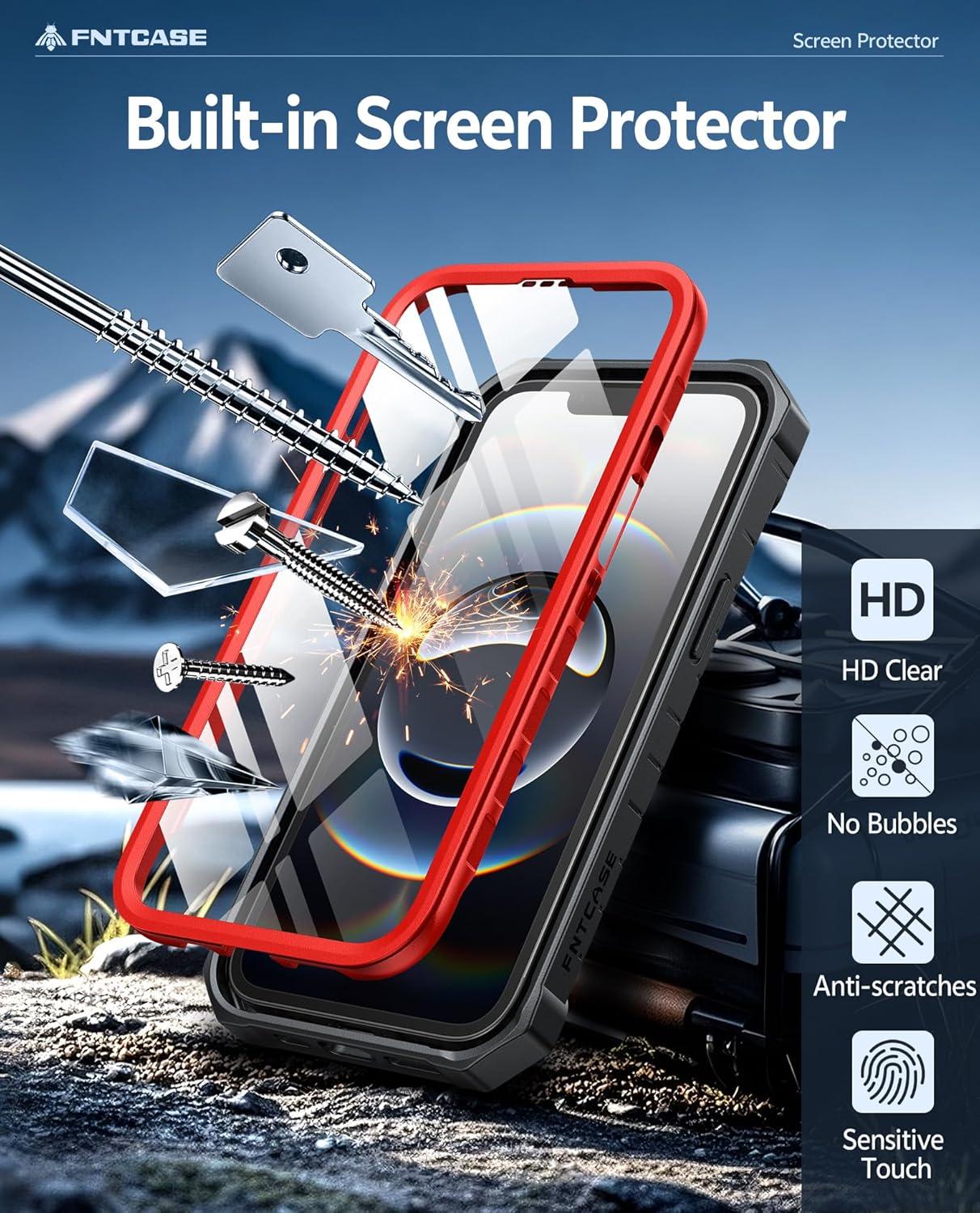 FNTCASE for iPhone 16e Phone Case: Military Grade [Built-in Screen Protector] [Kickstand] Matte Textured Drop Proof Protection Cover | Rugged Shockproof TPU Protective Sturdy Cases 2025 – Black(Red)
